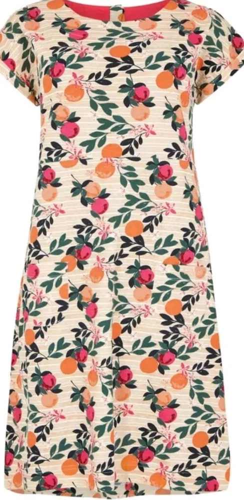 Introducing a brand new tunic dress from the popular brand Weird Fish. This knee-length A-line dress is made from 100% cotton jersey fabric, which guarantees a comfortable and breathable fit. Its multicoloured citrus fruit print is perfect for the summer season, while the round neck and short sleeves make it suitable for any casual occasion. Moreover, this dress features pockets, which is an added convenience for women on the go. Available in size 10, this tunic dress is perfect for those looking for a comfortable yet stylish outfit. Get this must-have item for your wardrobe today!