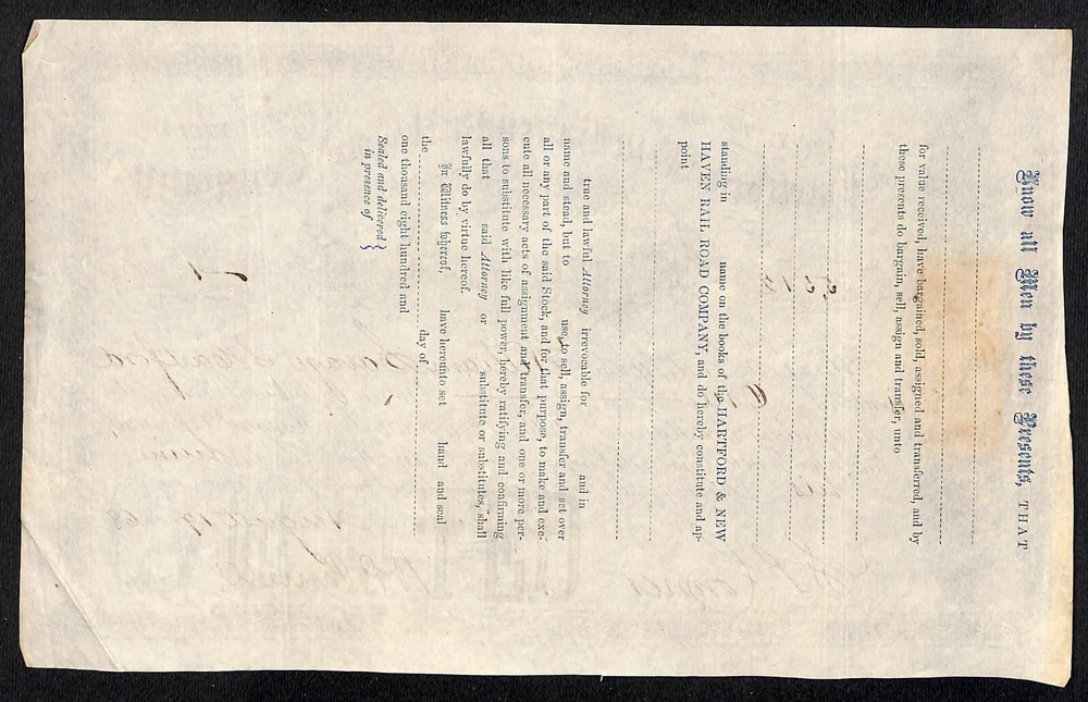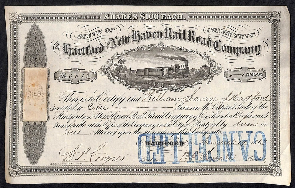 Welcome to my listing for: Hartford and New Haven Railroad 1868 Stock Certificate #5512 William Savage Showing only minor signs of wear and handling consistent with its age. No tears, losses or other major issues to note. Eye-catching illustrated locomotive & cars vignette of a locomotive traveling through town. Overall, in good to very good condition. Will display well in your collection. You will receive the exact certificate as seen in the photos. It measures approx. 6 3/8" x 10 1/4" This will ship securely in a poly bag, sandwiched with chipboard, inside a rigid mailer via USPS Ground Advantage service with a tracking number. The shipping cost for the first purchase is $4.00 and no extra cost for other additional items that can be shipped in the same package. I have over 39,000 unique items here on eBay - Click HERE to visit my eBay store & save with combined shipping for multiple buys: When possible, use the "add to cart" feature to select multiple items so the shopping cart can automatically combine shipping costs. If not, I will refund any amount over $4 paid for shipping (U.S. addresses only) I have enjoyed buying and selling great looking vintage quality collectibles for over 40 years. I hope that you enjoy them as much as I have while owning them. Unless noted otherwise, all items I offer here on eBay are original and are not reproductions. Please have a look the provided photos for condition as they are part of the item description and contact me with any questions BEFORE bidding or making a purchase. All items are securely packed and are shipped mostly via USPS. Please rely on my 25+ yr. 7,100+ 99.9% feedback rating as a guide to your buying decision. I hope that all is well with you and your family and thanks for stopping by! - Jerry