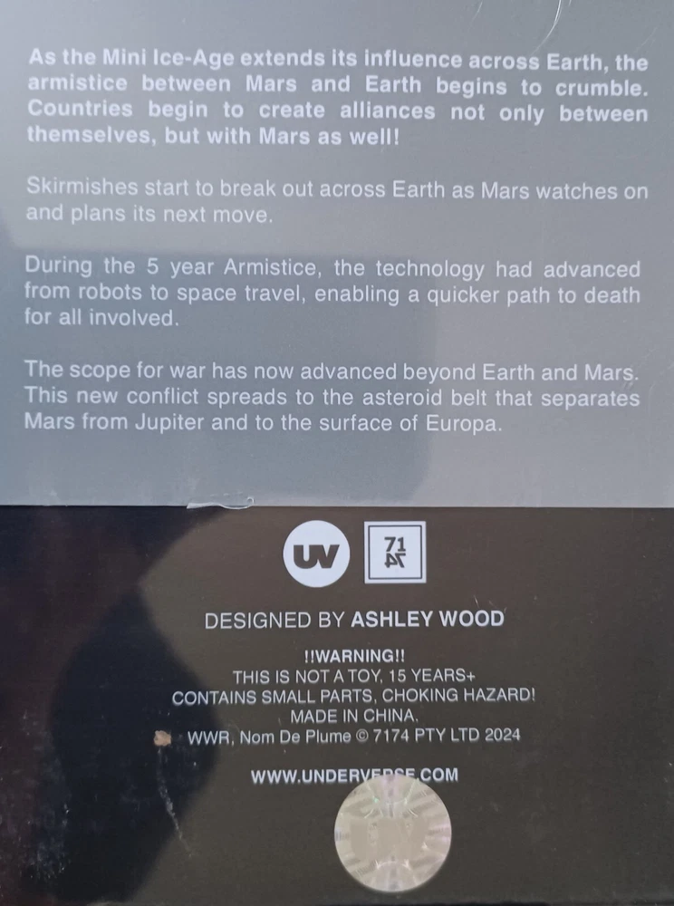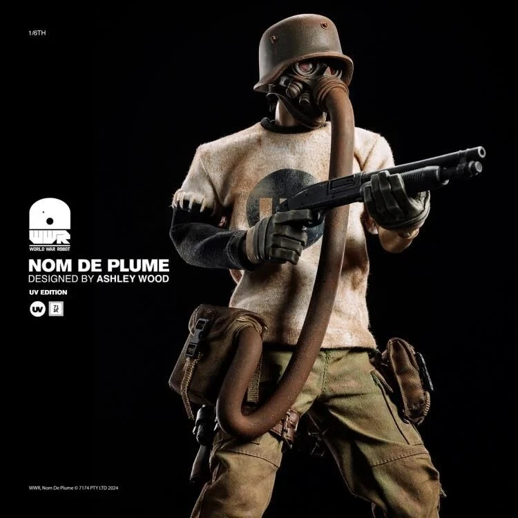 Product Features 1/6 Scale Made of ABS, POM, PVC, and fabric Part of the World War Robot series Designed by Ashley Wood 25 Points of articulation Custom-tailored clothing Stylized weather and paint detail Box Contents NOM De Plume figure 4 Pairs of hand parts Leather boots UV NOM T-shirt Breathing tube connection bag Military bag Military pants Bulldog shotgun NEMIZA scoped revolver Grenade Stand Product Description Underverse is excited to present its newest figure from the World War Robot 2 line, NOM De Plume! This 1/6 scale figure is highly detailed and features stylized weathered detailing as well as custom-tailored clothing. This figure also has 25 points of articulation, making it perfect for displaying however you want! Don't miss out on adding this figure to your collection!