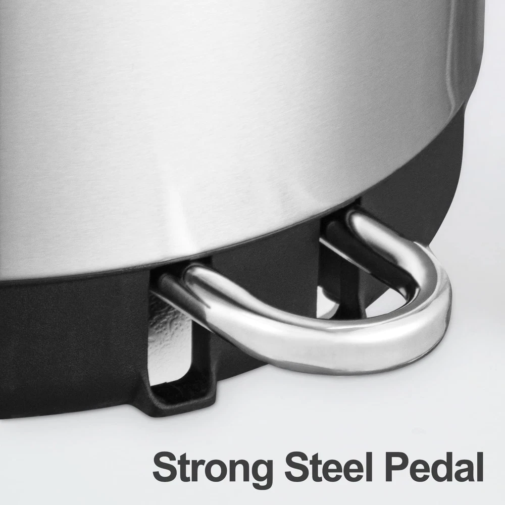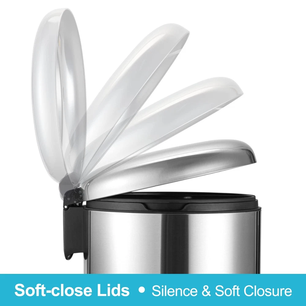 Dual Trash Can, 2 x 4 Gal Garbage Can, 2 Compartments, Steel Pedal, Plastic Inner Buckets and Soft-Close Lid, Round Stainless Steel Hands-Free Kitchen Recycle Bin Silent Close Lid: The soft-close lid ensures the environment remains peaceful, the design of internal hinge prevents the lid from bumping the wall. No loud slamming to be heard. Neat Kitchen Environment: The stainless steel material resists fingerprints and the spread of dirty things without dulling the natural sheen and luster of the steel. Bottom seal, enjoy a cleaner environment. Strong Steel Pedal: This kitchen trash can with strong steel pedal. It’s hard to open the lid of a rubbish bin with your hands when you are busy in the kitchen. The pedal-type garbage can solves this problem well, letting you have your hands free to tuck away your waste. Standing Function: While the manual cover opening angle is greater than 90 degrees, it's convenient for kitchen use or peeling. (Note: The cover cannot be opened for a long time when the foot is less than 90 degrees, and it can be opened and closed when the foot is pressed.) Dual Compartments Trash Can & Bucket in Bin: Double inner barrel design, dry and wet classification, recyclable and non-recyclable classification. The inner bucket has a storage hole. Put on the garbage bag(minimum 45cm opening, height 60cm) and roll the bag mouth to make it more stable.
