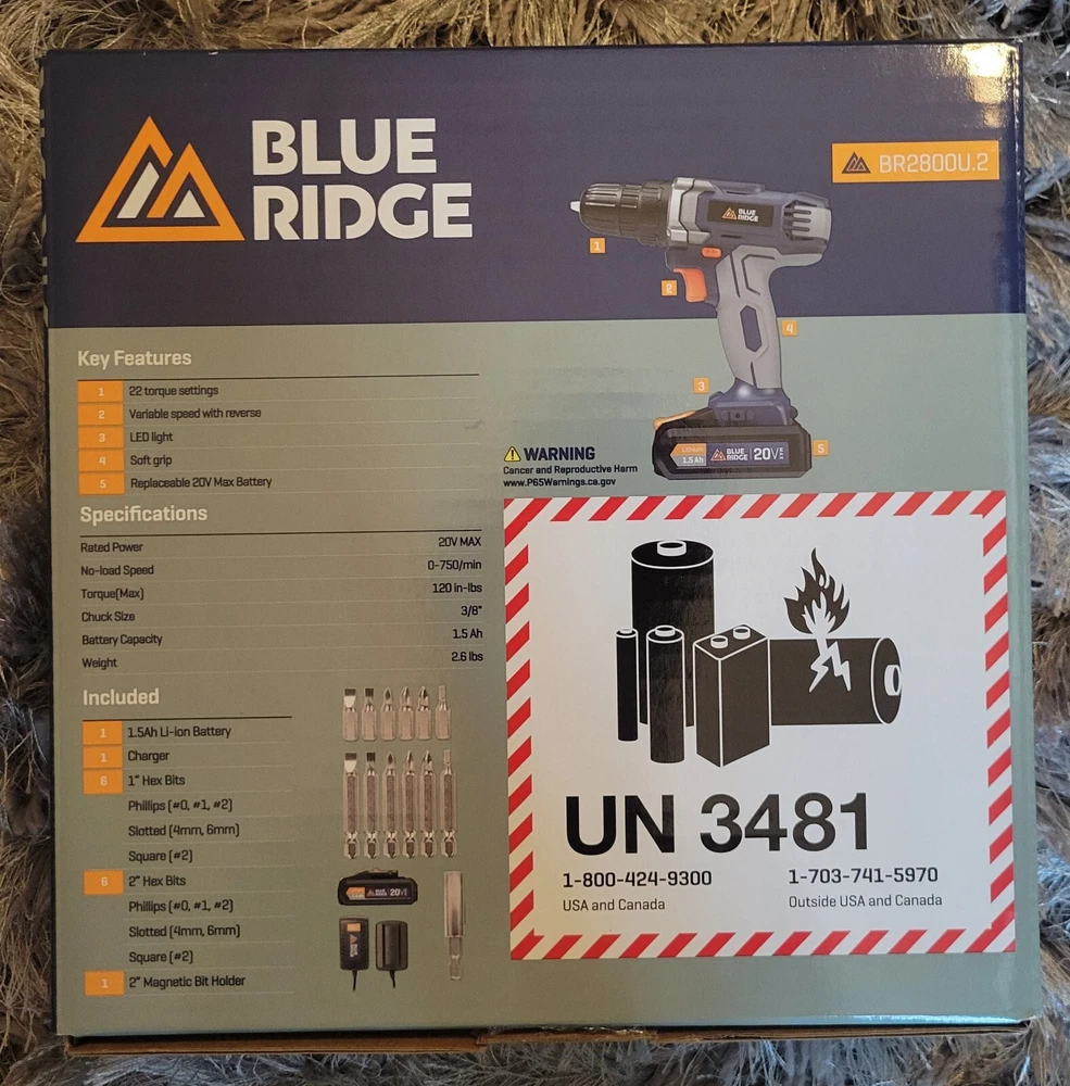 gtin13: 845534037319 Item Weight: 2.6 lbs Country/Region of Manufacture: China Battery Technology: Lithium-Ion (Li-Ion) Number of Batteries: 1 MPN: 78262220 Type: Power Drills Battery Included: Yes Set Includes: Drill Bits Battery Capacity: 1.5 Ah Maximum Torque: 120 in-lbs Color: Blue Manufacturer Warranty: 2 Years Material: Plastic, Metal, Rubber Voltage: 20 V Power Source: Battery Auxiliary Handle: No UPC: 845534037319 Chuck Type: Keyless Chuck Size: 3/8 in Brand: Blue Ridge Tools