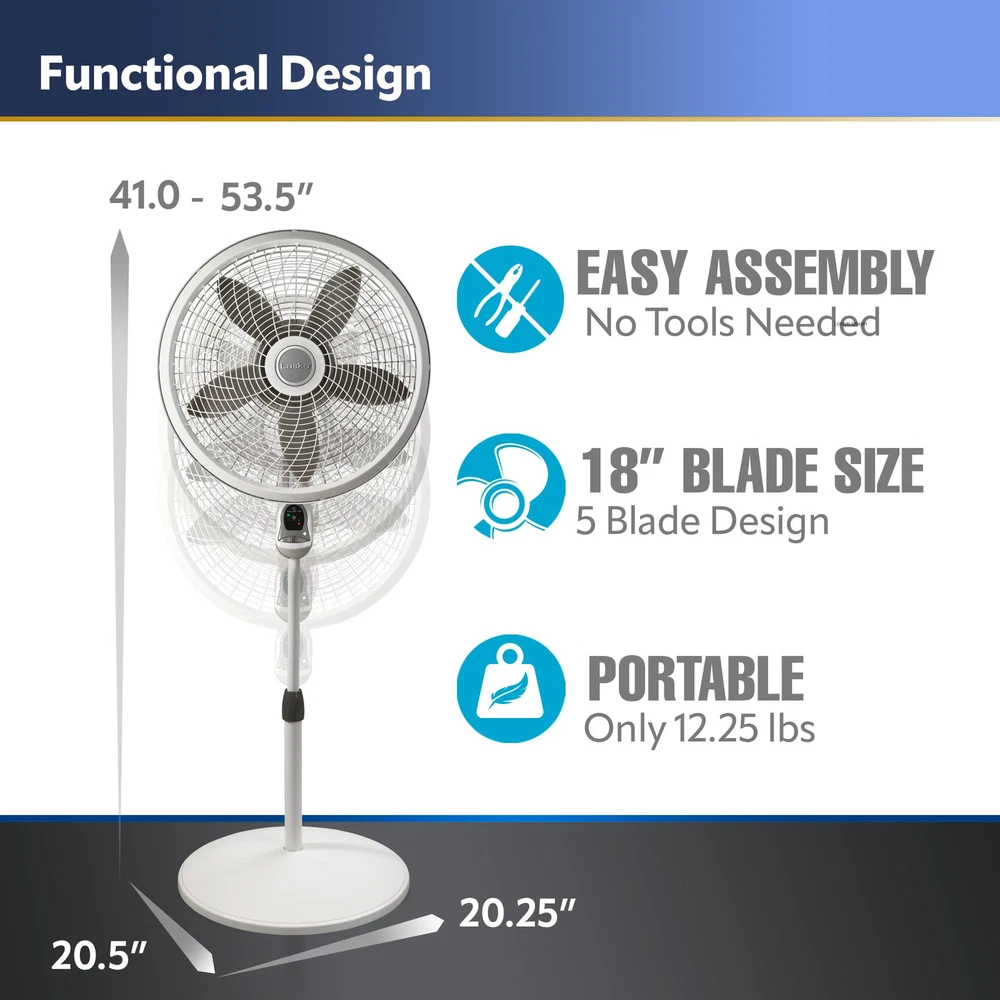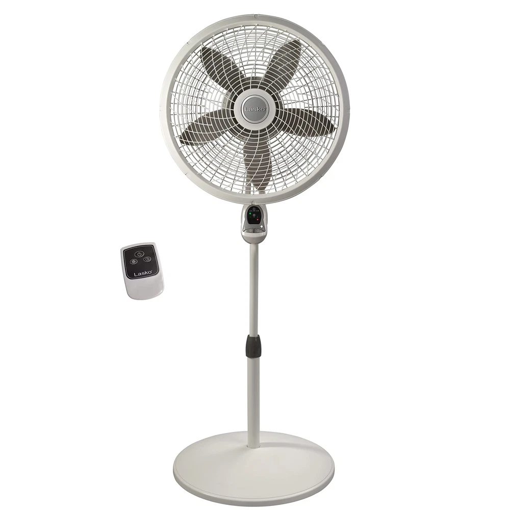 The Lasko 18" Cyclone Pedestal 3-Speed Fan will help you and your whole family stay comfortable in during warmer weather. It is designed to powerfully circulate air and create cool feel in larger rooms, like a living room or kitchen. This Lasko white pedestal fan features 3 speed settings that allow you to increase and decrease the airflow. It offers quiet operation and energy-efficient, superior performance. Featuring a tilt-back fan head, optional oscillation, and fully-adjustable height so you can easily direct the air where needed. This stand fan has an elegant grill and a sleek, space-saving design that will blend well with most any home decor. Easy to assemble and take apart for cleaning--requires no tools. To ensure utmost safety, this adjustable fan is E.T.L-listed and includes a fused safety plug. ✅【ADJUSTABLE SPEEDS SETTINGS】This Lasko white pedestal fan features 3 speed settings that allow you to increase or decrease the airflow according to your preferences. Whether you want a gentle breeze or a strong gust of wind, this fan has you covered. ✅【CUSTOMIZED COMFORT 】The fan's height can be adjusted from 41" to 53.5", making it perfect for any room in your home or office. Plus, the fan head can be tilted back to direct airflow where you need it most. ✅【WIDESPREAD OSCILLATION】With a 90 degree oscillation feature, this pedestal fan can cool down large rooms such as bedrooms, living rooms, and home offices with ease. It helps to circulate the air throughout the room, making it a great choice for larger spaces. ✅【AUTO-OFF TIMER】This fan features a 4-hour auto-off timer that allows you to set it and forget it. This is a great feature for those who want to fall asleep to the fan's gentle breeze but don't want it running all night. ✅【MULTI-FUNCTION REMOTE CONTROL】The included remote control operates this stand fan from a distance; easily turn the fan on and off, adjust the speed and set the timer from the comfort of your sofa