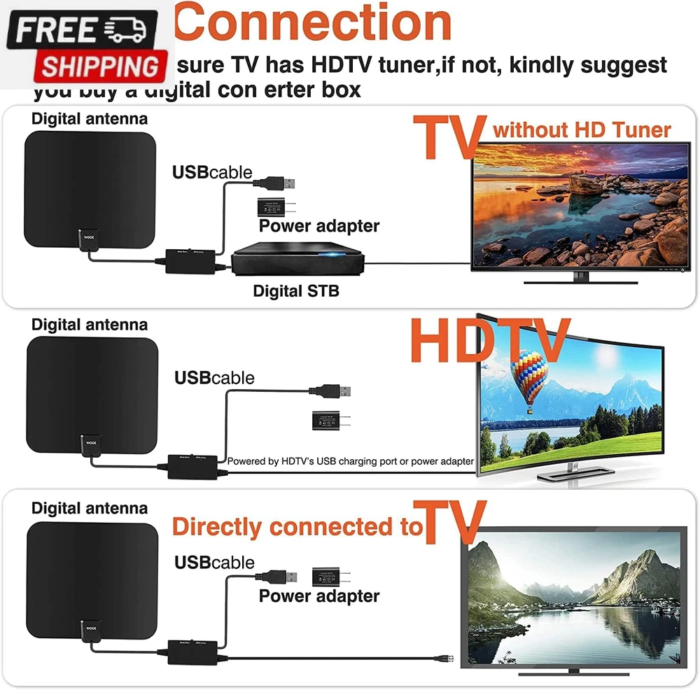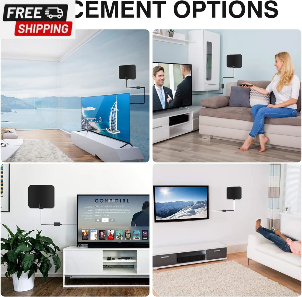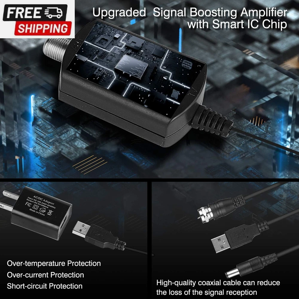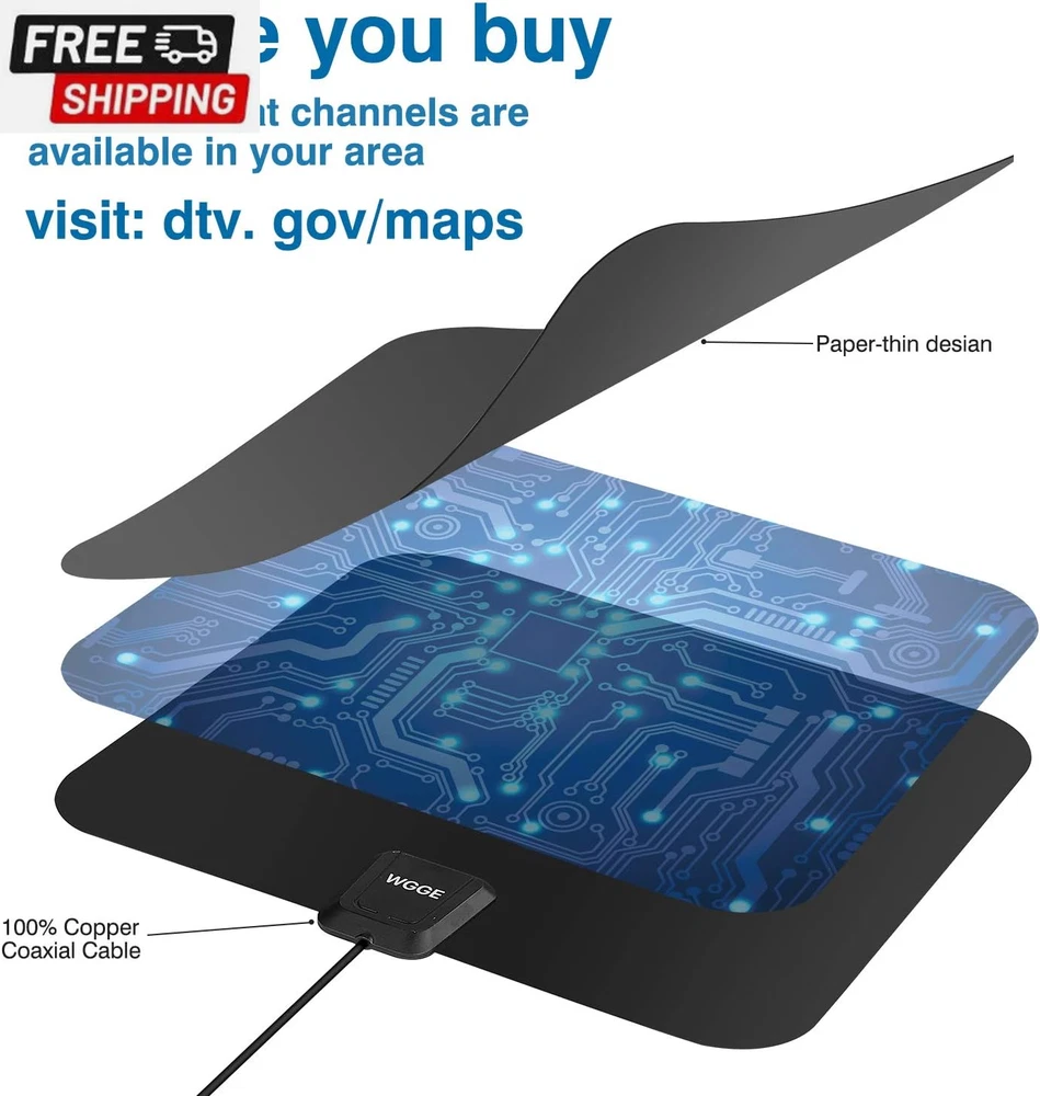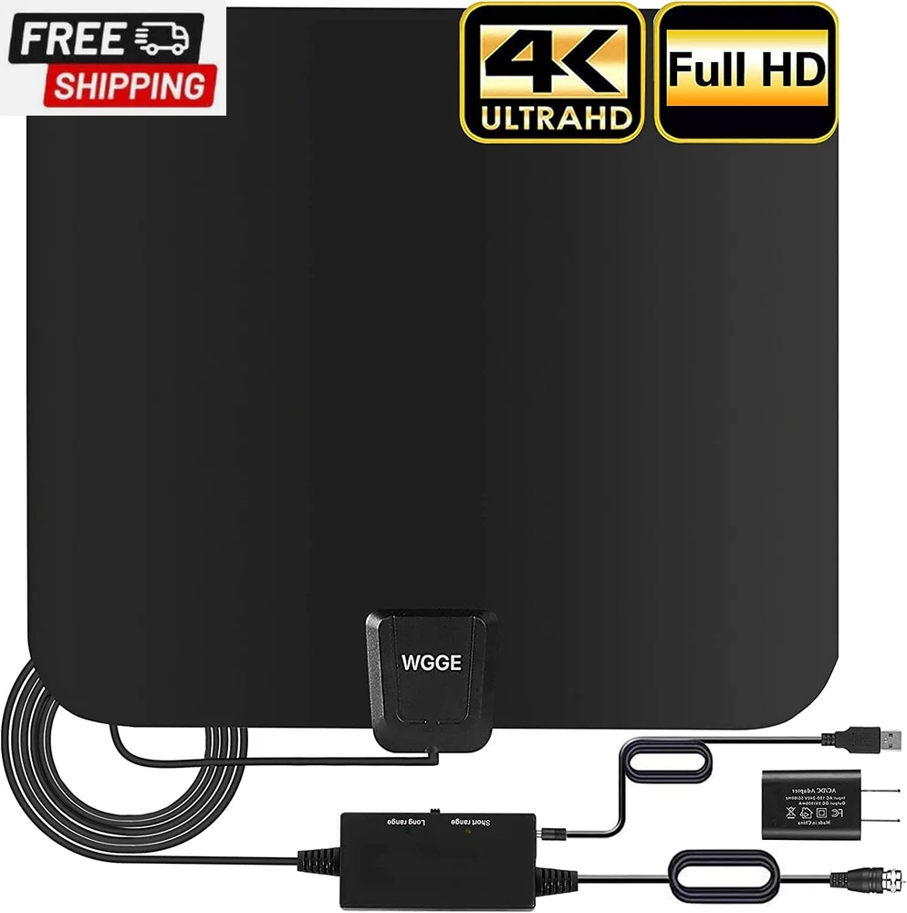 Amplified HD Digital TV Antenna Long Range 300+ Miles -Support 4K 1080P Fire Tv Stick and All Older Tv'S Indoor Professinal Smart Switch Amplifier Signal Booster - 17Ft Coax Cable/Ac Adapter FULL HD CHANNELS: With UPGRADED WGGE 2024 antenna no more need to pay a HUGE bill on TV. Our HD antenna can receive FULL HD Channels like ABC, CBS, NBC, PBC, Fox and SO MUCH MORE. With amplified tv antenna start to access all of the news, sitcoms, kids and sports programs! ADVANCED TOOL FOR LIFE TO RECEIVE THE CHANNEL WITHOUT MONTHLY BILL! 300 MILES RANGE: The indoor HDTV antenna can reach up to 300 miles and can be placed almost anywhere in your Home. Digital antenna constantly scans for new channels as they're made available for broadcast. Hang the indoor antenna on a window or wall, or better position where owns better reception of your House. FUHD CRYSTAL-CLEAR TV & HD SOUND QUALITY: WGGE smart tv antenna adopts upgraded with new Generation Smart Switch control Powerful Amplifier Signal Booster with built-in Smart IC Chip Next generation & Crystal Clear Filter Technology to picks up signals within 300 miles range. The new technology filters out cellular and FM signals resulting in clearer picture, low noise and access to more free broadcast TV signals with enhanced gain, range and frequency performance. 17 ft Coaxial Cable &USB Power Adapter: Digital TV Antennas Include Standard Coax Cables With Stronger Copper Wiring This Coaxial Cable of Durable Construction Removes Signal Interference Bringing Superior HD Reception And Powerful Signal Reliability Smart USB Power Adapter With Built-In Overvoltage Protection Will Help You If there Is Not USB Output For Connecting TV Antenna To The Power Supply Note: Please remember to re-scan for channels after moving the Antenna. Please switch the amplifier to "short range" if your house is very close to the broadcast tower (within 35 Miles).roduct, 12 months manufacturer warranty and 24/7 hours WGGE customer service High-quality product, 12 months manufacturer warranty and 24/7 hours WGGE customer service Product Description FULL & 4K HD Quality For flatscreen HDTVs, please check the TV's manual to make sure the TV has a built-in tuner for receiving over-the-air broadcast, and make sure this tuner can receive HD signals or else it will not be able to receive and watch HD channels. Antenna signal strength can vary depending on distance from the tower, terrain, and weather. Get more channels Experiment with different locations in your home. Face your antenna towards the TV transmitter towers. Move it higher up as possible. Move it outside can help you get more channels possibly. Re-Scan the channel regularly, you may get more Channels TV antenna Range Please first visit antennaweb or antenna point to check how many broadcast towers surrounding. The actual receivable range may highly dependents on your distance and location. Areas with large obstructions such in valleys, mountains,etc,. will reduce effective range. Easy set up the device Shipping Fast shipping is very important for us. Our standard US shipping service is FREE. Your order will be shipped within 2-3 business days upon full payment received. Your order will be delivered within 2-3 business days after the handling time. We only ship to the confirmed PayPal address. We reserve the right to cancel any order for any reason at any time. We are not responsible for undeliverable addresses. Returns and payment We offer a 30 days return policy from checkout winning date. We allow only PayPal as payment method FeedBack Your feedback very important to us, after you get your package and you are satisfied with our service please leave us positive feedback If you have any problem with your order / any questions please before leave any type of feedback For any questions, using eBay contact system Please visit our eBay store to check out other items for sale! Thank you for shopping at our store.