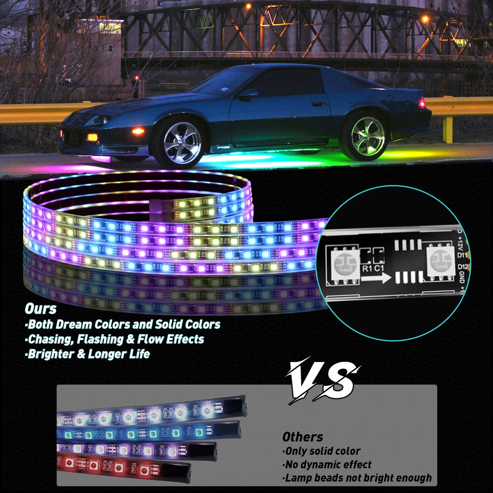 About this item: High quality: 4PCS Car Underglow Lights are made of high brightness SMD 5050 LED chips , 3 In 1 RGB Chips with flexible PVC rubber; Waterproof, Robust, Rust-proof; and our LED under car glow system can be connected to any DC 12V USB port; Not only suitable for Car exterior, But can also motorcycles, boats, trucks, TV lighting, Home, KTV, Party decortaion, etc. Control Modes: 17 keys remote control, APP control will help you avoid connecting issues, which you can use them to adjust the change speed, brightness and stroboscopic speed. The car underglow strip lights for car led lights exterior is built-in sensitive mic, which make it glow and dance to the rhythm of your music, enjoy every driving! Dream Color Chasing lights: The Undercar Strips Lighting Kits built-in Kinds of Color Chasing Modes looks like recurrently chasing, skipping, dancing, twinkling on the strip. You can make your favorite chasing lights effect underglow the car or DIY a static color for lighting. Increase the safety of driving during the day and night and the appearance of the vehicle. Easy installation: Flexible LED RGB Chassis strip lights can be bended easily, strong 3M adhesive, additional zip ties and screws equipped definitely hold it on place firmly. DC12V , IP67 waterproof, Never worry about the safety of the Car bottom light. You can install them in your car with flexibility. Package includes: 4 x Car Underglow Neon Accent Strip lights 1 x Remote Control 1x Control Box & Wiring On Nov 12, 2024 at 00:11:07 PST, seller added the following information: