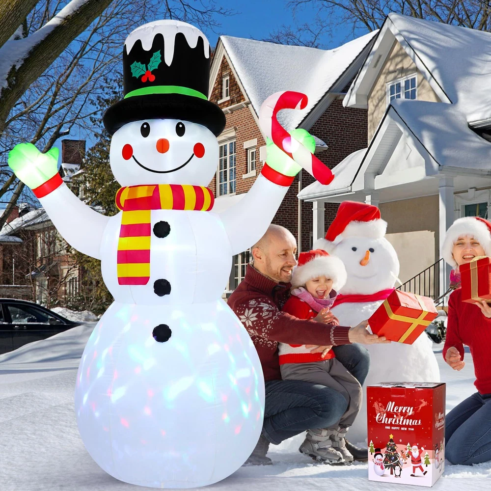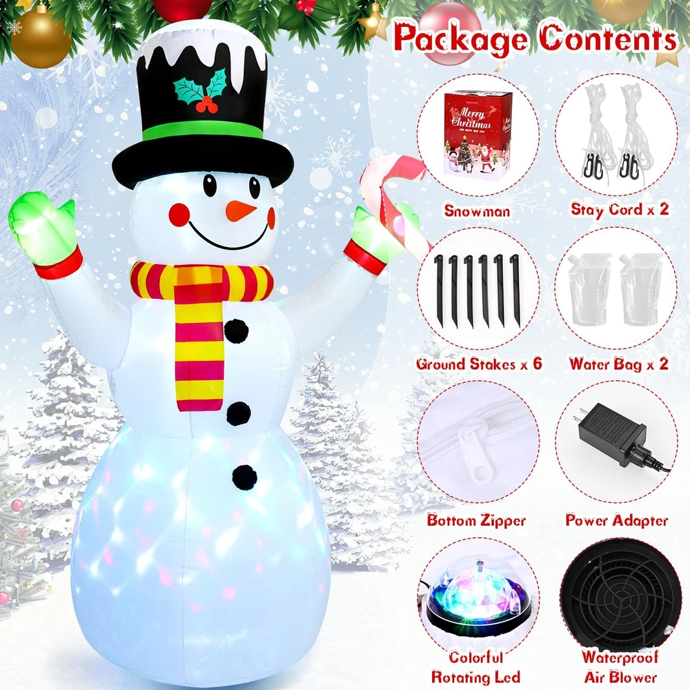 Christmas Yard Decoration: This 7 ft Christmas inflatable decoration is wearing a cute top hat and scarf, holding candy canes in his hand, with a happy smile on his face, extending his arms as if giving you a comfortable hug.This snowman inflatable brings a strong Christmas atmosphere and makes your family have a charming and enjoyable holiday time. Durable and Safety: This Christmas blow up yard decoration is made of thickened polyester fabric, which is not only more waterproof, wrinkle resistant, fade resistant, but also improves the tightness of the product and makes its service life longer.And the power plug is UL certified to ensure the safe and reliable operation of the product. Stable Use: The Christmas inflatable outdoor decoration is equipped with 6 ground inserts, 2 water bags, 2 pull strings. These accessories can effectively prevent the gingerbread man inflatable from being blown away when placed outdoors, making the product more stable. LED Lights & Scenes: Rotating magic colorful led lights are installed inside the inflatable Christmas decorations. When the power is connected, it will light up your night, bringing you a good Christmas atmosphere and attracting everyone's attention. The 7 ft Christmas inflatable is suitable for living room, garden, yard, party, doorway, patio, hallway, etc. Fast Inflating & Convenient Storage: This blow up Christmas decoration outdoor comes with an air blower that allows for quick and effortless inflation.After the holidays, simply deflate, fold, and store it in the included space-saving box for easy reuse next year.Note: Close the bottom zipper when inflating, and make sure that there is no obstruction at the blower.