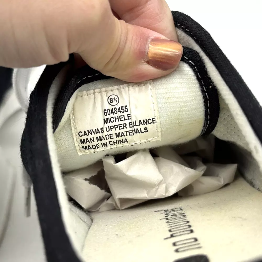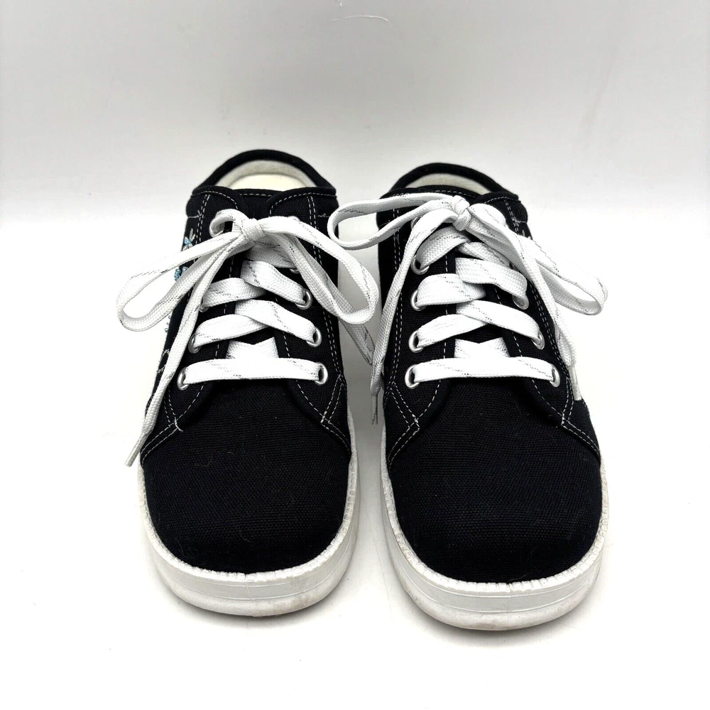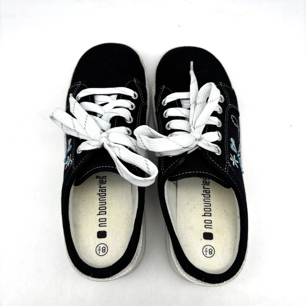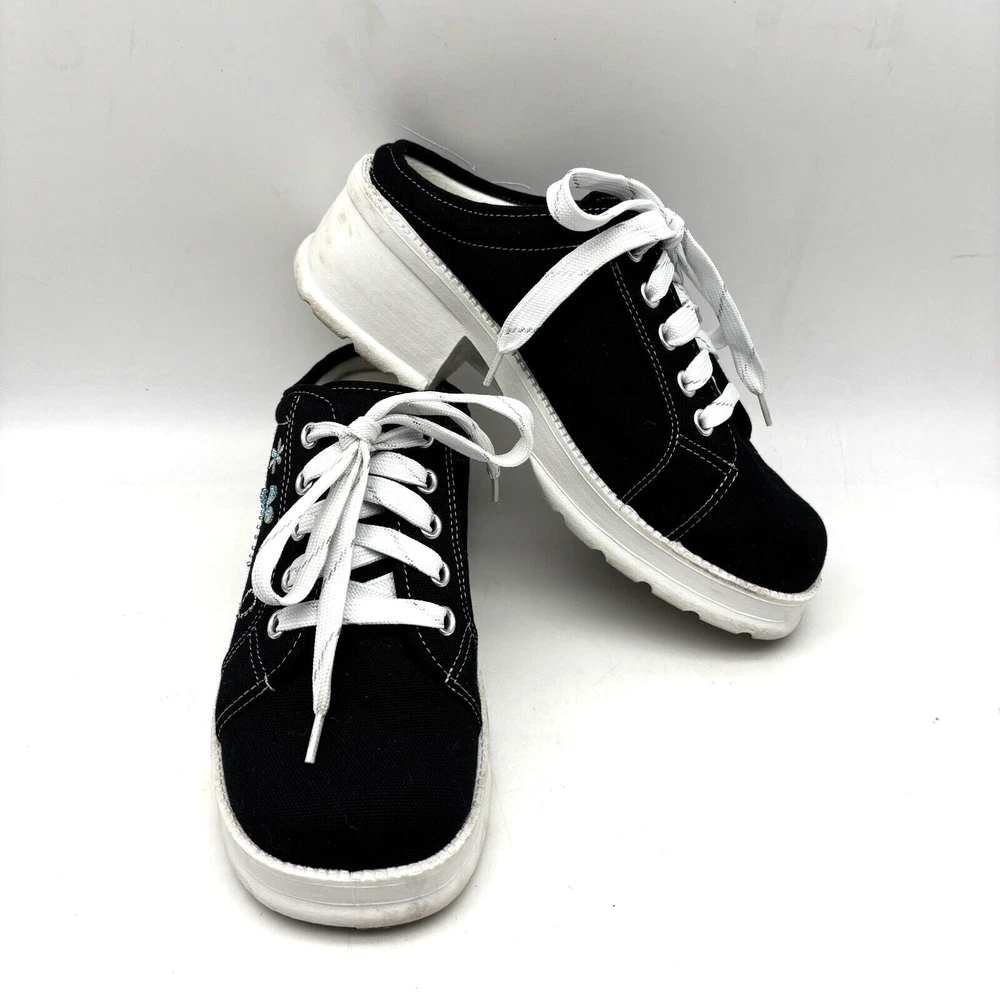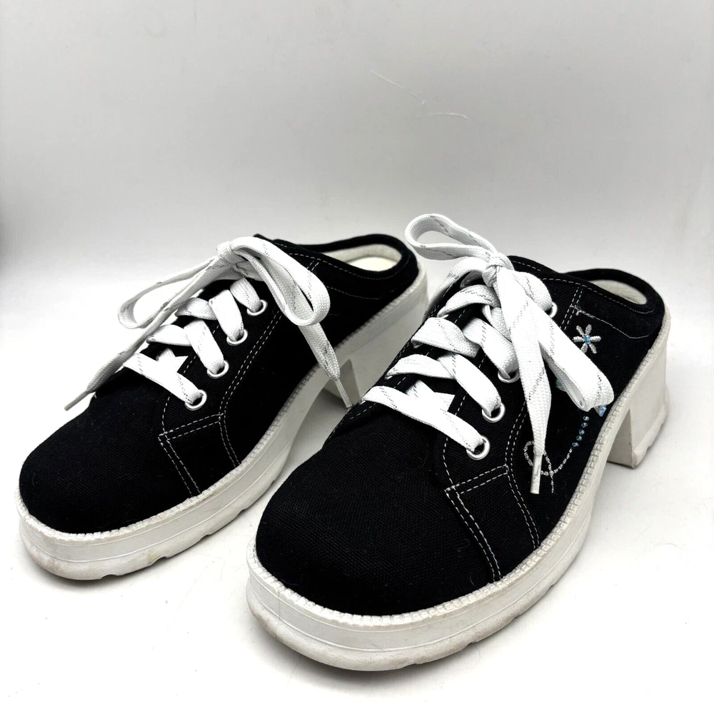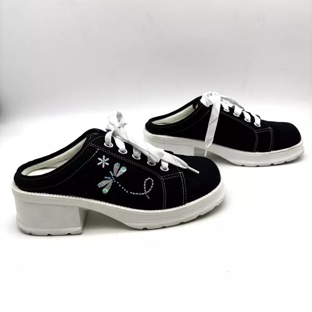 Vintage 90s Y2K No Boundaries Platform Sneakers Model: MICHELE Black Canvas Upper Lace Up Slip On Open Back Round Toe Block Heel Metallic Silver Embroidered Beaded Dragonflies on Sides Shoe Width: Standard 2.5" heel 1" platform Women's Size US 8.5 UK 6.5 EU 39 Great vintage pre owned condition. Gently owned. Mild wear on soles - shown in photos. Otherwise, no rips, tears, stains, holes or other notable flaws. Clean and from a smoke free home.