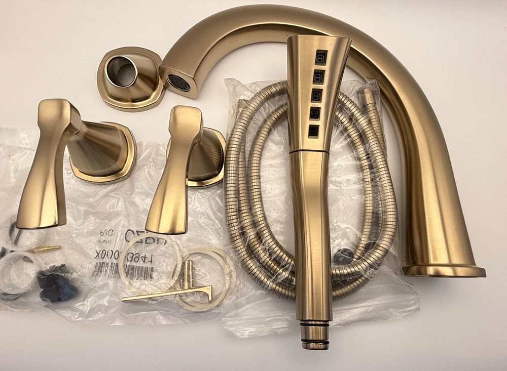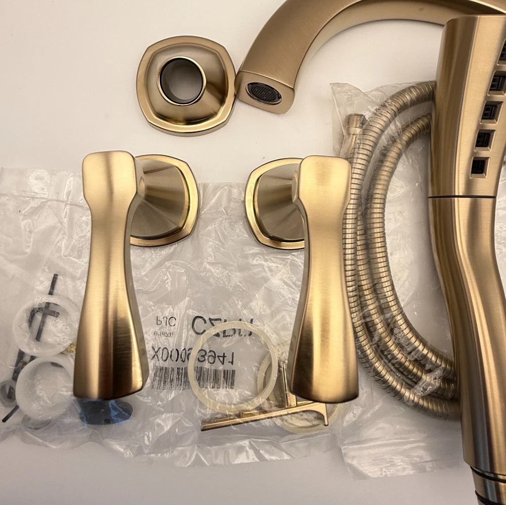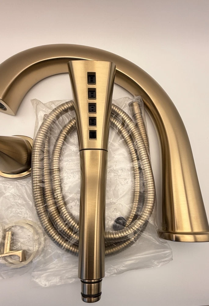 Delta Faucet Stryke Roman Tub Faucet - T4777-CZ - Bathtub Handles, Faucet & Diverter - Modern Bathroom Fixtures - Champagne Bronze, Lever Handles (Valve Sold Separately) Discover the perfect blend of style and functionality with the Delta Faucet Stryke Roman Tub Trim Kit. Designed to create a striking aesthetic in your bathroom, this trim kit features a gracefully arched spout and sleek, ADA-compliant handles that bring a touch of modern elegance to any space. The hand shower included offers versatility and ease, allowing you to direct water exactly where you need it. It's ideal for rinsing off, bathing children, washing pets or simply keeping your tub pristine. This tub faucet not only enhances the visual appeal of your bathroom but also offers a water-efficient solution without compromising on performance. Thanks to the innovative H2Okinetic hand shower, you'll experience the sensation of more water while actually using less, making it a smart choice for the eco-conscious homeowner. The hand shower's unique wave pattern ensures a powerful drench spray, providing a luxurious and invigorating bathing experience every time. This trim kit is thoughtfully engineered for a seamless installation. It is designed to fit 4-hole installations with 8–16 inch configurations, giving you the flexibility to upgrade your bathtub's faucet and handles with ease. Please note the R4707 rough-in valve is required and sold separately. Embrace the sophisticated design and superior quality of the Delta Faucet Stryke Roman Tub Trim Kit as it transforms your bathing ritual into a spa-like escape within the comfort of your own home. At Delta Faucet, our mission is to help you make lasting changes in your home and help change the way you interact with water. From human-first innovations to unforgettable design, our faucets, showerheads and beyond aim to make every moment you spend in your kitchen or bathroom one worth remembering.