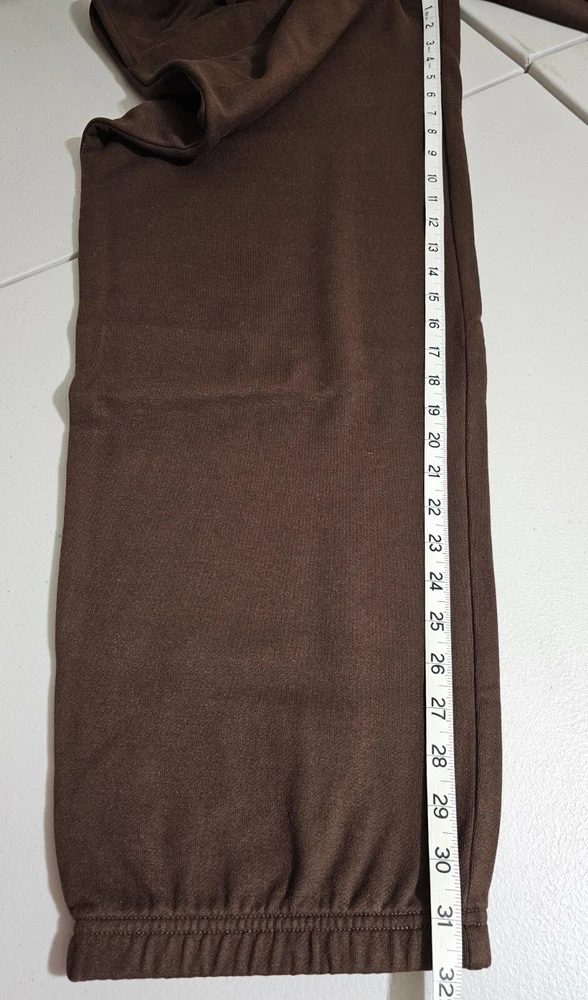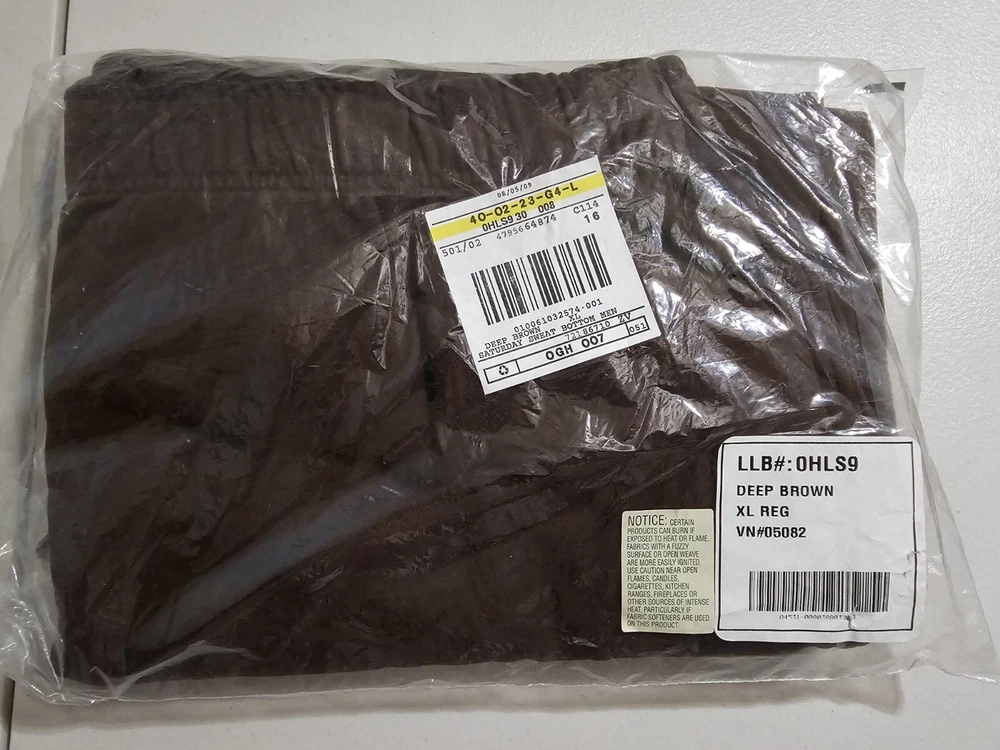 Men's LL Bean XL Deep Brown (The brown is darker in person than my photo shows) sweatpants with side pockets and elastic with drawstring waist. The legs have elastic at the ankles. 88% Cotton 12% polyester New in package. I removed it from the package to measure and take pictures. Measurements: Waist : 36" Inseam: 32" Measured lying flat. Waist is elastic with drawstring, so it can accommodate a little range in sizing. Returns accepted within 30 days in same condition as purchased. Buyer pays return shipping. Shipping: I'm packing this tightly in a Priority Mail to save on shipping