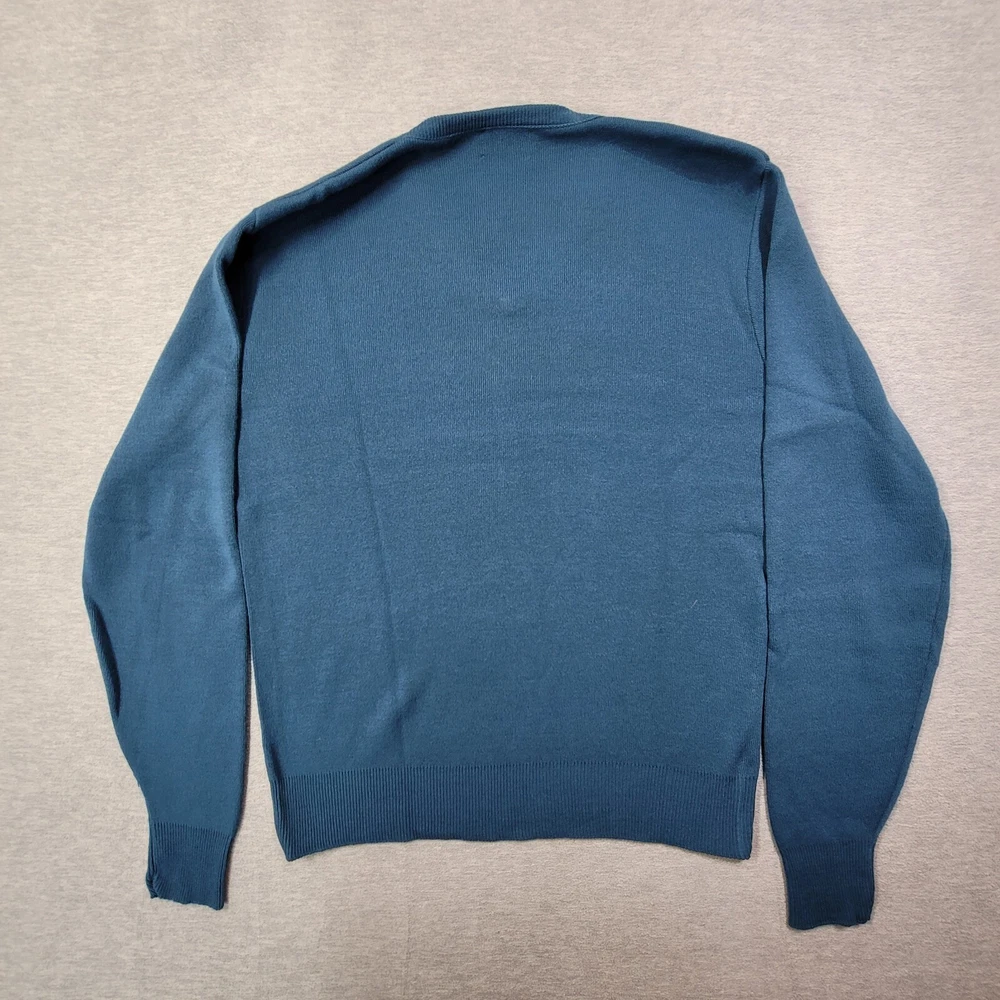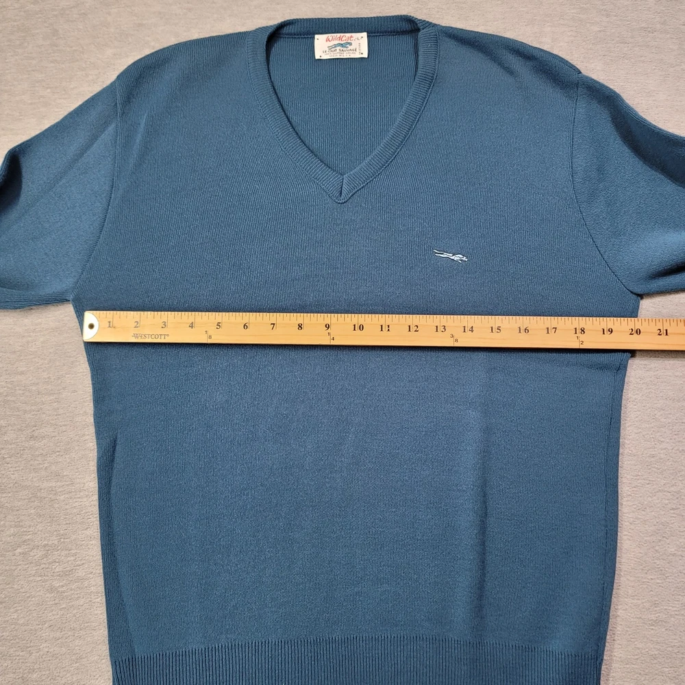 This vintage Wild Cat sweater is a must-have for any fashion-savvy man. Made in the USA, this pullover features a classic fit with a V-neckline and long sleeves. The blue color and solid pattern make it a versatile addition to any wardrobe. Crafted from high-quality cotton knit fabric, this sweater is both comfortable and durable. The Wild Cat logo accents the design, adding a touch of style and sophistication. Perfect for any occasion, this sweater is a timeless piece that will never go out of fashion.