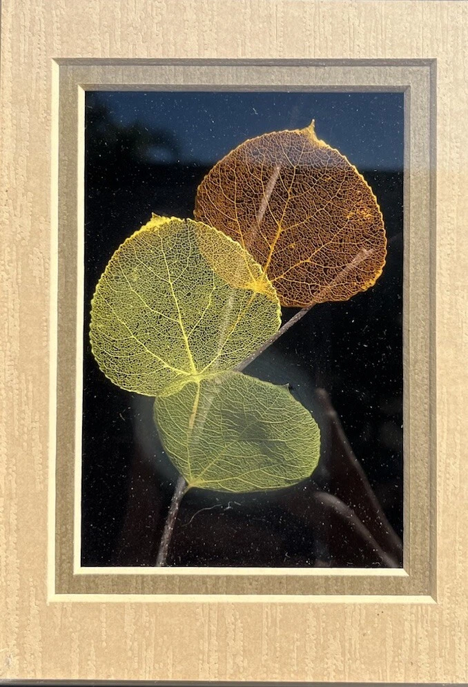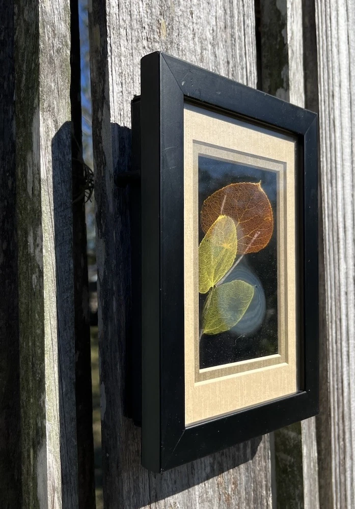 This is an original hand-etched Leaf Line Shadow Box created by artist Booker Morey in 1997. The small glass artwork features a nature theme with leaves in a 3D collage style, framed and signed by the artist. It measures 6 inches in length, 8 inches in height, and 1 inch in width. The piece is one of a kind and includes a Certificate of Authenticity. Made in California, USA, using mixed media techniques.