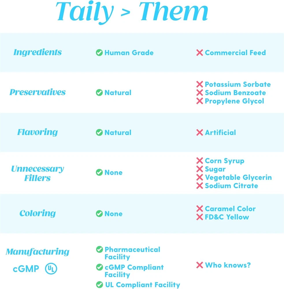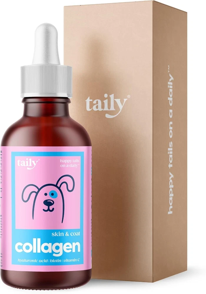 Skin and Coat Supplement for Dogs, Cats | Taily Liquid Collagen Dogs | x Product Details Item Weight: 4 ounces Manufacturer: Taily LLC Item model number: 01 Item Package Dimensions L x W x H: 5.75 x 2.76 x 2.01 inches Item Dimensions LxWxH: 2 x 2 x 4.5 inches Item Weight: 4 Ounces Brand Name: Taily Target Audience Keyword: Dogs, dogs Directions: Dogs 26-50 lbs = 2.0mL, Dogs 11-25 lbs = 1.5mL, Cats 0.5 mL per 5 lbs of body weight once per day., Start with half the recommended amount and gradually increase to the dosage below. For best results, give daily. Dogs under 10 lbs = 1mL, Dogs 51+ lbs = 3.0mL Model Name: 01 Color: x Age Range Description: All Life Stages Included Components: 1 mL Dropper Specific Uses for Product: Nails, Skin, Joints, Coat Product Dimensions : 2 x 2 x 4.5 inches; 4 ounces Item model number : 01 Manufacturer : Taily LLC Brand: Taily Flavor: Skin and Coat Supplement for Dogs, Cats | Taily Liquid Collagen for Dogs | Itch Relief for Dogs with Allergies, with Grass Fed Collagen, Biotin, Vitamin C and Hyaluronic Acid | Made in USA Skin and Coat Supplement for Dogs, Cats | Taily Liquid Collagen for Dogs | Itch Relief for Dogs with Allergies, with Grass Fed Collagen, Biotin, Vitamin C and Hyaluronic Acid | Made in USASkin and Coat Supplement for Dogs, Cats | Taily Liquid Collagen for Dogs | Itch Relief for Dogs with Allergies, with Grass Fed Collagen, Biotin, Vitamin C and Hyaluronic Acid | Made in USA See more Item Form: Liquid Target Species: Dog Premium Liquid Collagen for Dogs & Cats: Our advanced formula combines the power of Grass-Fed Collagen Peptides, Biotin, Vitamin C, and Hyaluronic Acid to promote your furry friend's skin and coat health. Shiny, Bright Coat: Say goodbye to dull and lackluster fur! Our liquid collagen supplement helps enhance your pet's coat, making it shinier and brighter. Soft, Flaky Skin Relief: No more itchiness or flakiness! Our product moisturizes and nourishes your pet's skin, promoting a soft and smooth texture. Stronger Nails: Watch your pet's nails grow stronger and healthier with regular use. Say goodbye to brittle nails and hello to paw-perfect strength. ⚕️ Veterinary Recommended: Our liquid collagen supplement for pets is trusted and recommended by veterinarians, ensuring that you are providing your pet with a reliable and effective solution for wound healing and injury recovery. Made in the USA with Care: We proudly manufacture our pet supplements in the USA, adhering to strict quality control measures to ensure that your pet receives a safe and effective product that meets the highest standards of quality and purity.