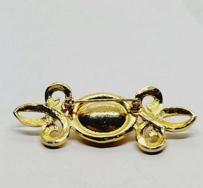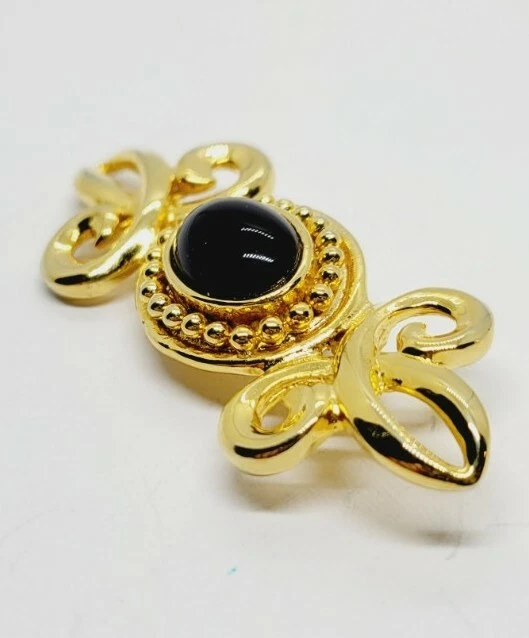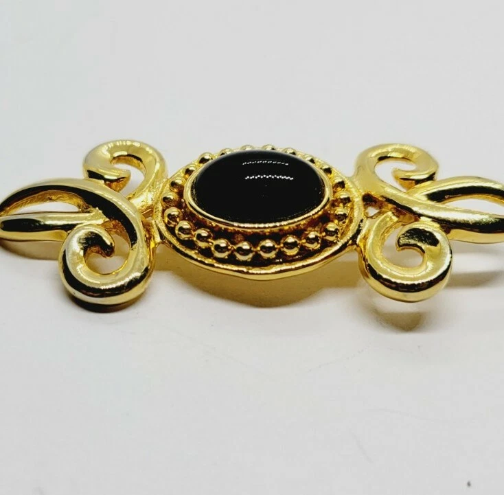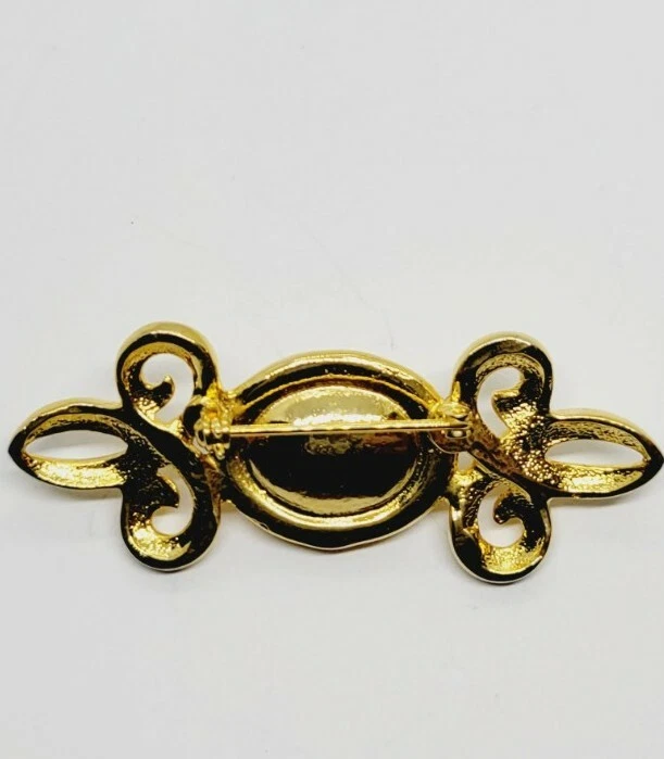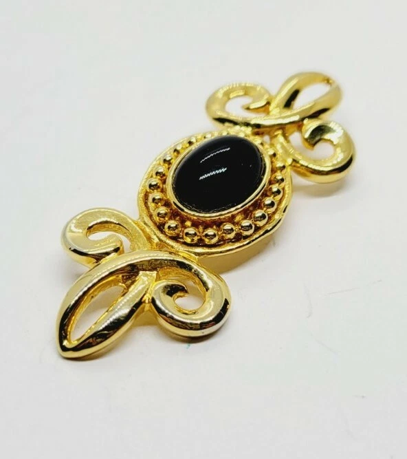 Main Stone:Faux Black OnyxType:BroochMaterial:MetalCountry/Region of Manufacture:UnknownMetal Purity:UnknownItem Length:1" x 2.5"Base Metal:UnknownMain Stone Shape:OvalDepartment:WomenMetal:UnknownSigned:NoColor:GoldVintage:YesMain Stone Color:BlackHandmade:NoBrand:Estate Jewelry UnsignedJewelry Department:Fashion