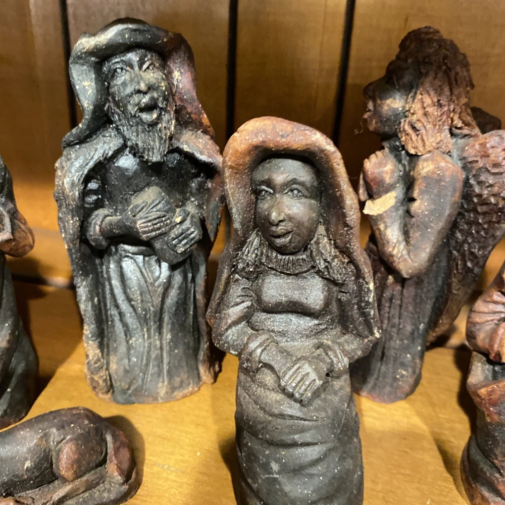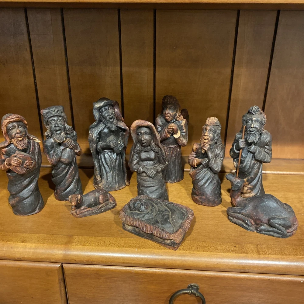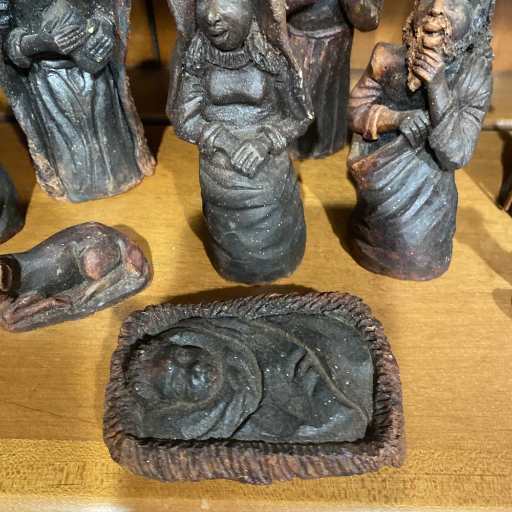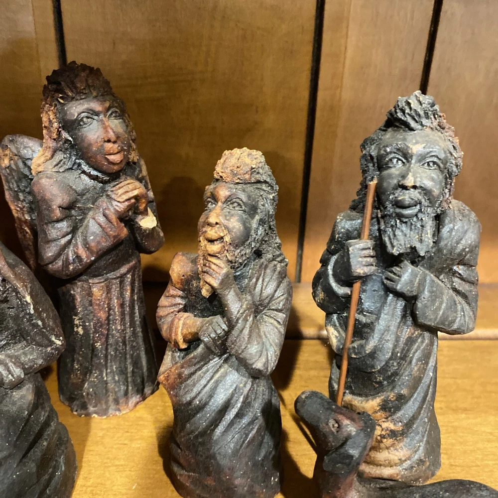 Beautiful handmade nativity scene set. I’m not exactly sure of the material ? Possibly clay.? But resembles a little bit like Wood….. Each piece has beautiful details Each piece is about 6-7 inches tall. The set comes with Mary , Joseph, Angel, Wiseman, baby Jesus, a camel, and a lamb.