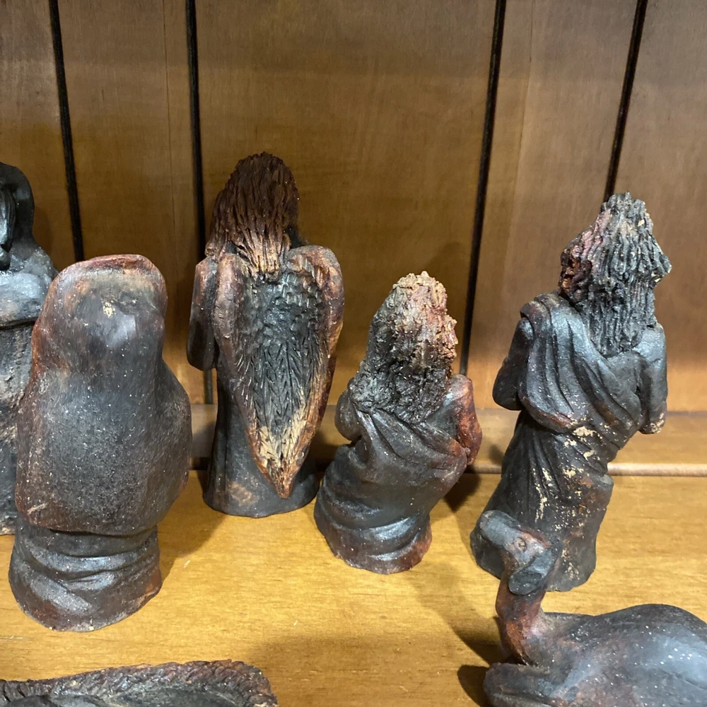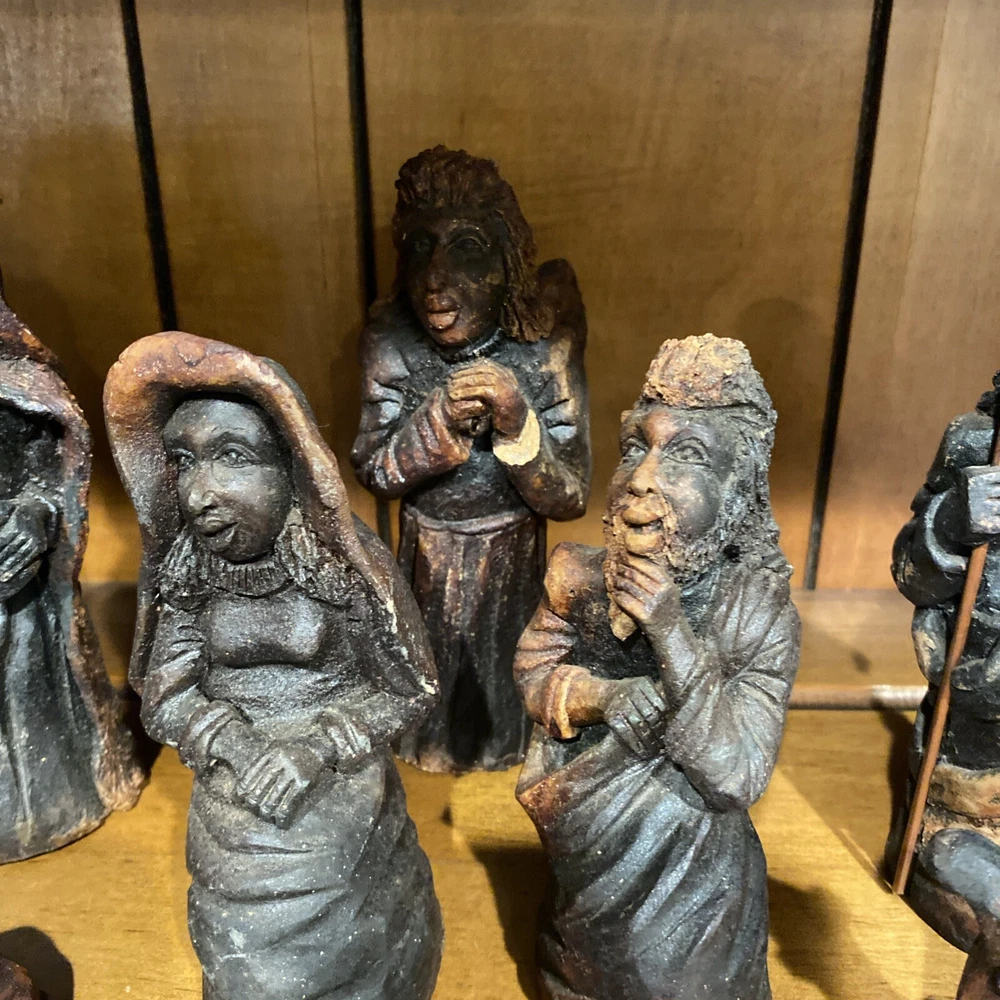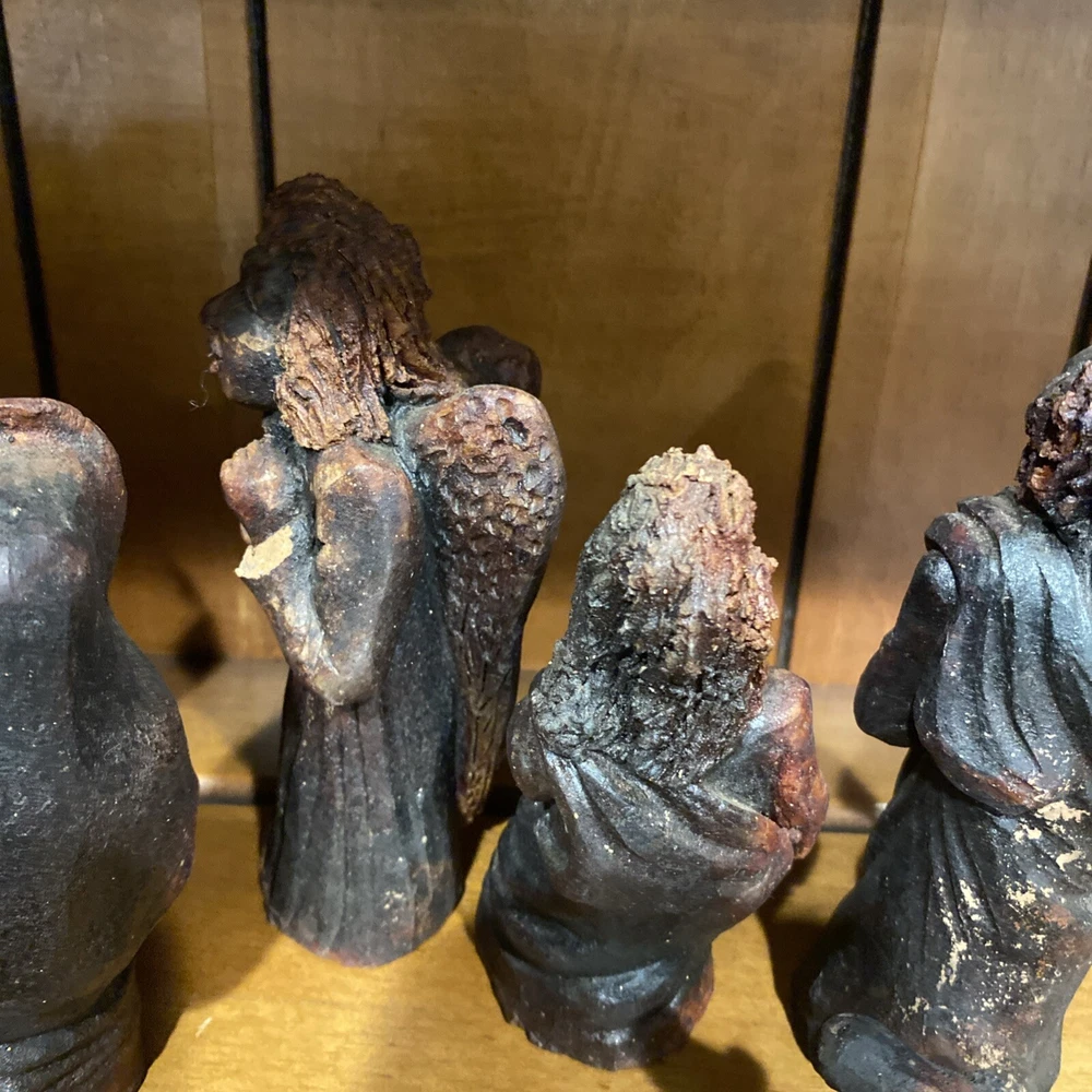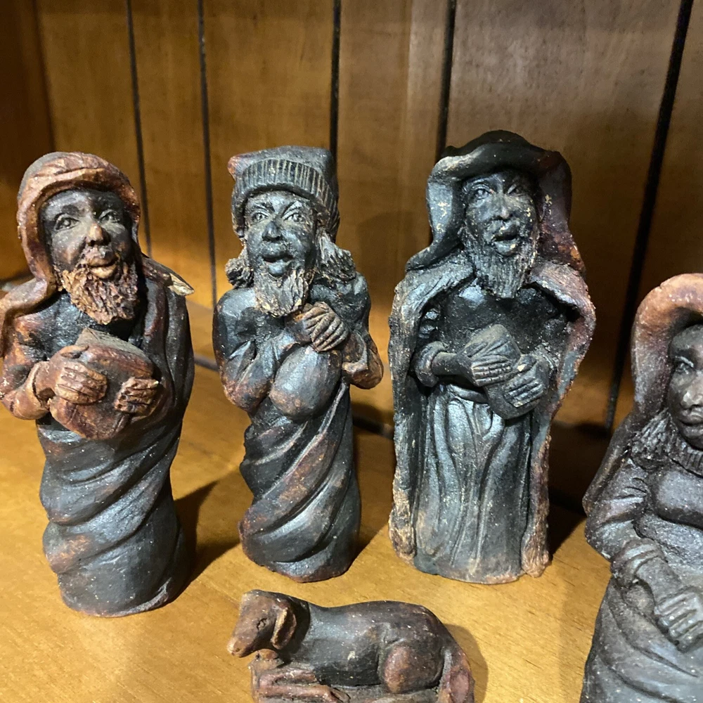 Beautiful handmade nativity scene set. I’m not exactly sure of the material ? Possibly clay.? But resembles a little bit like Wood….. Each piece has beautiful details Each piece is about 6-7 inches tall. The set comes with Mary , Joseph, Angel, Wiseman, baby Jesus, a camel, and a lamb.