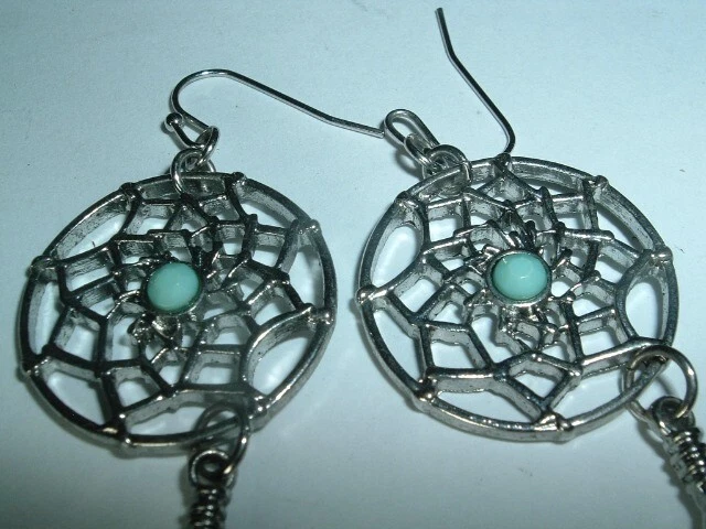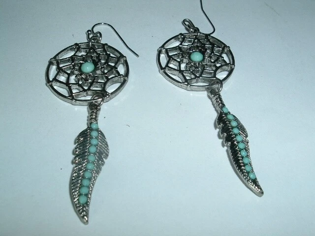Add a touch of Southwest-inspired elegance to your jewelry collection with these beautiful Dream Catcher Pierced Earrings. The intricate design features dangles of feathers with faux turquoise and a classic hook closure, making them perfect for any occasion. They are 2-1/2" long, 1" wide, never worn, condition is excellent and we will mail in jeweler's gift box.