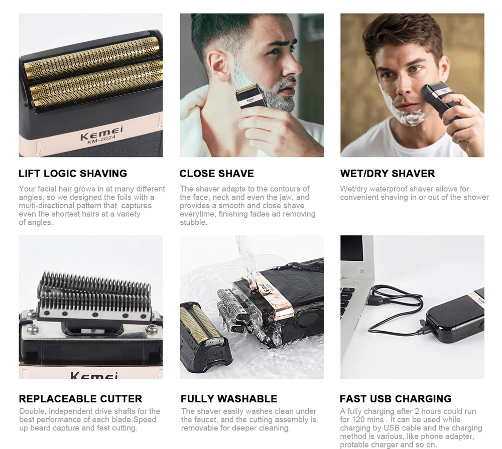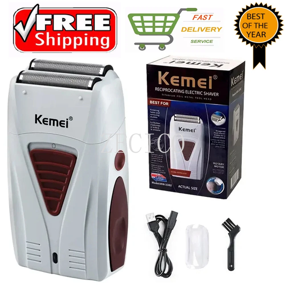 Features: 100% brand new and high quality. Rechargeable Shaver for men / women. face care multifunctional shaver men's strong shaver. KM-3382 is the best choice for you, which meet your various needs. The hair shaver has two reciprocating floating blades which shave more cleanly. The blades can be replaced by popping out. The size of hair trimmer like a phone size, which is very convenient to carry when you travel The hair clipper with grooming options lets you easily trim your hair, and provides you different excellent cutting experience! Specifications: Product model: KM-3382 Charging time: 1 hour Usage time: 45 minutes Rated power: 50-60Hz Voltage: 100-240V Cleaning method: knife head washing Product size: 11.5*6.5*3CM Cutter head type: floating double net double cutter head Package included: 1 x Electric Foil Shaver 1 x USB Charger Notes: 1. Due to the different monitor and light effect, the actual color of the item might be slightly different from the color showed on the pictures. Thank you! 2. Please allow 1-2cm measuring deviation due to manual measurement. 3.If you have any question please feel free to contact us before leaving feedback or opening a case, it's our pleasure to help you solve the problem.