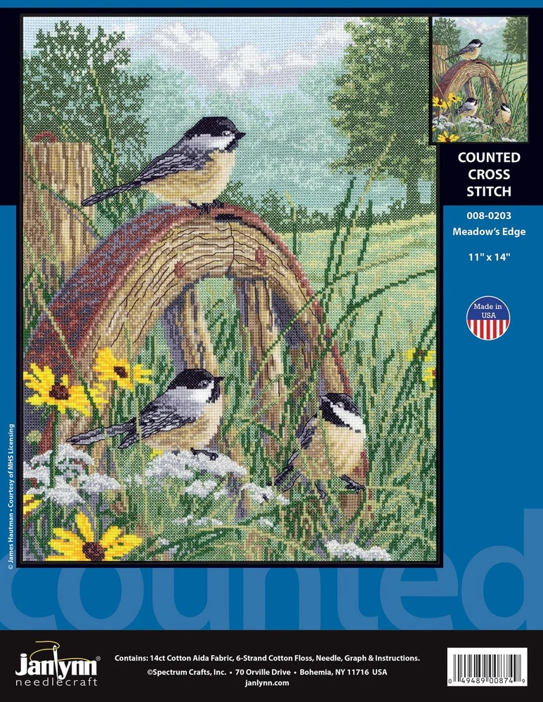 Meadow's Edge is a counted cross stitch design. Enjoy nature at its best with birds sitting among the flowers at the edge of the meadow. Contains: 14-count Aida Fabric, 6-strand 100% Cotton Floss, Needle, Graph and Instructions. Size 11x14 6-strand 100% Cotton Floss Size 11 x 14 Contains: 14-count Aida Fabric, 6-strand 100% Cotton Floss, Needle, Graph and Instructions. Size 11x14 Counted Cross Stitch Kit Made in the USA