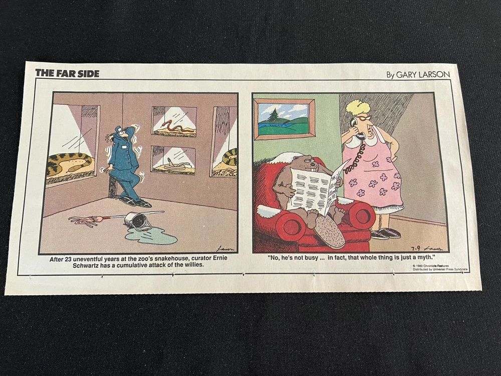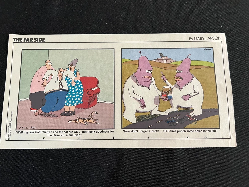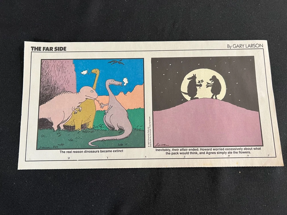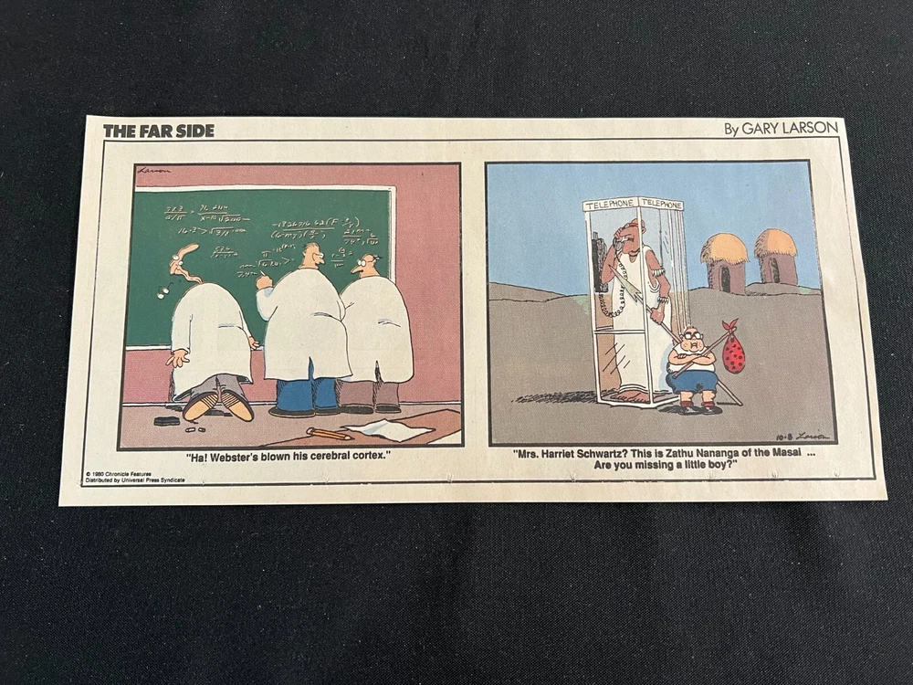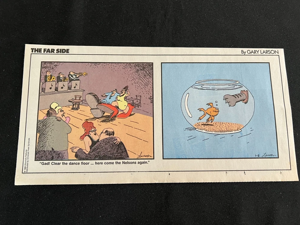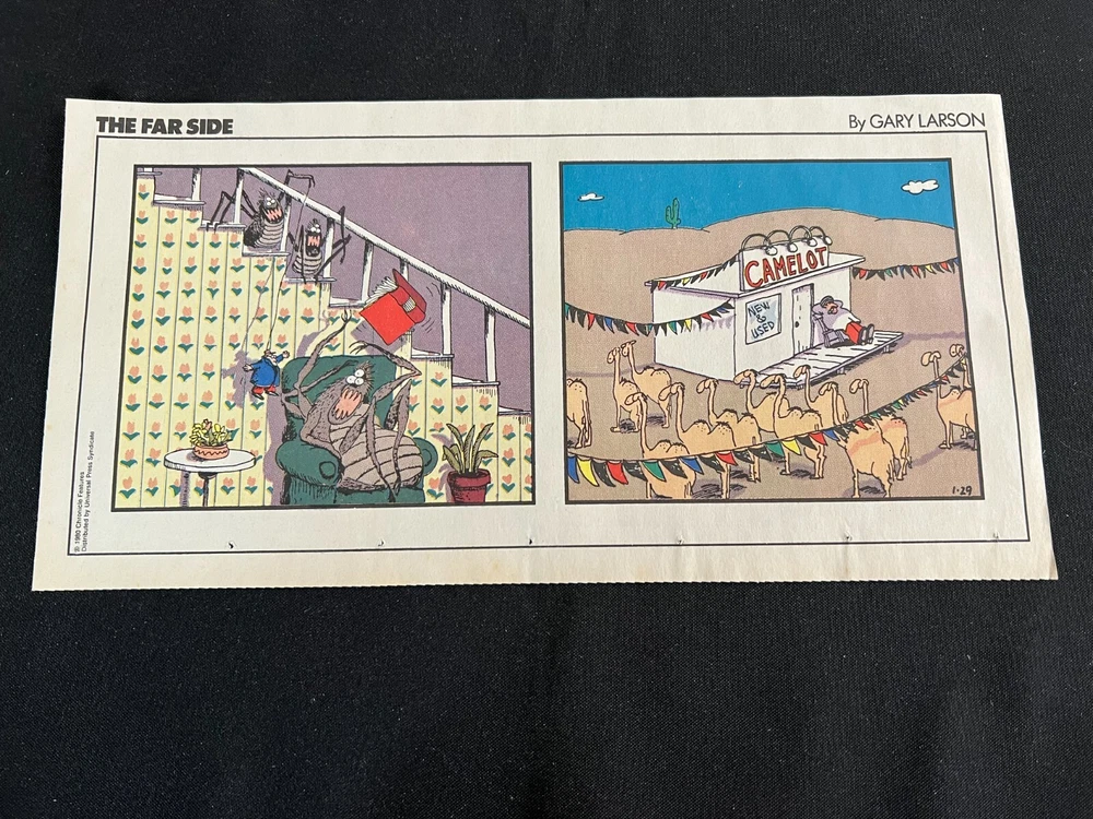 Lot of 20 THE FARSIDE SUNDAY THIRD PAGE COMIC STRIPS By Gary Larson THE FAR SIDE comic strip, created and drawn by Gary Larson, was in print from December 31, 1979 to January 1, 1995. This listing is a selection of Sunday Third Page Comic Strips from 1989... Conditions range from Very Good to Fine. Includes the following dates: January 1, 1989 January 8, 1989 January 15, 1989 January 22, 1989 January 29, 1989 February 5, 1989 February 12, 1989 July 2, 1989 July 9, 1989 July 30, 1989 August 6, 1989 August 13, 1989 August 20, 1989 August 27, 1989 September 3, 1989 September 24, 1989 October 1, 1989 October 8, 1989 October 15, 1989 October 22, 1989 _______________ To Search my eBay Store for other vintage Comic Strips and Advertisements CLICK HERE I have thousands of strips and advertisements waiting to be listed on eBay. If you don’t find what you are seeking in my eBay store, send me an email with the titles and dates and I will check my inventory! _______________ Combine purchases and save on shipping! Use the Shopping Cart option to confirm your purchases and request adjusted shipping charges. The easiest way to do this is to place the items you want to purchase in your shopping cart. When you open the shopping cart, across from your name are the words in blue "Request Total." Click these words and the request total page is generated that shows the items that you are committing to buy and a box for a message to you the seller. You can now click the blue box that states “Commit to Buy” & submit the request. This works best on a computer rather than a cell phone. If something goes wrong and eBay charges you the full amount, don't worry, I will refund the excess when I pack your order. ______________________________________