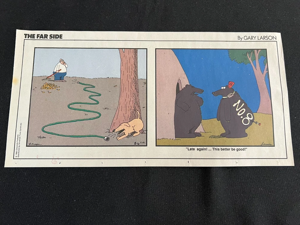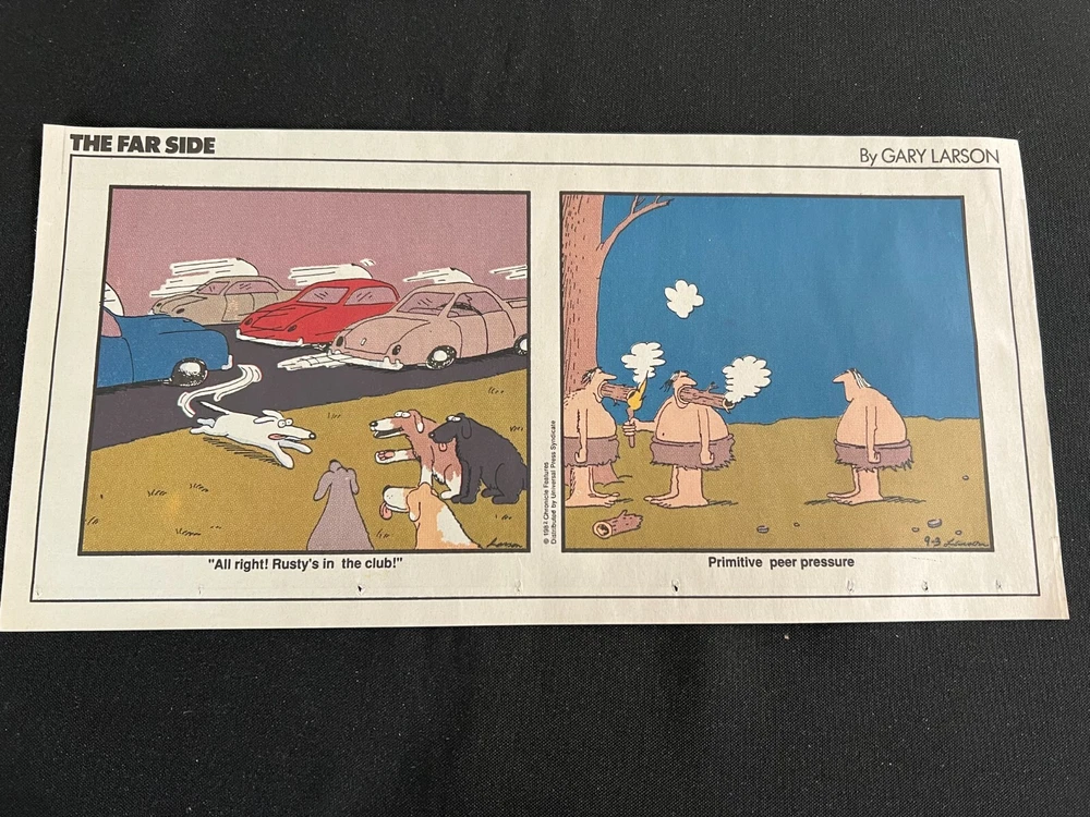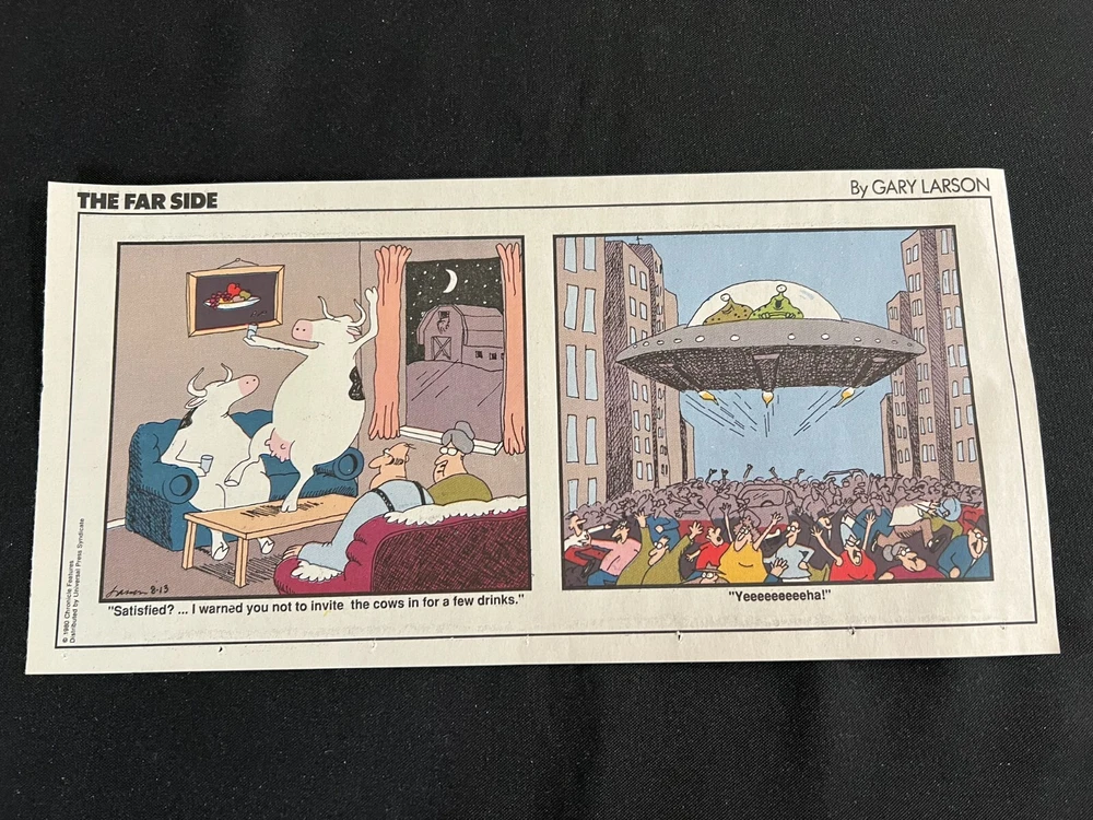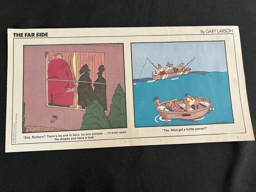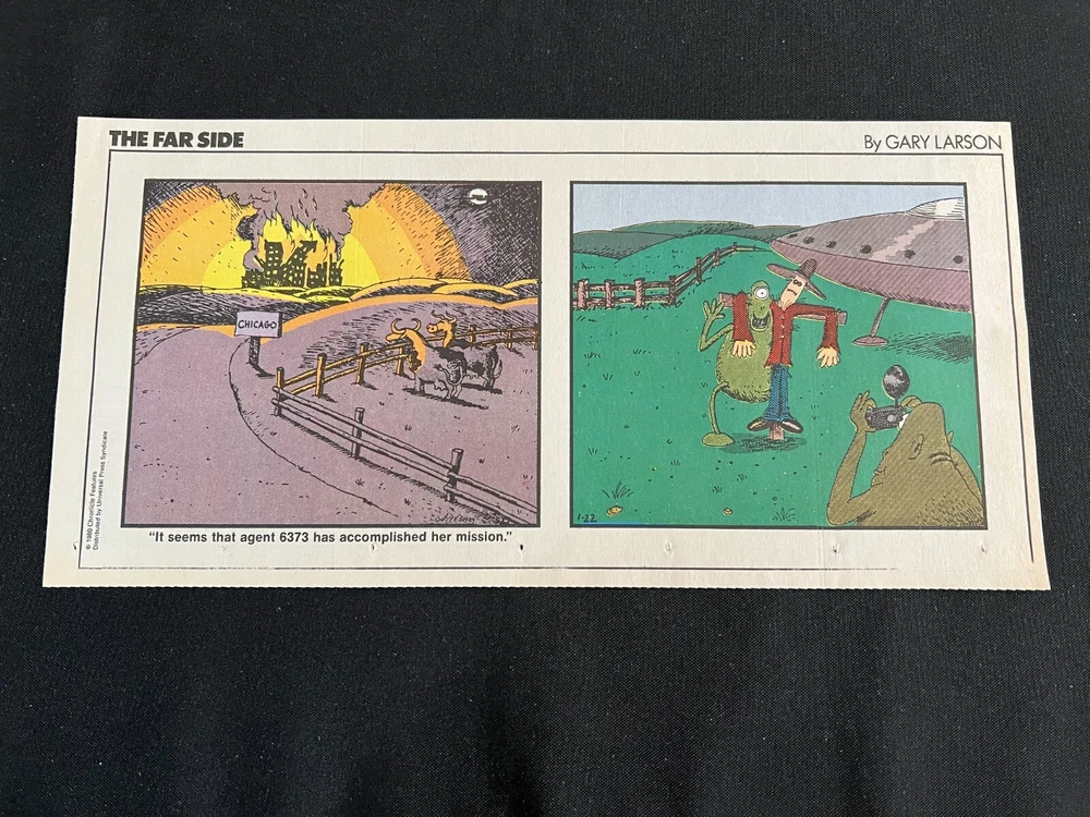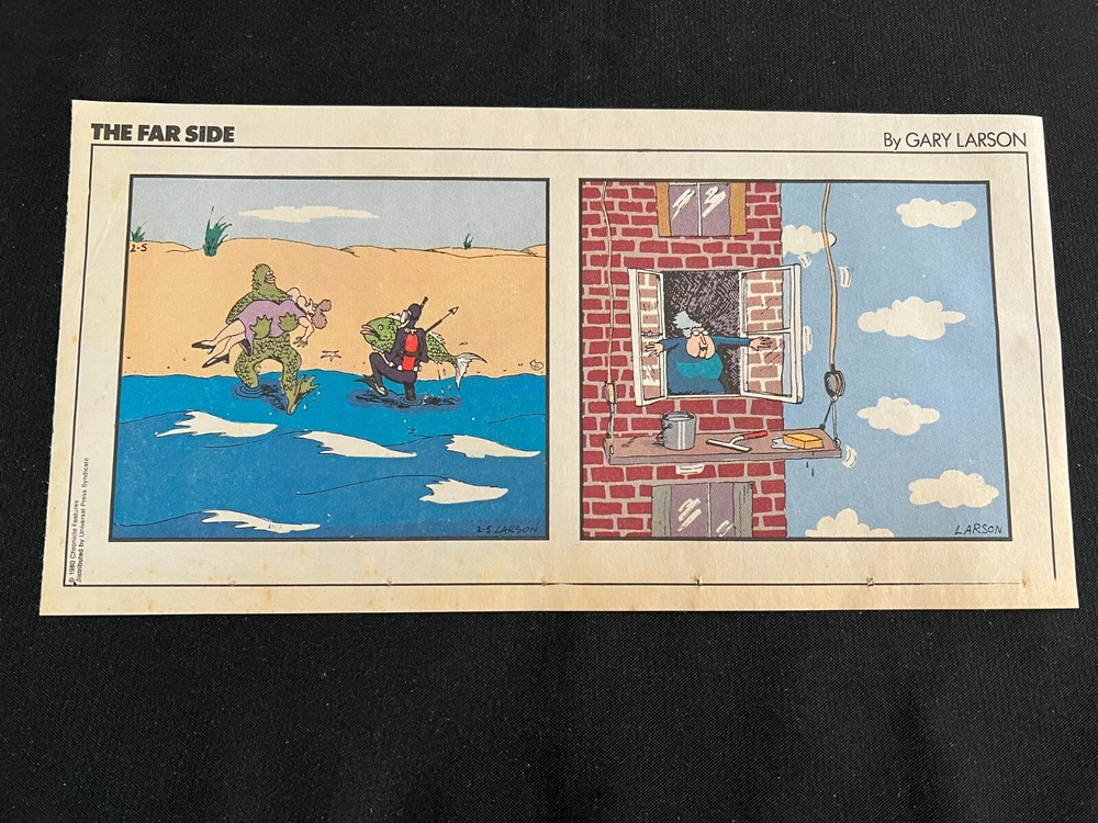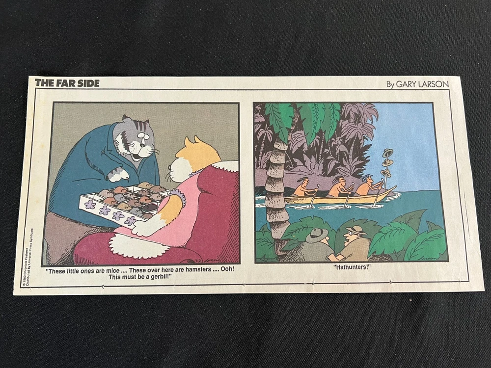 Lot of 20 THE FARSIDE SUNDAY THIRD PAGE COMIC STRIPS By Gary Larson THE FAR SIDE comic strip, created and drawn by Gary Larson, was in print from December 31, 1979 to January 1, 1995. This listing is a selection of Sunday Third Page Comic Strips from 1989... Conditions range from Very Good to Fine. Includes the following dates: January 1, 1989 January 8, 1989 January 15, 1989 January 22, 1989 January 29, 1989 February 5, 1989 February 12, 1989 July 2, 1989 July 9, 1989 July 30, 1989 August 6, 1989 August 13, 1989 August 20, 1989 August 27, 1989 September 3, 1989 September 24, 1989 October 1, 1989 October 8, 1989 October 15, 1989 October 22, 1989 _______________ To Search my eBay Store for other vintage Comic Strips and Advertisements CLICK HERE I have thousands of strips and advertisements waiting to be listed on eBay. If you don’t find what you are seeking in my eBay store, send me an email with the titles and dates and I will check my inventory! _______________ Combine purchases and save on shipping! Use the Shopping Cart option to confirm your purchases and request adjusted shipping charges. The easiest way to do this is to place the items you want to purchase in your shopping cart. When you open the shopping cart, across from your name are the words in blue "Request Total." Click these words and the request total page is generated that shows the items that you are committing to buy and a box for a message to you the seller. You can now click the blue box that states “Commit to Buy” & submit the request. This works best on a computer rather than a cell phone. If something goes wrong and eBay charges you the full amount, don't worry, I will refund the excess when I pack your order. ______________________________________