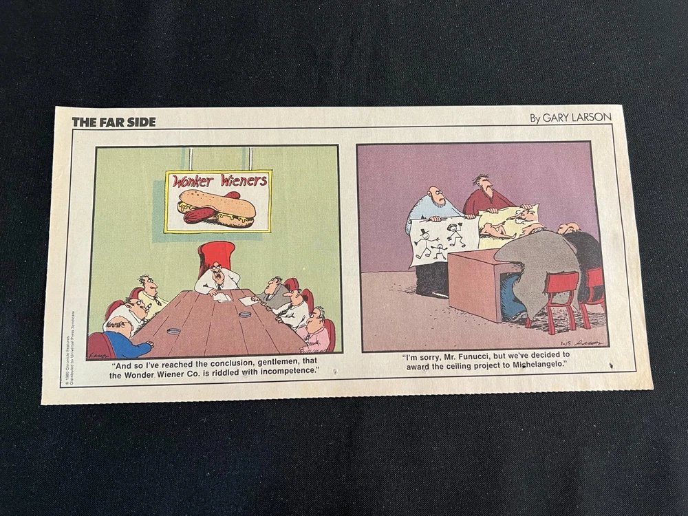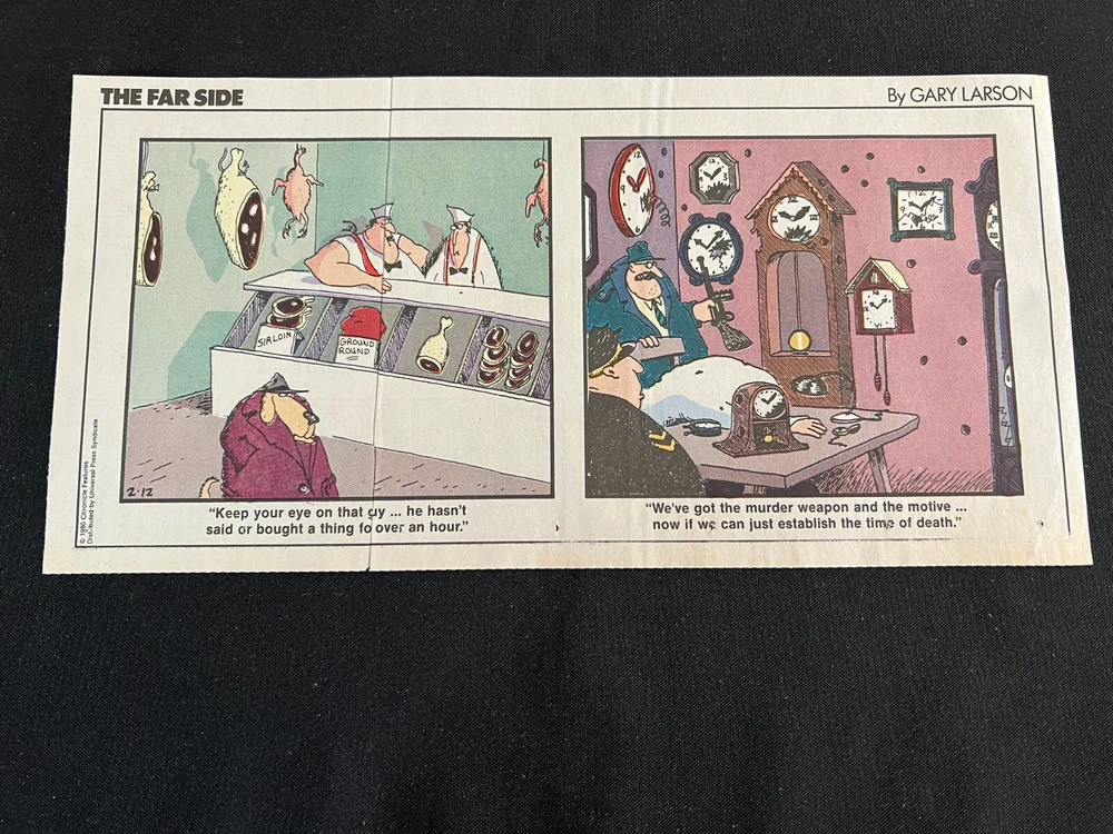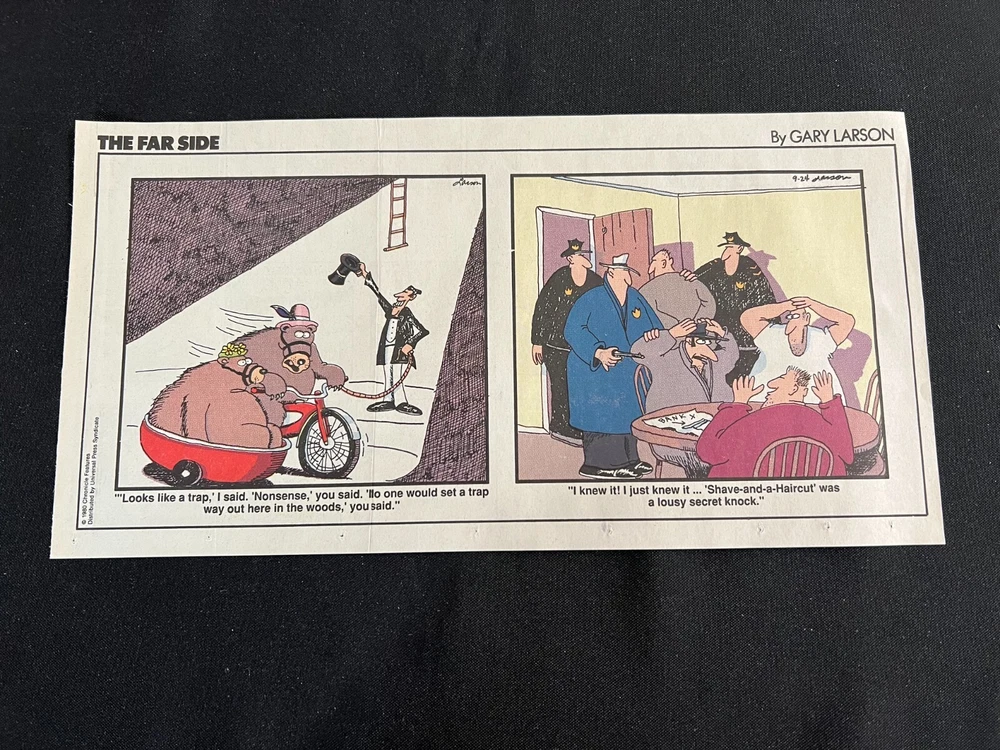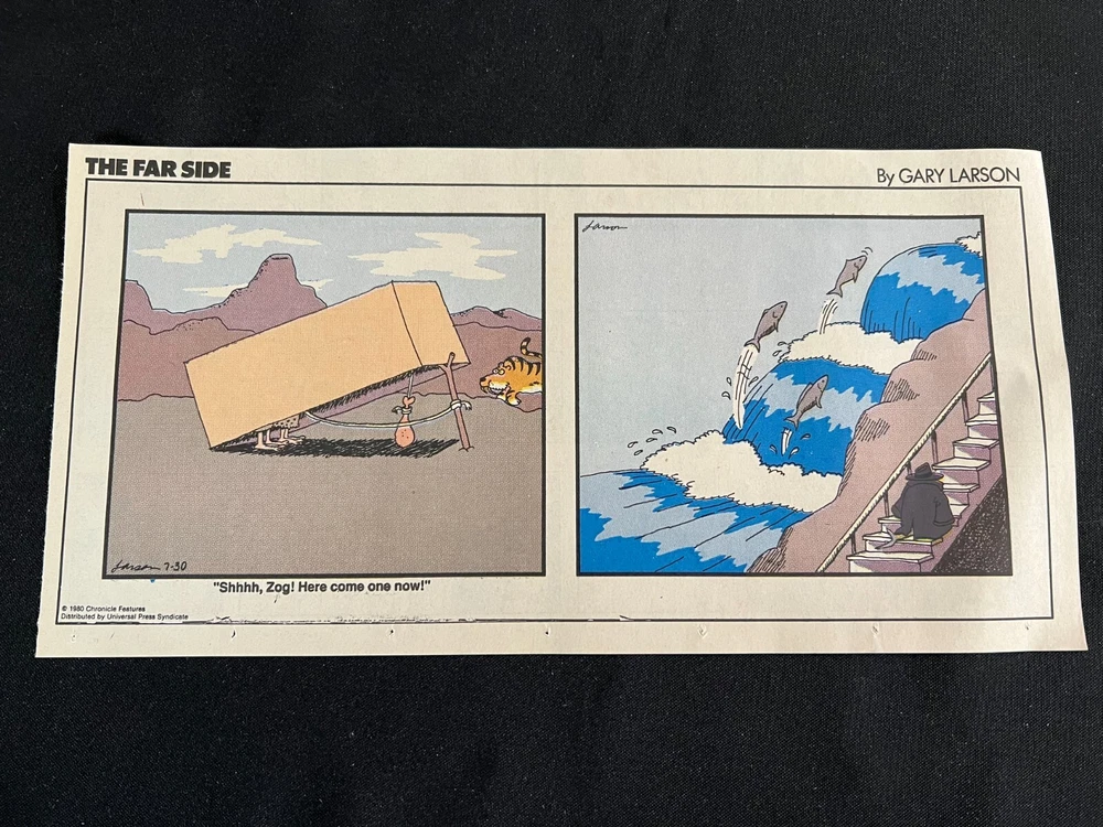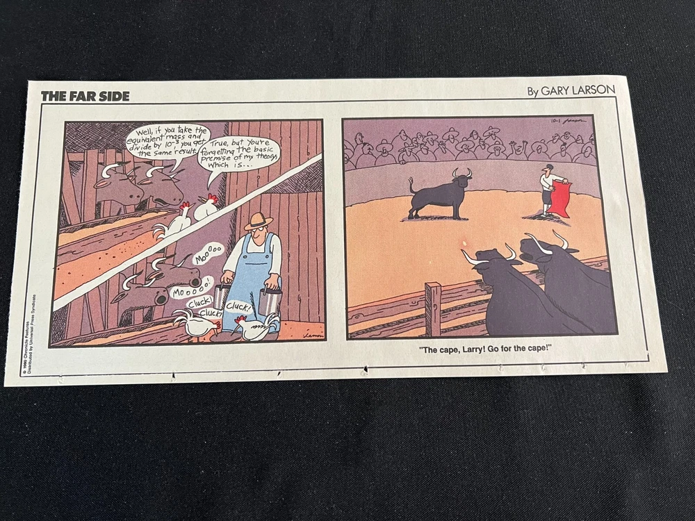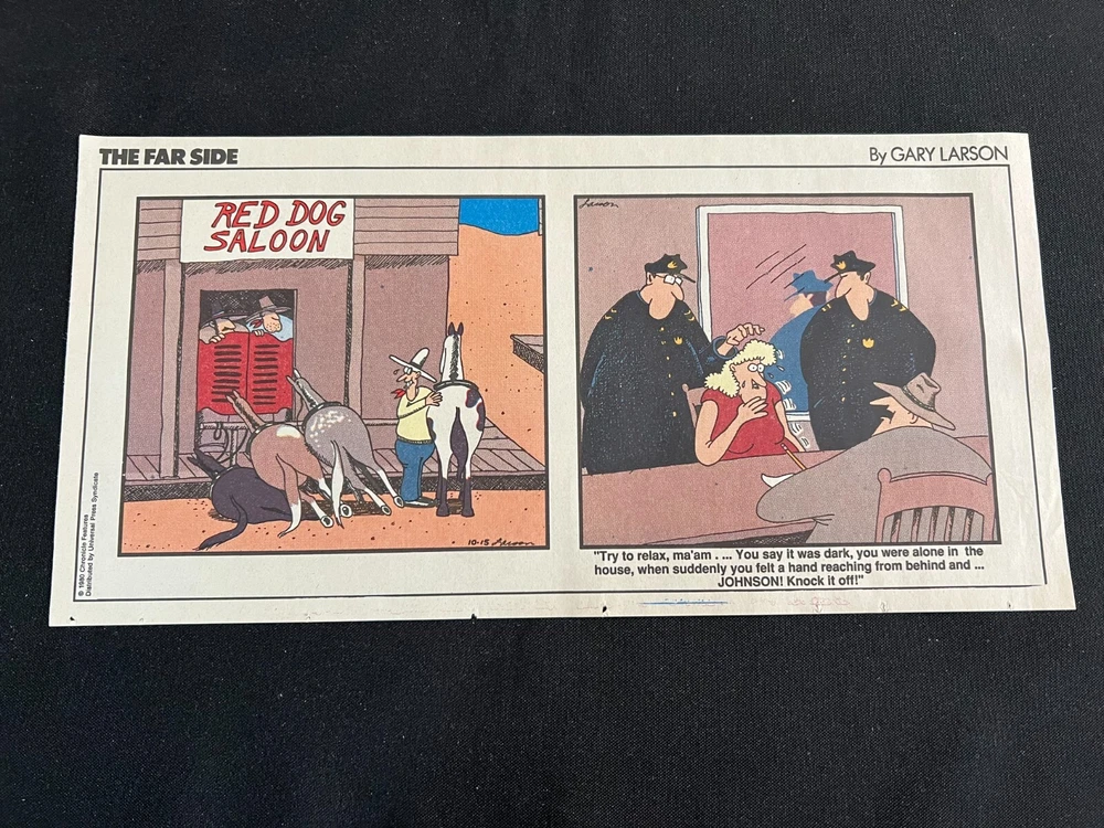 Lot of 20 THE FARSIDE SUNDAY THIRD PAGE COMIC STRIPS By Gary Larson THE FAR SIDE comic strip, created and drawn by Gary Larson, was in print from December 31, 1979 to January 1, 1995. This listing is a selection of Sunday Third Page Comic Strips from 1989... Conditions range from Very Good to Fine. Includes the following dates: January 1, 1989 January 8, 1989 January 15, 1989 January 22, 1989 January 29, 1989 February 5, 1989 February 12, 1989 July 2, 1989 July 9, 1989 July 30, 1989 August 6, 1989 August 13, 1989 August 20, 1989 August 27, 1989 September 3, 1989 September 24, 1989 October 1, 1989 October 8, 1989 October 15, 1989 October 22, 1989 _______________ To Search my eBay Store for other vintage Comic Strips and Advertisements CLICK HERE I have thousands of strips and advertisements waiting to be listed on eBay. If you don’t find what you are seeking in my eBay store, send me an email with the titles and dates and I will check my inventory! _______________ Combine purchases and save on shipping! Use the Shopping Cart option to confirm your purchases and request adjusted shipping charges. The easiest way to do this is to place the items you want to purchase in your shopping cart. When you open the shopping cart, across from your name are the words in blue "Request Total." Click these words and the request total page is generated that shows the items that you are committing to buy and a box for a message to you the seller. You can now click the blue box that states “Commit to Buy” & submit the request. This works best on a computer rather than a cell phone. If something goes wrong and eBay charges you the full amount, don't worry, I will refund the excess when I pack your order. ______________________________________