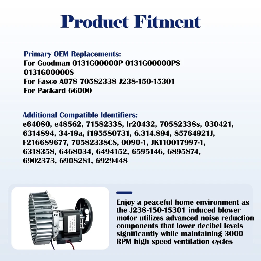 For Goodman 0131G00000PS Inducer Blower Motor Assembly Replacement 0131G00000S Product description [Compatible Models] A078 exhaust vent venter motor replacement part numbers: Goodman 0131G00000P 0131G00000PS 0131G00000S , Fasco A078 70582338 J238-150-15301, Packard 66000, and other part numbers: e64080, e48562, 71582338, lr20432, 70582338s, 030421, 6314894, 34-19a, f195580731, 6.314.894, 85764921J, F216689677, 70582338CS, 0090-1, JK110017997-1, 6318358, 6468034, 6494152, 6595146, 6895874, 6902373, 6908281, 6929448 blower motors