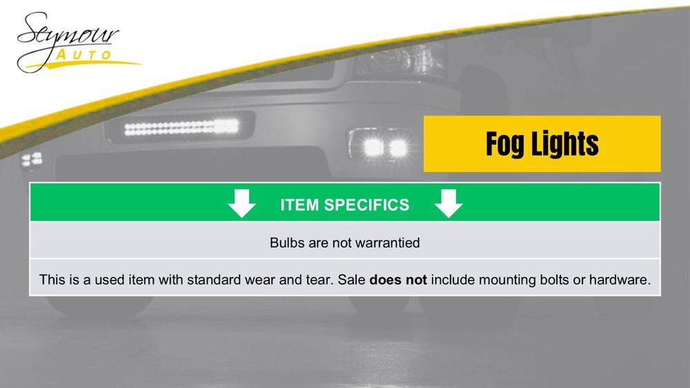 Welcome to our eBay Store! Driver Corner/Park Light Fog-driving Sedan Round Lamp Fits 04-06 MAZDA 3 541281 Description ******* SAME DAY SHIPPING ******** Donor Vehicle VIN: JM1BK323941197830 Model: MAZDA 3 Year: 2004 Mileage: 113000 (0 = not available or unknown) Stock Number: 221240 Store Number: 1 Part Detail Part Grade: A Part Category: U Part Placement: Driver/Left Notes: LH 01302023 This part will fit these makes and models with these options MAZDA 3 04-06 Fog-Driving; Sdn, round lamp, L. WARRANTY / GUARANTEE Most parts we sell through eBay Motors come with a 30 day money back guarantee unless otherwise stated. The 30 day period starts when you take possession of the part. No labor warranty is provided. In the event a part sold with a warranty fails to operate within the warranty period we will replace the part(s) with a functionally equivalent part or refund the part purchase price, at our option. No refund on deposits or unwanted special order parts or special "cut" items. To return an item you must contact us via eBay Message within the 30 day period to obtain a RMA number (return material authorization). Original shipping charges and return shipping charges are not refunded. Once you obtain an RMA number, ship the item back to Seymour Auto Wrecking 107 New Haven Rd Seymour, CT 06483 along with the RMA number. SHIPPING NOTES ABOUT US HELP Seymour Auto Wrecking ships to US addresses within the 48 states only via UPS ground. No Alaska, Hawaii, Puerto Rico, APO, FPO or PO Box's at this time please. No International shipping is available at this time. Pick up at our facilities is available. Please email us prior to your purchase to arrange pick up. Items will be shipped within 1-2 days of purchase. Please allow 5-10 days for delivery. Most areas in the US are within 5 days. No expedited shipping is available. If an item arrives damaged, please contact us via eBay Message within 24 hours for instructions. If you have a question about a part please contact us BEFORE purchasing. Our main contact method is by eBay Messages. We try to answer all messages within 24 hours. If we are unable to answer your questions before the listing ends the item will be re-listed again soon for you to purchase.