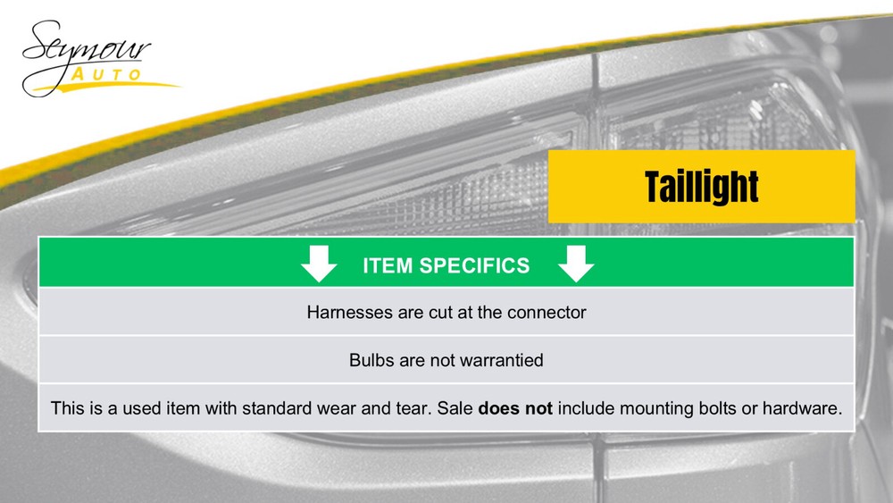 Hollander Welcome to our eBay store! Driver Tail Light Sedan Lid Mounted Clear Lens Fits 04-06 MAZDA 3 969008 Description This is a Used Taillight removed from a salvage vehicle. This is sold as the Taillight Assembly only. It does not include the plug, bulb, or harness. If these items are left on, they are from convenience only and not covered by our warranty. You are covered by our 6 Month Part Warranty. LEFT IS DRIVERS SIDE AND RIGHT IS THE PASSENGERS SIDE. This taillight has been inspected and is functional, however it may have slight scuffs, scratches, or blemishes. Please contact us with any questions your may have!******* SAME DAY SHIPPING ******** Donor Vehicle Model : MAZDA 3 Year : 2006 Mileage : 0 (0 = not available or unknown) Stock Number : 025432 Notes : LID MOUNT This Part Will Fit These Makes And Models With These Options MAZDA 3 04-06 Sdn, lid mounted, clear lens, L. About Us Payment Shipping Returns Warranty About Us We are a locally owned business with over 70 years of experience in the automotive industry with an extensive collection of used car parts and accessories for thousands of different vehicles. Our knowledgeable and caring staff work hard every day making sure all of our parts are high quality and functional to fit your needs. We are happy to verify fitment for you prior to purchase via your vehicle’s VIN (Vehicle Identification Number). Please contact us with any questions prior to purchasing. Orders are sent to the shipping department throughout the day therefore we cannot guarantee adjustments to orders after payment is received. Payment Payment details: Please contact us with any questions prior to purchasing. Orders are sent to the shipping department throughout the day therefore we cannot guarantee adjustments to orders after payment is received. All orders must be paid in full prior to shipment. Payments are processed through eBay by eBay. If payment is not received within a reasonable time from when the order is placed, it will be cancelled without notice. All purchase prices are final. No price match or discount can be made while an item is awaiting payment. Shipping Shipping Details: Items are shipped after being paid in full. We only ship to US addresses within the continental 48 states. Shipping to AK, HI and PO Box's require a special rate and are subject to additonal charges. All parts listed with Free Shipping have a one day handling time and may not be picked up by the carrier the same day the part is ordered. Any estimated delivery dates provided are only estimates and are not guaranteed to be accurate. We are not responsible for any delays with UPS, Fed-Ex or USPS. We must be contacted same day if an item is received damaged. All address changes must be completed before the part is shipped. Address changes that take place after the part has been shipped are subject to an address change fee. Overnight and expedited shipping options are available for an additional cost. All parts listed as, Pick Up Only , can be shipped if the shipping cost is covered by the buyer. All parts listed as, Pick Up Only , will be held at Seymour Auto Wrecking (107 New Haven Rd, Seymour CT 06483) for the buyer. International orders are shipped via eBay’s Global Shipping Program. We are not responsible for any shipping charge associated with eBay's Global Shipping Program. We are unable to change the delivery address on all orders shipped through eBay's Global Shipping Program. eBay must be contacted directly. We are not responsible for any delays or issues reagrding any item purchased and shipped through eBay's Global Shipping Program. Returns All parts sold have a standard 30-Day return window. Return Details: We must be contacted within 30 days of the carrier provided delivery date for the return to be accepted. No return wil be accepted if contacted after 30 days from the carrier provided delivery date. We may require more information reagrding a return request. ex: pictures, receipts, videos, etc. A free return label will not be provided for remorse return reasons. ex: changed mind, ordered by mistake/by accident, didn't like it The buyer must ship the return within 21 days of receiving a return label or starting a return. All returns must be sent in the appropriote sized box with adequate packaging. Any return received damaged may be eligible for a refund deduction. All returns made must be occompanied with a return reason. All returns that are received without a reason will not be processed. If a return label is issued by eBay, we are not responsible for reimbursing the buyer for the cost of the label. In the event the part returned does not match the original part sent, a case will be opened up with eBay. Warranty All parts come with our standard 6-month warranty. Please contact us for more details prior to ordering. The warranty begins as soon as the buyer takes possession of the part. Standard 6-Month Warranty: If a part is proven to be defective within the 6 month warranty period, a replacement or refund will be sent at our discretion. We are not responsible or liable for any incidental or consequential loss or damage. We will require more information reagrding a warranty request. ex: pictures, receipts, videos, etc. No warranty claims or reimbursement on labor. All body parts are sold as is. Any part that is damaged or altered by the buyer will not be eligible for warranty or return. No warranty claim can be made based on color or trim package. We are not responsible for the buyer's error. ex: Accidental orders, late address changes. We do not offer an extended warranty with eBay. If you experience any issue with your part, please contact us prior to attempting to repair or remove the part. Failure to do so will void the warranty. We make no claim as to the suitability of any part for any particular purpose. The buyer is responsible for determining the suitability of the part purchased for its intended purpose. In the event an incorrect part is shippe