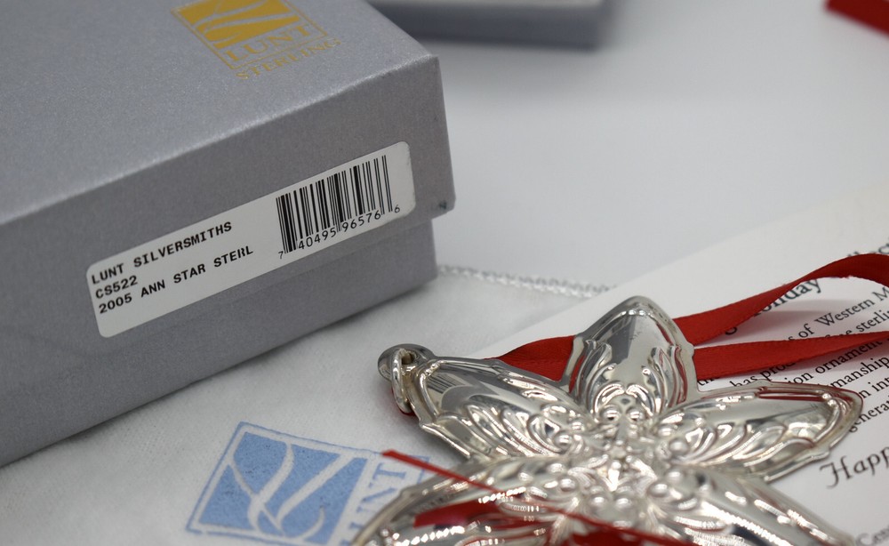 This listing features a 6 point star shaped ornament with repousse poinsettia design. Super details. Style number 522. Approx: 3" x 2 1/2" Approx: 24 grams Impressed Happy Holidays Lunt Sterling 2005 Includes original silver box, white felt pouch, red satin ribbon, info card See my other listing for a huge estate collection of extraordinary and very fine Christmas ornaments in glass and sterling silver collected from the 1970s until 2015. Check back often as it will take weeks to list the thousands of Christmas items. Shipping: We ship USPS, UPS or Fedex unless requested otherwise Return Policy: Please notify of return within three days of receiving. Return with original tags/security marks and in original received condition. International Buyers: Postage does not include any customs, duties or delivery fees.
