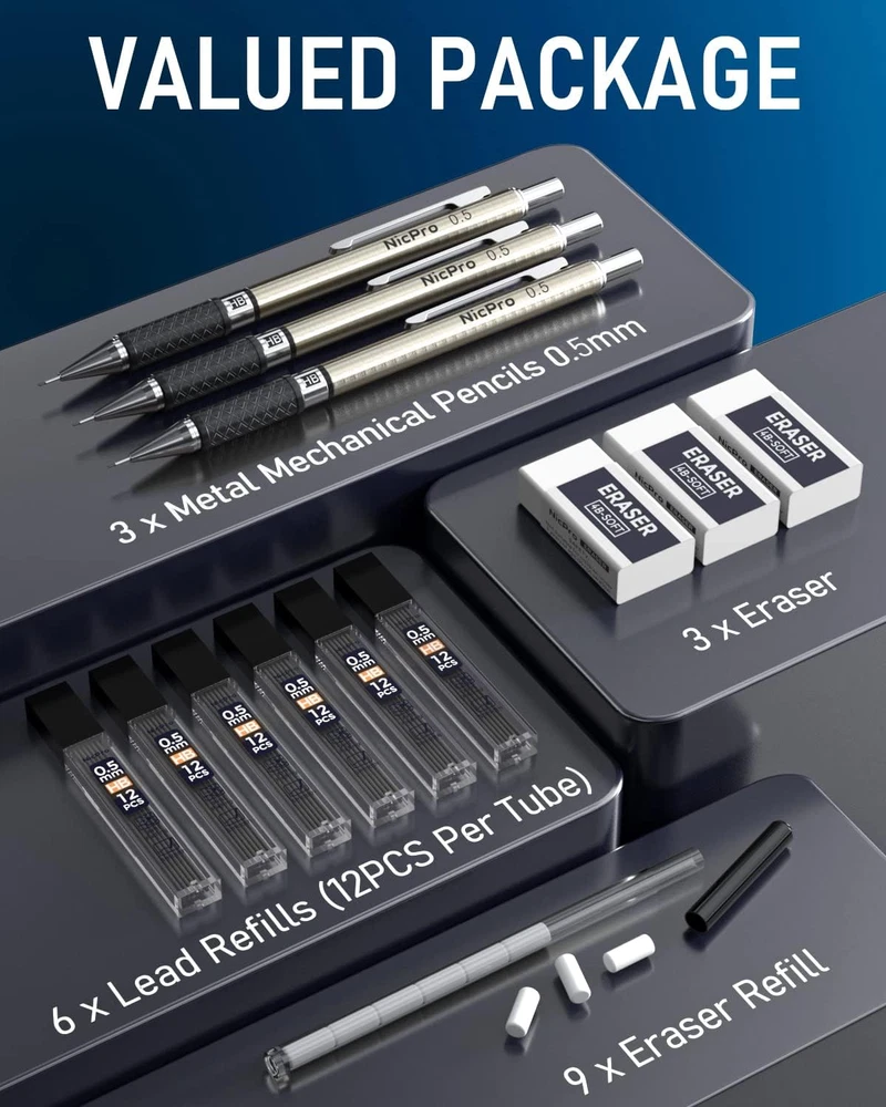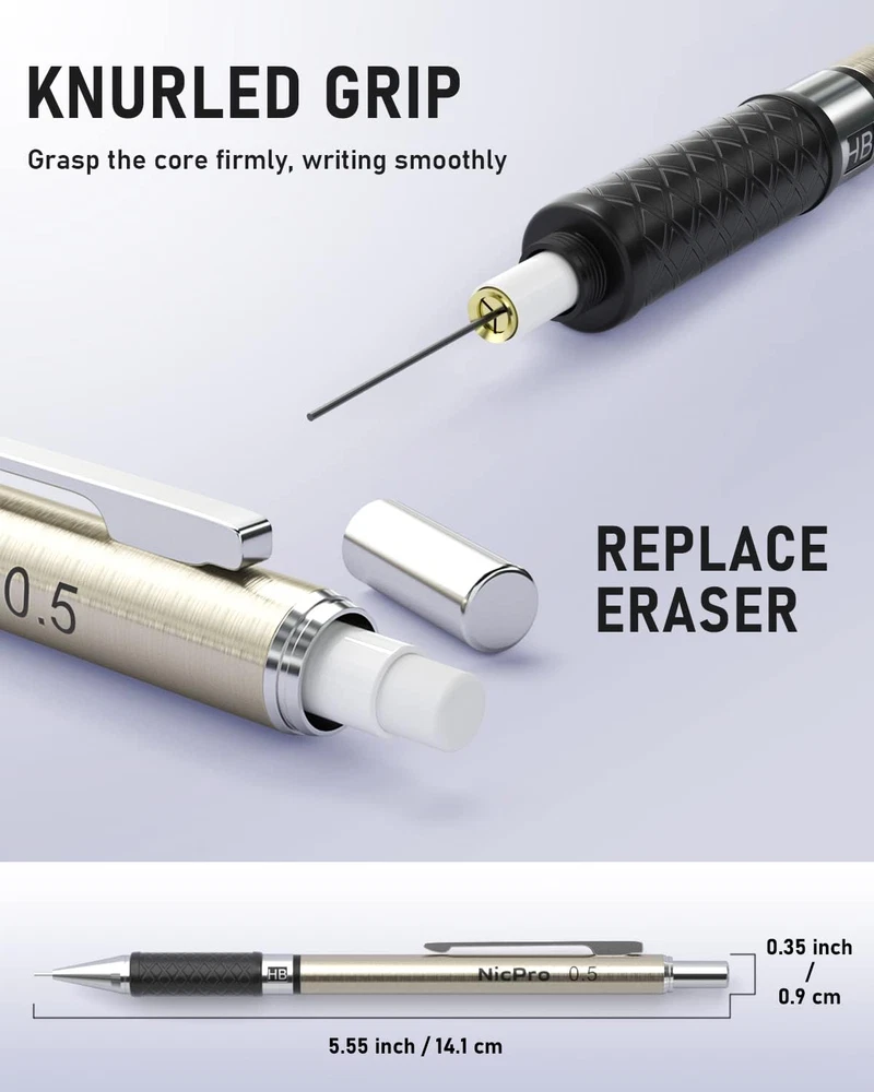 Store New Arrivals Add to Favorite View Feedback Contact 0.5 Mm Art Mechanical Pencil Set in Storage Case, 3 PCS Metal Drafting Pencil Lead Pencil with 6 Tube HB Lead Refills, 3 Erasers, 9 PCS Eraser Refills for Artist Writing, Drawing, Sketching Description Item model number MG486-FBA Closure Retractable Style 0.5MM Writing Instrument Form Multifunction Writing Instruments Pencil Lead Degree (Hardness) HB Material Type Metal Material Metal Line Size 0.5 mm Millimeters Grip Type Knurled Manufacturer Part Number B0BF8NH28R Item Weight 4.6 ounces Age Range (Description) Adult Ink Color Black Manufacturer CO.,LTD Point Type Fine Package Dimensions 5.91 x 3.23 x 0.83 inches Size 0.5MM Value Mechanical Pencils Set: The drafting pencil set come with 3 pcs metal mechanical pencils 0.5, 6 tubes HB lead refill (12 pcs / tube), 3 pcs erasers, 9 pcs eraser refills, a plastic pencil case, easy to carry and storage Comfortable Grip: Non-slip chiseled metallic grip inlaid with soft latex-free pads, comfortable to hold. These drafting pencil provides fatigue-free writing and drawing Resists Breaking Lead: The good lead doesn't smudge and erases cleanly, pre-loaded with lead, never needs sharpening, is very durable and will not break easily. The lead advances easily at the touch of a click for easy use Great Weight Balance: The metal mechanical pencil is full-brass metal body gives it a professional look, ideal weight balance at your fingertips for precise drafting and template work, brings you more effective and high quality tasks Ideal Gift Choice: Perfect for writing, draft, drawing, sketch. A great mechanical pencil set for artists, professionals such as engineers, technical, CAD drafting, teachers and students Product Description VALUED MECHANICAL PENCIL SET 1 For Drawing and Sketching 2 For Writing More Choices From Nicpro Mechanical Pencil Add to Cart Add to Cart Add to Cart Add to Cart Add to Cart Add to Cart Add to Cart Customer Reviews 4.6 out of 5 stars 663 4.7 out of 5 stars 1,262 4.7 out of 5 stars 940 4.5 out of 5 stars 878 4.7 out of 5 stars 94 4.6 out of 5 stars 705 4.8 out of 5 stars 94 Price $9.99 $ 9 . 99 $16.99 $ 16 . 99 $15.99 $ 15 . 99 $13.99 $ 13 . 99 $21.99 $ 21 . 99 $7.99 $ 7 . 99 $10.99 $ 10 . 99 Material Metal Metal Metal Metal Metal Plastic Plastic Size 0.5MM 0.5, 0.7, 0.9, 2.0 MM 0.3, 0.5, 0.7, 0.9, 2.0 MM 0.5MM 0.5, 0.7, 0.9, 2.0 MM 0.5MM 0.5MM Lead Refill 6 Tubes Lead Refill 10 Tubes Lead Refill 11 Tubes Lead Refill 6 Tubes Lead Refill 20 Tubes Lead Refill 8 Tubes Lead Refill 8 Tubes Lead Refill Erasers 3 Pcs +9 Pcs Erasers Refill 3 Pcs +9 Pcs Erasers Refill 2 Pcs +9 Pcs Erasers Refill 18 Pcs Erasers Refill 4 Pcs +18 Pcs Erasers Refill 1 Pcs +9 Pcs Erasers Refill 3 Pcs +20 Pcs Erasers Refill Built-in Eraser √ √ √ √ √ √ √ ABOUT US We offer the best prices around on high quality products. Our E-store includes media such as books, movies, music and games while offering electronics, toys, sporting apparel, clothing, tools, general home, garden items and more. SHIPPING We are always working hard to ensure your package arrives as soon as possible. Please understand that some factors like weather, high postal traffic, and the performance of shipping companies are outside of our control. We offer free shipping to the lower 48 states and ship within 2 business days of payment, usually sooner. We do not accept P.O. Boxes. Please provide a physical address. For shipping outside of the continental USA, we only use eBay's Global Shipping Program.The item is shipped to KY and then sent to the rest of the world. International customers are responsible for all duties and taxes. Continue to check out in order to calculate costs for shipping the item to your country. Messages regarding eBay's Global Shipping Program MUST be directed at eBay EXCLUSIVELY. RETURNS We offer a 30-Day Return Policy on items which you are not completely satisfied with. You have the option for a full-refund or an exchange of the item. No returns are available on items shipped outside of the USA. PAYMENT We accept PayPal. CONTACT US This page content is yet to come Please ad us to your favorite seller and visit again later Thank You CUSTOMER SATISFACTION We try our very best to make sure every customer is completely satisfied. If there's a problem, message us! We're happy to help. WE ACCEPT Copyright © 2021 AutoDS. | All Rights Reserved