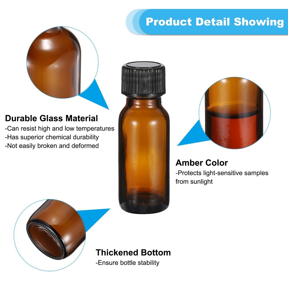 Document The round bottle is widely used in laboratories, homes, and traveling for storing or dispensing liquid such as beard oil or hair oil, essential oils, cosmetics, shampoo, conditioner, body & hand cream, lotion, or sample distribution. SpecificationCapacity: 0.5 Ounce/15mlOverall Size(inch): 68.2 x 25mm/2.7 x 1 Inch(H*OD)Mouth Inner Diameter: 10.8mm/0.4 InchMouth Outside Diameter: 17.5mm/0.7 InchColor: Amber(Bottle Body); Black(Bottle Cap)Material: Glass(Bottle Body); Plastic(Bottle Cap)Packing List: 24Pcs x Sample BottlesAdvantage1. The sample bottles are made of durable glass material that can resist high and low temperatures, has superior chemical durability, is not easily broken and deformed, and can be used for a long time. The thickened bottom of the bottle ensures bottle stability.2.Amber color protects light-sensitive samples from sunlight, extending their shelf life.3. Screw cap's tight seal reduces the risk of liquid evaporation and spills, preventing leakage of your liquid during use.InstructionTwist off the cap, pour the liquid into the bottle, and close the cap.Note: Please check the size before purchasing. Use w care to avoid breakage. 0.5oz(15ml) Glass Dispensing Bottle w Black Poly Cone Cap, 24Pcs, Amber The round bottle is widely used in laboratories, homes, and traveling for storing or dispensing liquid such as beard oil or hair oil, essential oils, cosmetics, shampoo, conditioner, body & hand cream, lotion, or sample distribution. Specification Capacity: 0.5 Ounce/15ml Overall Size(inch): 68.2 x 25mm/2.7 x 1 Inch(H*OD) Mouth Inner Diameter: 10.8mm/0.4 Inch Mouth Outside Diameter: 17.5mm/0.7 Inch Color: Amber(Bottle Body); Black(Bottle Cap) Material: Glass(Bottle Body); Plastic(Bottle Cap) Packing List: 24Pcs x Sample Bottles Advantage 1. The sample bottles are made of durable glass material that can resist high and low temperatures, has superior chemical durability, is not easily broken and deformed, and can be used for a long time. The thickened bottom of the bottle ensures bottle stability. 2.Amber color protects light-sensitive samples from sunlight, extending their shelf life. 3. Screw cap's tight seal reduces the risk of liquid evaporation and spills, preventing leakage of your liquid during use. Instruction Twist off the cap, pour the liquid into the bottle, and close the cap. Note: Please check the size before purchasing. Use w care to avoid breakage. Hot Item Payment 1.We accept eBay payment . 2.Payment must be received within 7 business days of auction closing. Shipping 1.We ship to your eBay or Paypal address. Please make sure your eBay and Paypal address is correct before you pay. 2.Items will be shipped within 1-3 business day when we received payment. 3.Delivery time depends on destination and other factors. Description Policy 0.5oz(15ml) Glass Dispensing Bottle w Black Poly Cone Cap, 24Pcs, Amber The round bottle is widely used in laboratories, homes, and traveling for storing or dispensing liquid such as beard oil or hair oil, essential oils, cosmetics, shampoo, conditioner, body & hand cream, lotion, or sample distribution. Specification Capacity: 0.5 Ounce/15ml Overall Size(inch): 68.2 x 25mm/2.7 x 1 Inch(H*OD) Mouth Inner Diameter: 10.8mm/0.4 Inch Mouth Outside Diameter: 17.5mm/0.7 Inch Color: Amber(Bottle Body); Black(Bottle Cap) Material: Glass(Bottle Body); Plastic(Bottle Cap) Packing List: 24Pcs x Sample Bottles Advantage 1. The sample bottles are made of durable glass material that can resist high and low temperatures, has superior chemical durability, is not easily broken and deformed, and can be used for a long time. The thickened bottom of the bottle ensures bottle stability. 2.Amber color protects light-sensitive samples from sunlight, extending their shelf life. 3. Screw cap's tight seal reduces the risk of liquid evaporation and spills, preventing leakage of your liquid during use. Instruction Twist off the cap, pour the liquid into the bottle, and close the cap. Note: Please check the size before purchasing. Use w care to avoid breakage. Hot Item Payment 1.We accept eBay payment . 2.Payment must be received within 7 business days of auction closing. Shipping 1.We ship to your eBay or Paypal address. Please make sure your eBay and Paypal address is correct before you pay. 2.Items will be shipped within 1-3 business day when we received payment. 3.Delivery time depends on destination and other factors.