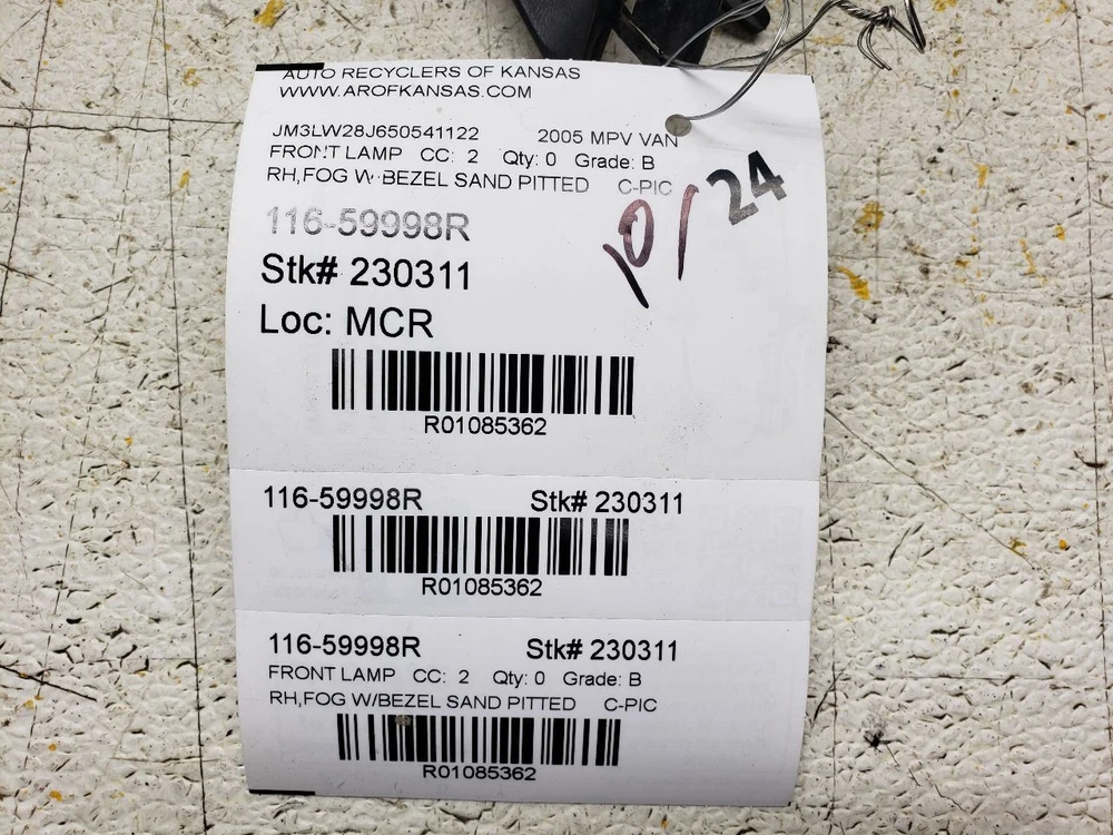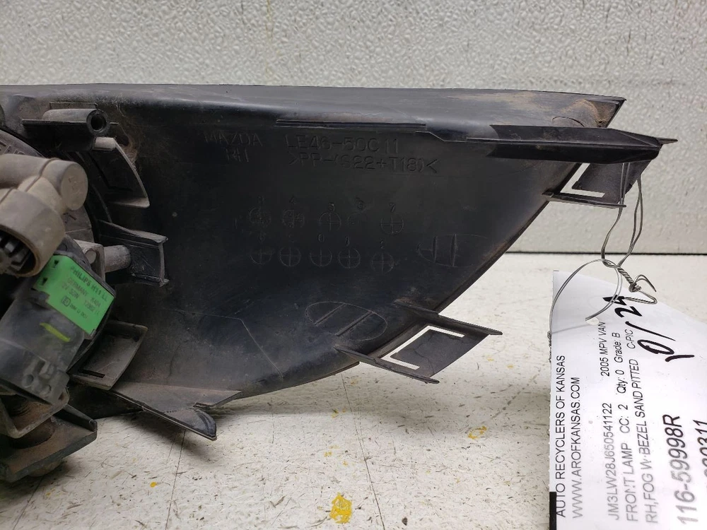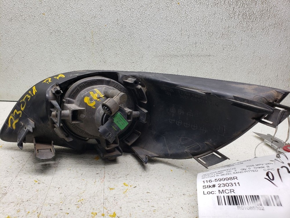 Welcome to our eBay Store! Passenger Corner/Park Light Fog-driving Fits 06-12 MAZDA MX-5 MIATA 1085362 Description Please read the entire listing before bidding. Our parts are not new! We sell only recycled automotive parts! All parts are tested to the fullest means possible to ensure only the highest quality products are listed in our eBay Store. We make every effort to provide you with the best photos of the product listed. L or LH denotes drivers side. R or RH denotes passenger's side. Donor Vehicle VIN: JM3LW28J650541122 Model: MPV VAN Year: 2005 Mileage: 285000 (0 = not available or unknown) Stock Number: 230311 Store Number: 1 Part Detail Part Grade: B Part Category: U Part Placement: Passenger/Right Notes: RH,FOG W/BEZEL SAND PITTED C-PIC This part will fit these makes and models with these options MAZDA 5 06-10 Fog-Driving; (bumper mounted), R. MAZDA 6 06-08 Fog-Driving; (bumper mounted), R. MAZDA CX-7 07-09 Fog-Driving; R. MAZDA MPV 04-06 Fog-Driving; (bumper mounted), bar grille, R. MAZDA MX-5 MIATA 06-12 Fog-Driving; R. WARRANTY / GUARANTEE Most parts we sell through eBay Motors come with a 30-day money back guarantee unless otherwise stated. The 30 day period starts when you take possession of the part. No labor warranty is provided. In the event a part sold with a warranty fails to operate within the warranty period we will replace the part(s) with a functionally equivalent part or refund the part purchase price, at our option. To return an item you must contact us via eBay Message within the 30 day period to obtain a RMA number (return material authorization). Original shipping charges and return shipping charges are not refunded. Once you obtain an RMA number, ship the item back to Auto Recyclers of Kansas, 1200 E Macarthur, Wichita, KS 67216 along with the RMA number. SHIPPING NOTES ABOUT US HELP Auto Recyclers of Kansas ships to US addresses within the 48 states only via UPS ground. International orders are sent via ebay's Global Shipping Program . Pick up at our facilities is available. Please message us prior to your purchase to arrange pick up. Items will be shipped within 1-2 days of purchase. Please allow up to 10 days for delivery unless item falls under ebay's Guaranteed Delivery p rogram. Most areas in the US are within 5 days. If an item arrives damaged, please contact us via eBay Message within 24 hours for instructions. If you have a question about a part please contact us BEFORE purchasing. Our main contact method is by eBay Messages. We try to answer all messages within 24 hours. If we are unable to answer your questions before the listing ends the item will be re-listed again soon for you to purchase. Core Charge. Core is an acronym for ‘Cash On Return’. A core charge is sometimes applied to rebuildable parts such as engines or alternators that can be redeemed for a portion of their original price. If the part you are purchasing has a core charge applied, it will be noted in the description. Parts Grading. A standard code system is used to communicate the condition and quality of a part between automotive recyclers, automotive repair shops, and insurers. Knowing how these codes are used will help you understand whether the part meets your expectations before you buy it and what you can expect from the part when you receive it. A Grade - The highest quality part. It is of low miles and/or exceptional condition for its age. B Grade - The second level quality part. It is of average miles and normal condition for its age. C Grade - The third level quality part. It has high miles and/or light damage. No Grade - A part that has not yet been graded.