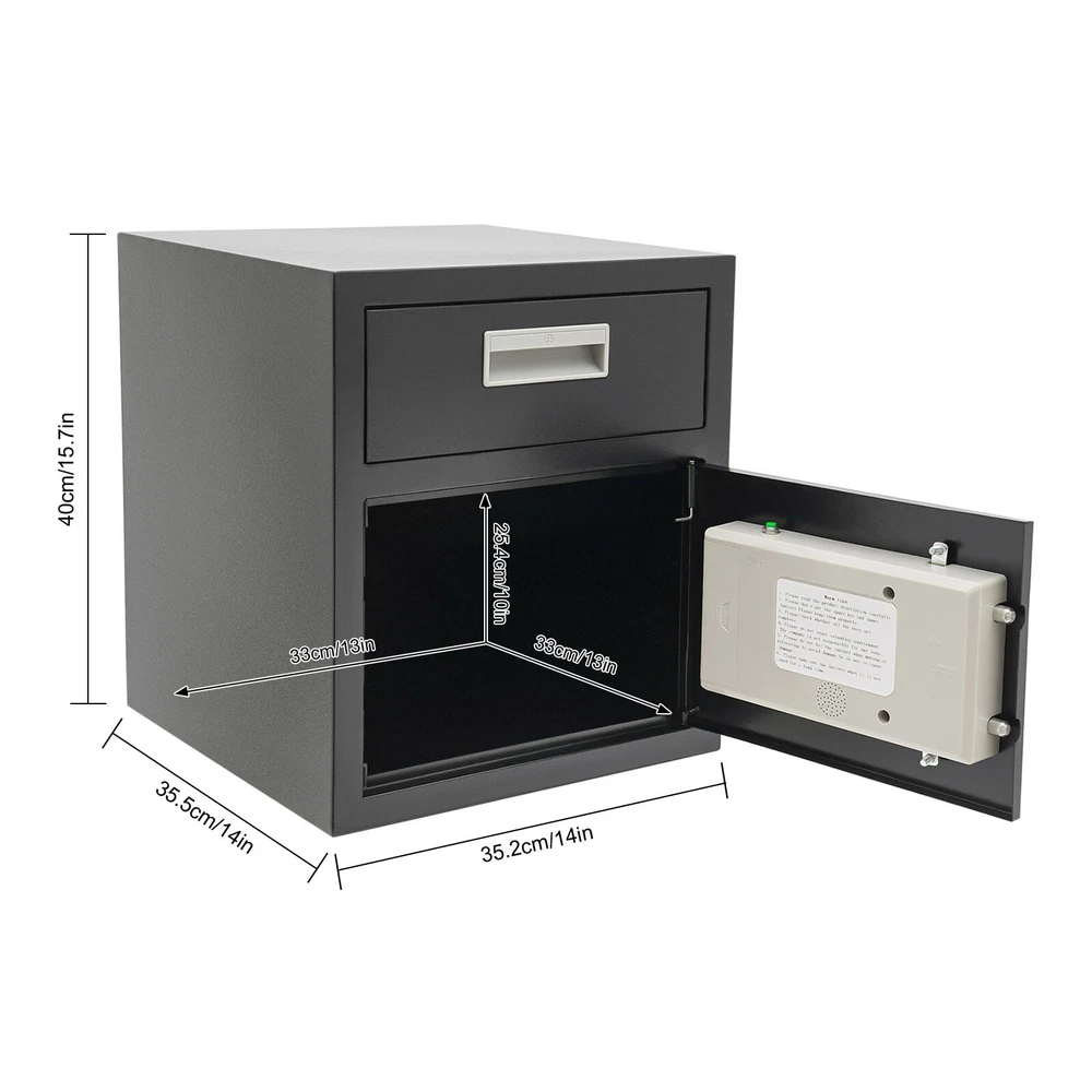 0.64ft³ Drop Box for Money&Mail Drop Slot Safe Cash Depository Safe Black W/Keys Description A high-quality safe can enhance your sense of security even more. This safe is made of sturdy steel and has strong reliability. The sturdy anti-theft lock can protect your valuable property, and the intelligent alarm mechanism allows you to keep an eye on its status at all times. Having this high-quality safe allows you to confidently go out. Key Features Build to Last: It is made of sturdy and thickened steel plates, and adopts laser cutting and galvanizing processes, with the advantages of high strength, rust resistance, and impact resistance, providing you with long-lasting and reliable protection. Large Capacity: The large size of 14*14*15.7 inches provides you with 0.64ft³ of space to help you organize important items and reduce clutter. The wide top can also be used for temporary storage of small items. Powerful Protection: The sturdy lock, 1mm thickened material, three types of unlocking keys((fingerprint, key, password)), and high-quality lock tongues provide your valuables with anti-theft protection. Intelligent Alarm Mechanism: If the password is entered incorrectly three times, an alarm will sound and it will automatically lock for 1 minutes. An alarm will also sound when the battery is low. The intelligent alarm mechanism enhances its security. Convenient to Use: The delivery port with a large opening angle allows you to deliver important items into the safe without opening the door, making it more convenient to use. Easy Installation: Thanks to its pre-drilled mounting holes and screws, you can mount this product on the wall or you can directly place it on the floor for more flexibility and convenience. Nice Appearance: The classic black and smooth lines give the product a sense of modernity and fashion, which can blend with most home and office decoration styles. Customer Service: Communication is the best way to solve problems. If you have any problems, please feel free to contact us. We will reply and solve the problem for you as soon as possible. Details Round Corners: The smooth corners can better ensure safety during installation and use. Practical Handle: The handle design on the delivery port makes it easy for you to open and drop items. Application It is an ideal choice for families, offices, hotels, schools, hospitals, shopping malls, banks, and restaurants to store valuable assets and belongings, such as money, check payments, files, documents, birth certificates, social security cards, coins, etc. Specification Color: Black Style: Modern Material: Steel Process: Laser Cutting, Galvanizing Shape: Rectangular Assembly Required: No Mounting Type: Wall Mount, Floor Mount Unlocking Methods: Password, Fingerprint, Key Capacity: 0.018m³/0.64ft³ Steel Board Thickness: 1mm/0.04in Battery Type: 4*AA Batteries(Not Included) Safe Inner Size: 33*33*25.4cm/13*13*10in Product Size: 35.2*35.5*40cm/14*14*15.7in Package Size: 42.2*42.2*47cm/16.61*16.61*18.5in Gross Weight: 8.5kg/18.74 lbs Net Weight: 7.6kg/16.76 lbs Package Included 1* Safe 4* Keys 1* Spare Battery Box 1* English Manual All Accessories for Assembly Notes 1.Please read the manual carefully before using it and pay attention to the dimensions of this safe before purchasing. 2.It is advisable to set the combination when the safe door is open. After setting the code, you should enter the new code several times. The door can be locked after confirmation. You can change the password to their specific password after purchasing a new safe. Please refer to the manual for the change method. 3.Please keep the spare key and spare battery(not included) in a safe place. 4.Please check that all keys are complete. 5.Please do not leave large amounts of cash and valuables unattended. 6.When moving and relocating, please do not hit the safe to avoid damage. 7.When not in use for a long time, please remove the battery from the battery box. 8.Please bring your own 4*AA batteries. 9.Please allow the slight color difference caused by the shooting light and 1-3cm error due to manual measurement, and make sure you do not mind before ordering. Payment Delivery details Terms of sales About us Contact us Payment We accept ebay payment 。 Fees such as import duties, taxes are not included in the item price or shipping costs. These charges are the buyer's responsibility. Delivery details Shipping: 2-9 working days to: USA Terms of sales We maintain high standards of excellence and strive for hundred percent customer satisfaction. Feedback is very important to us. We hope that you contact us immediately before you give neutral or negative feedback, so that we can address your concerns. It is impossible to address issues if we do not know about them! About us Your satis faction is our ultimate goal. We work hard to earn your trust and future business. Our certified technicians have tested each item before shipping. The unit comes with 1 year limited warranty on all manufacturing defects. a) If you receive a defective item, you may return it or ask for a discount. Please contact us within 14 days after you receive the package. b) What you returned must be intact and in its original packaging as re? u. Customer is responsible for shipping costs of the returned item. c) We will cover the cost of shipping back t with the shipping rate indicated in the registration page. We will send you a new unit or refund the full payment you paid. Thank you. Contact us Business Hour Business Hour: Monday To Friday: 8:30 AM to 5:00 PM (Beijing China time) Due to time zones, our reply to your questions may not be immediately. But within above working time, we will reply your email within 24 hours. If it's non-workdays, please kindly be patient and wait till Monday. Please contact us with ebay message. Please feel free to contact us if you have any questions. Monday To Friday: 8:30 AM to 5:00 PM (Beijing China time) Due to time zones, our reply to your questions may not