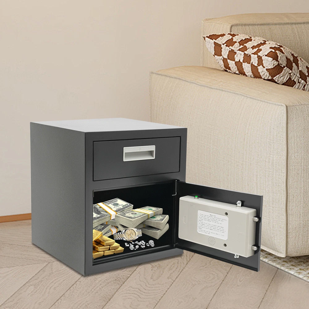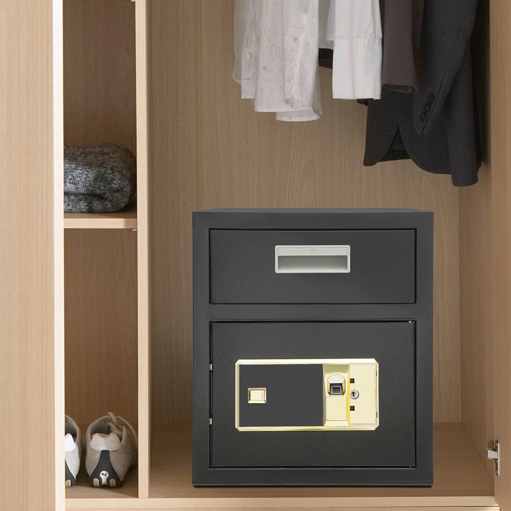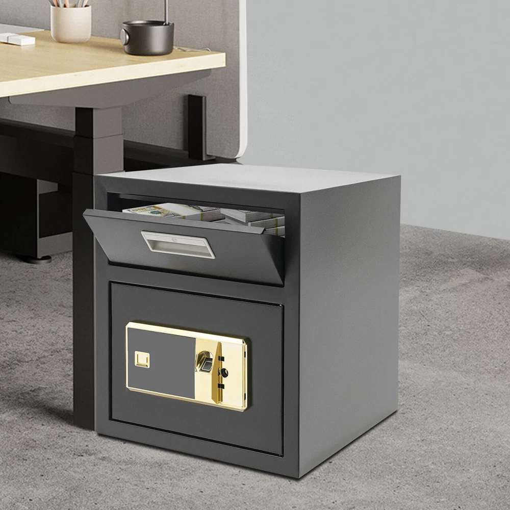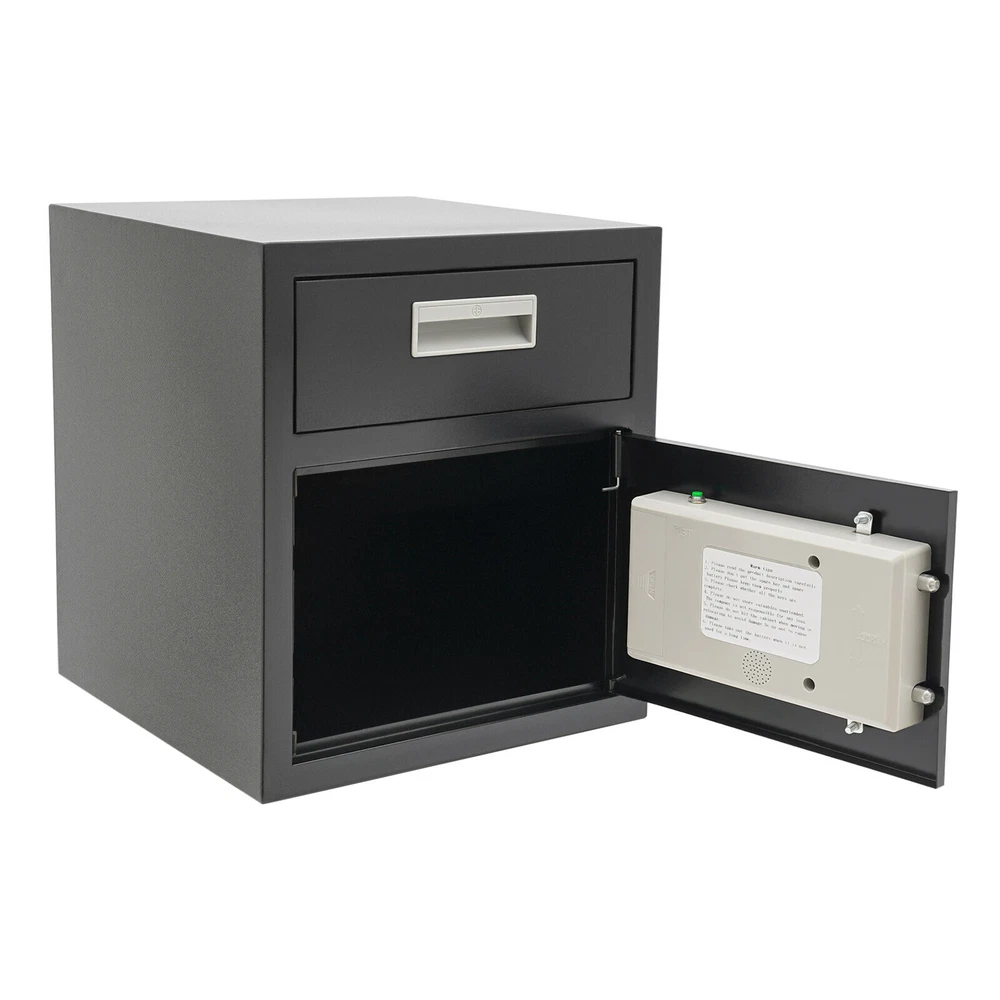 Specification Color: Black Style: Modern Material: Steel Process: Laser Cutting, Galvanizing Shape: Rectangular Assembly Required: No Mounting Type: Wall Mount, Floor Mount Unlocking Methods: Password, Fingerprint, Key Capacity: 0.018m³/0.64ft³ Steel Board Thickness: 1mm/0.04in Battery Type: 4*AA Batteries(Not Included) Safe Inner Size: 33*33*25.4cm/13*13*10in Product Size: 35.2*35.5*40cm/14*14*15.7in Package Size: 42.2*42.2*47cm/16.61*16.61*18.5in Gross Weight: 8.5kg/18.74 lbs Net Weight: 7.6kg/16.76 lbs Package Included 1* Safe 4* Keys 1* Spare Battery Box 1* English Manual All Accessories for Assembly 0.64ft3 Drop Box for Money&Mail Drop Slot Safe Cash Depository Safe Black W/Keys Description A high-quality safe can enhance your sense of security even more. This safe is made of sturdy steel and has strong reliability. The sturdy anti-theft lock can protect your valuable property, and the intelligent alarm mechanism allows you to keep an eye on its status at all times. Having this high-quality safe allows you to confidently go out. Key Features Build to Last: It is made of sturdy and thickened steel plates, and adopts laser cutting and galvanizing processes, with the advantages of high strength, rust resistance, and impact resistance, providing you with long-lasting and reliable protection. Large Capacity: The large size of 14*14*15.7 inches provides you with 0.64ft³ of space to help you organize important items and reduce clutter. The wide top can also be used for temporary storage of small items. Powerful Protection: The sturdy lock, 1mm thickened material, three types of unlocking keys((fingerprint, key, password)), and high-quality lock tongues provide your valuables with anti-theft protection. Intelligent Alarm Mechanism: If the password is entered incorrectly three times, an alarm will sound and it will automatically lock for 1 minutes. An alarm will also sound when the battery is low. The intelligent alarm mechanism enhances its security. Convenient to Use: The delivery port with a large opening angle allows you to deliver important items into the safe without opening the door, making it more convenient to use. Easy Installation: Thanks to its pre-drilled mounting holes and screws, you can mount this product on the wall or you can directly place it on the floor for more flexibility and convenience. Nice Appearance: The classic black and smooth lines give the product a sense of modernity and fashion, which can blend with most home and office decoration styles. Customer Service: Communication is the best way to solve problems. If you have any problems, please feel free to contact us. We will reply and solve the problem for you as soon as possible. Details Round Corners: The smooth corners can better ensure safety during installation and use. Practical Handle: The handle design on the delivery port makes it easy for you to open and drop items. Application It is an ideal choice for families, offices, hotels, schools, hospitals, shopping malls, banks, and restaurants to store valuable assets and belongings, such as money, check payments, files, documents, birth certificates, social security cards, coins, etc. Specification Color: Black Style: Modern Material: Steel Process: Laser Cutting, Galvanizing Shape: Rectangular Assembly Required: No Mounting Type: Wall Mount, Floor Mount Unlocking Methods: Password, Fingerprint, Key Capacity: 0.018m³/0.64ft³ Steel Board Thickness: 1mm/0.04in Battery Type: 4*AA Batteries(Not Included) Safe Inner Size: 33*33*25.4cm/13*13*10in Product Size: 35.2*35.5*40cm/14*14*15.7in Package Size: 42.2*42.2*47cm/16.61*16.61*18.5in Gross Weight: 8.5kg/18.74 lbs Net Weight: 7.6kg/16.76 lbs Package Included 1* Safe 4* Keys 1* Spare Battery Box 1* English Manual All Accessories for Assembly Notes 1.Please read the manual carefully before using it and pay attention to the dimensions of this safe before purchasing. 2.It is advisable to set the combination when the safe door is open. After setting the code, you should enter the new code several times. The door can be locked after confirmation. You can change the password to their specific password after purchasing a new safe. Please refer to the manual for the change method. 3.Please keep the spare key and spare battery(not included) in a safe place. 4.Please check that all keys are complete. 5.Please do not leave large amounts of cash and valuables unattended. 6.When moving and relocating, please do not hit the safe to avoid damage. 7.When not in use for a long time, please remove the battery from the battery box. 8.Please bring your own 4*AA batteries. 9.Please allow the slight color difference caused by the shooting light and 1-3cm error due to manual measurement, and make sure you do not mind before ordering. Payment Delivery details Terms of sales About us Contact us Payment We accept ebay payment 。 Fees such as import duties, taxes are not included in the item price or shipping costs. These charges are the buyer's responsibility. Delivery details Shipping: 2-9 working days to: USA Terms of sales We maintain high standards of excellence and strive for hundred percent customer satisfaction. Feedback is very important to us. We hope that you contact us immediately before you give neutral or negative feedback, so that we can address your concerns. It is impossible to address issues if we do not know about them! About us Your satis faction is our ultimate goal. We work hard to earn your trust and future business. Our certified technicians have tested each item before shipping. The unit comes with 1 year limited warranty on all manufacturing defects. a) If you receive a defective item, you may return it or ask for a discount. Please contact us within 14 days after you receive the package. b) What you returned must be intact and in its original packaging as re? u. Customer is responsible for shipping costs of the returned item. c) We will cover the cost of shipping back t with the shipping rate indicated in the 