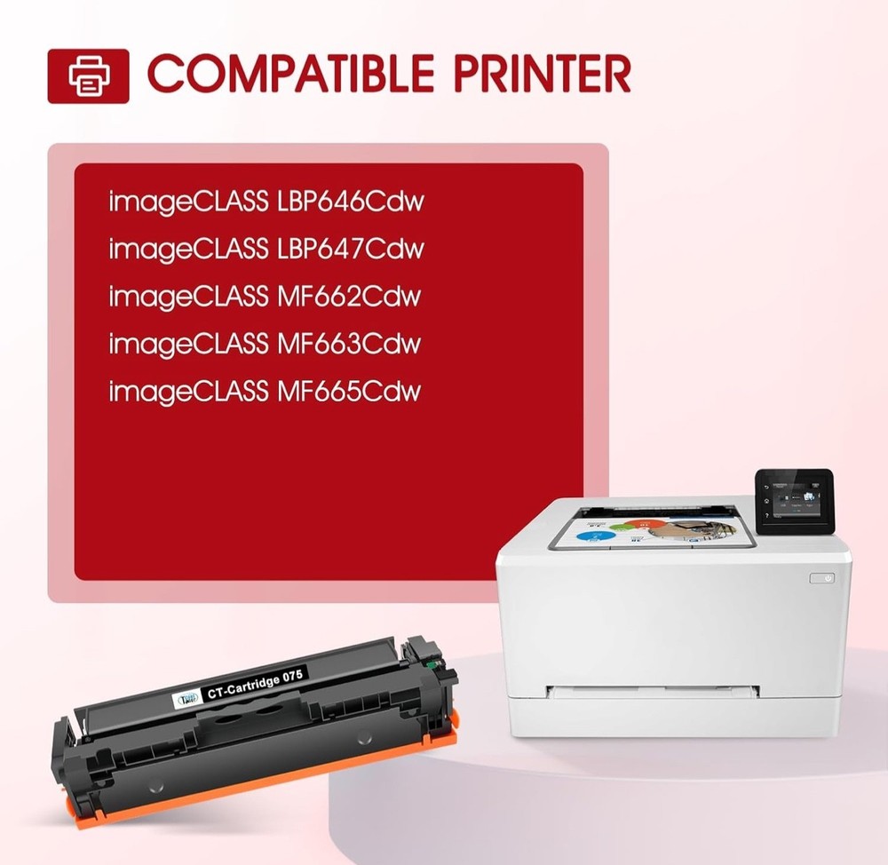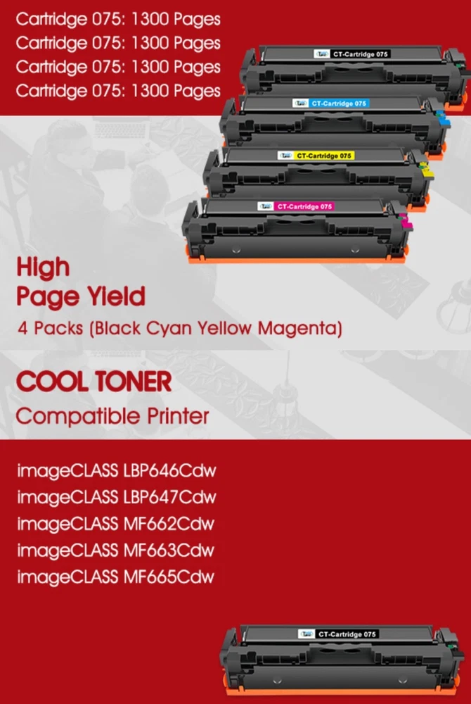 #3020 075 Toner Cartridge Set 075H LBP646Cdw MF665CDW MF662CDW Compatible Replacement for Canon Color ImageCLASS MF663Cdw LBP647Cdw MF660c LBP640c Printer 4 Pack High Yield Ink (Black Cyan Yellow Magenta) Brand Cool Toner Color 075 Black Cyan Magenta Yellow Item Weight 4.98 Pounds Compatible Devices Color Imageclass MF665CDW MF662CDW MF663Cdw LBP646Cdw LBP647Cdw Printer Manufacturer Cool Toner (NOT Canon OEM) for 075 075H Cool Toner compatible 075 075H CRG-075 CRG-075H toner provide high-quality printing and produce excellent results Package contents: 4 packs 075 075H toner cartridge set Page yield: 1,300 pages for 075 black toner and 1,300 pages per 075 color toner at 5% coverage (Letter/A4), replacement for Color Imageclass LBP646Cdw MF665CDW MF662CDW toner cartridges Compatible for printers: color imageclass MF665CDW MF662CDW MF663Cdw LBP646Cdw LBP647Cdw printer High quality: Cool Toner 075 075H toner cartridge set committed you with consistency, vibrant color, sharp printin