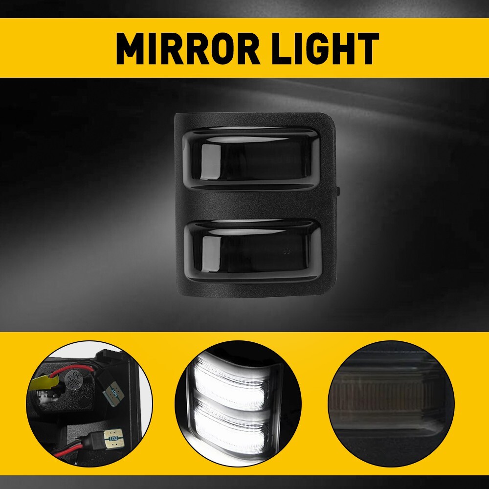 Absolutely love these smoked LED mirror lights! The white lighting is crisp and bright, and the install was a breeze—just plug and play. They look sleek and give my truck a modern upgrade. Super durable and waterproof, perfect for any weather. No issues with fitment, just make sure your model matches. Great quality for the price, definitely worth it!