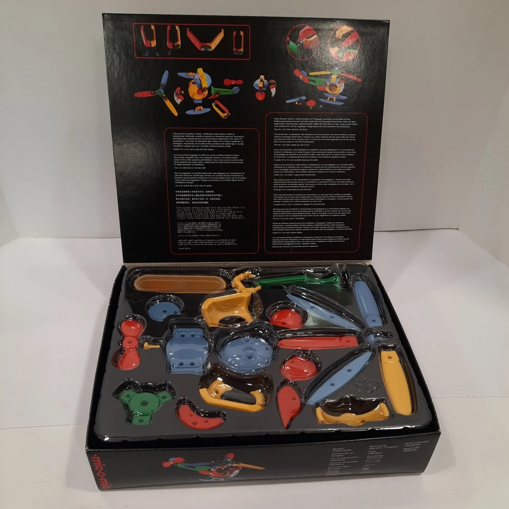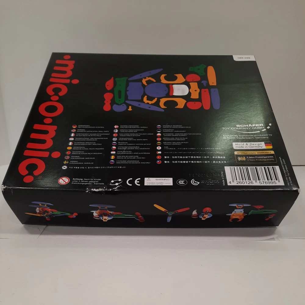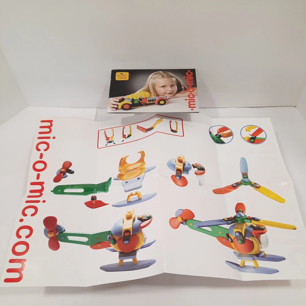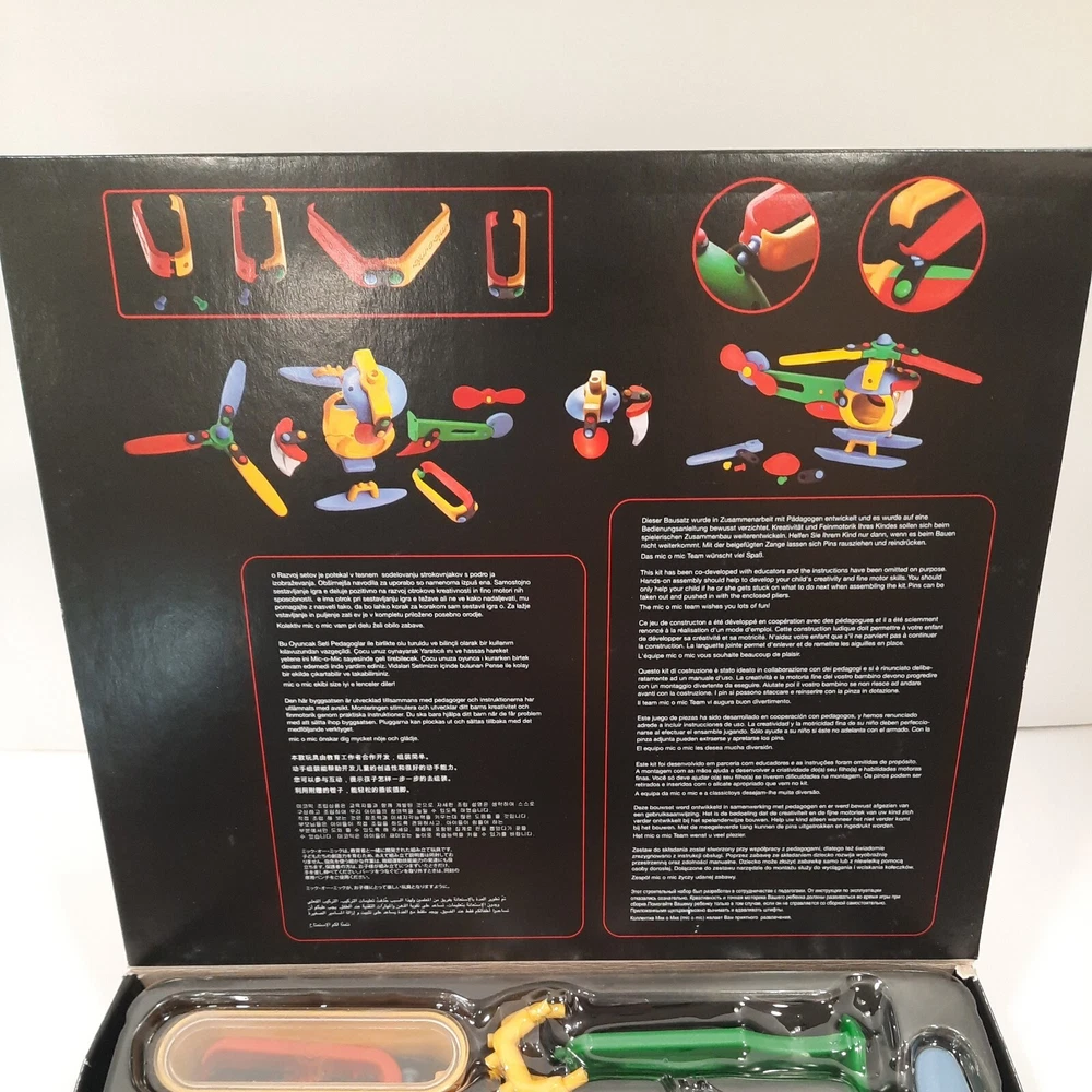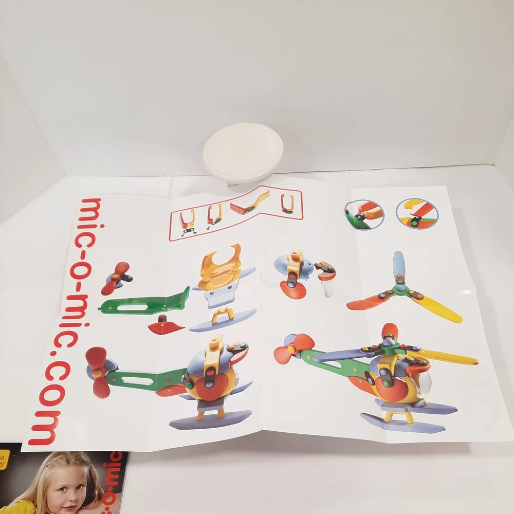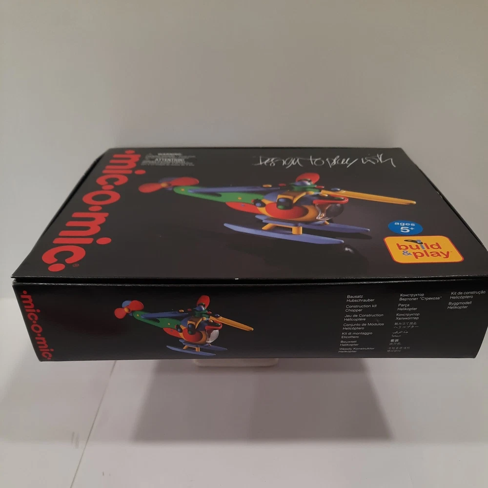 089.289 Chopper, Helicopter Mic-o-Mic Construction Kit, by Schafer Toy Company Germany - Ages 5+ New, never opened parts. Box has a couple of wear points, I will show in pictures. Complete with assembly paperwork. Nice Christmas Gift Idea for Kids Chopper, Mic-o-Mic Construction Kit package measures approximately10" x 8.5" x 2". The Chopper consists of Red, Green, Yellow, Blue and Black plastic parts. Chopper Construction Kit is made to be built and disassembled multiple times but some builders will construct it to be used as a display piece. Mic-o-Mic is produced by Schafer Toy Company. Mold & Design are made in Germany while the kit is Made in China. Suggested for Ages 5+.