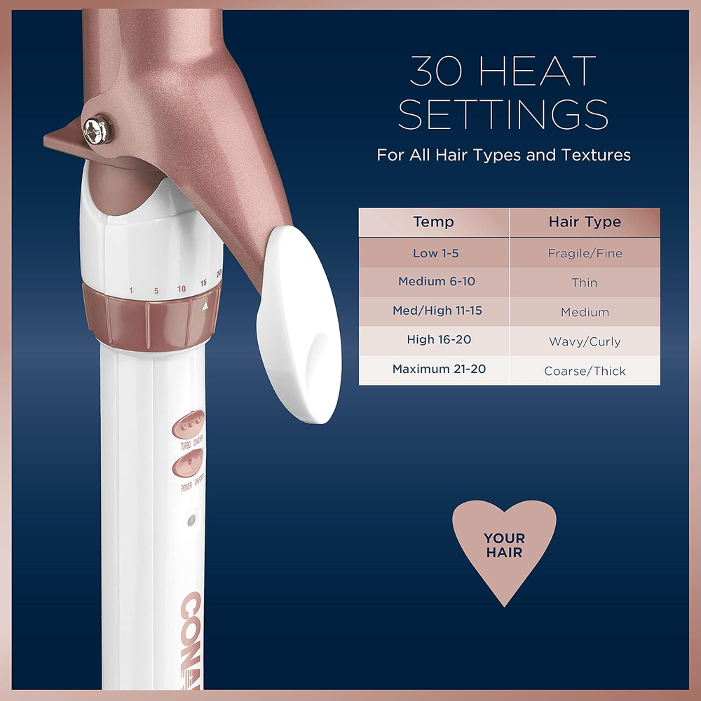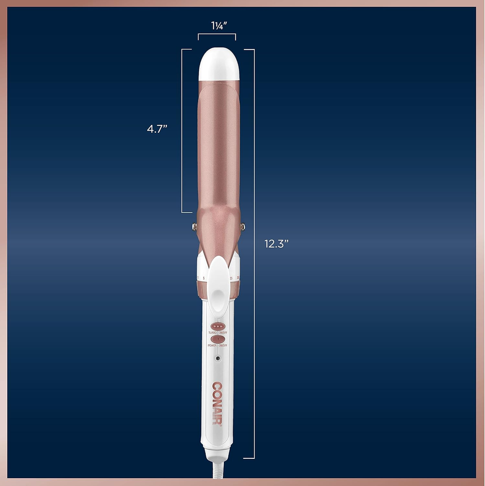 Ceramic Curling Iron: Designed to create flowy, loose curls, this 1.25 inch curling iron features higher ceramic content for even heat and gorgeous, long lasting styles with less frizz Versatile Function: This curling iron boasts 30 heat settings with instant heat up to 375 degree F and Turbo Heat boost Up to 27°F burst of heat for difficult to style spots, plus a unique cool tip for safe, easy handling and an Auto Off feature Easy Operation: This double ceramic curling iron offers the best in heat and damage protection and anti frizz control; It features recessed buttons to prevent accidental shutoff and dual voltage for international travel. Heating Time: 60 seconds Innovative Styling Tools: From curling irons and wands to flat irons, hot air brushes, auto curlers and more; Conair makes high quality styling tools for all hair types Conair Hair Care: Since 1959, we have made innovative small appliances, hair styling tools, and more; Our hair care line includes high quality hair dryers, brushes, styling tools, and hair accessories Cool tip for easy handling., | Recessed buttons prevent accidental shutoff., | Dual voltage Introducing the new Double Ceramic 11/4 inch rose gold curling Iron designed to create flowy, loose curls. The higher ceramic content offers even heat and gorgeous, long lasting styles with less frizz. With 30 heat settings that instantly heat up to 400 Degree including Turbo Heat boost for difficult to style spots. The unique cool tip offers safe, easy handling and auto off feature. Includes dual voltage for international travel and a bonus carry pouch for packing.