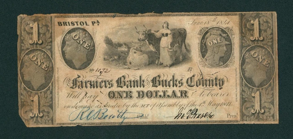 Paper Currency Paper Currency Click images to enlarge Description Hello $1 1841 The Farmers Bank of Bucks County - Bristol, Pennsylvania Obsolete Note GOOD This note is cross cut canceled. This means there are 2 crosses cut in the center. Edge damage with very few pinholes. (Check the Currency Grading Scale at the bottom of the listing so you will know the exact condition that your item is in.) CLICK HERE Visit My eBay Store: ronaldjh2003 CLICK HERE View My Feedback CLICK HERE Add me to your Favorite Sellers Accept returns Combine shipping - Combine items for up to 7 days MISSOURI BUYERS MUST PAY SALES TAX 7.95%. In most other states eBay is required to collect sales tax. You can read more about eBay and sales tax here https://www.ebay.com/help/buying/paying-items/paying-tax-ebay-purchases?id=4771 Currency Grading Scale: Gem Crisp Uncirculated (or Gem CU): A crisp, perfectly centered example that has perhaps one tiny flaw that limits the grade-perhaps a microscopically frayed corner, or an almost imperceptible crinkle in the paper. The note must be absolutely original, with bold embossing and bright colors. Any flaw that is readily evident, such as a noticeable counting crinkle or slightly imperfect centering, will prevent a note from receiving a Gem CU grade. Notes in this and any Uncirculated grade will, of course, have absolutely no folds or bends. Choice Crisp Uncirculated (or Choice CU): A note in this grade will be a strictly Uncirculated note, with no folds or bends present even under close scrutiny. The paper quality and eye appeal will be above average for the issue, and any flaws present will be minor in nature. Imperfect centering is acceptable at this grade level, although any note with severe centering problems cannot attain this grade. A counting crinkle or two is acceptable, as well as a microscopically frayed corner or two. Any combination of these or other problems would drop a note into a lower category. A Choice CU note should be a pleasing, original example with no major distractions that are readily apparent. Crisp Uncirculated (or CU): A note in this grade must be strictly Uncirculated-with no folds, bends, or wrinkles present, even when viewed very closely under a strong light. A bent corner tip may be acceptable at this grade level if there are no other flaws, but only if the bend is within the margin and it does not affect the design. If the bend is large or there is more than one, the note cannot grade CU. Such a note may have centering problems, counting crinkles, or microscopically rounded corners, but the note must be strictly free of folds or bends. A note that is otherwise Choice or Gem CU but has been processed or pressed might fall into this category. Choice Almost Uncirculated (or Choice AU): A note in this grade will be a "just miss" for a Choice CU grade or higher. It will have above average eye appeal and will be attractive for the issue, but a bent corner or light vertical centerfold will keep it from an Uncirculated grade. Two light vertical bends are acceptable for this grade, as long as the surface of the paper is not "broken." More than one light fold or a heavy fold or crease will drop the note into a lower grade classification. Almost Uncirculated (or AU): An AU note will have one or more light folds that are not heavy in nature or obtrusive to the overall appearance. Three light vertical bends would be acceptable for this grade if they do not "break" the surface of the paper, but no more than two light folds may be present. One heavy fold or crease may be present at this grade, but two heavy folds or creases will drop the note to a lower grade level. Extremely Fine (or XF): A note in this grade will be bright, fresh, crisp, and attractive, but a few light folds or bends may be present. The overall eye appeal will be above average, and only the slightest soiling may be visible. A note in this grade might have a few light folds or several very minor bends, or a couple of vertical creases may be present. A note with a horizontal fold and three vertical folds cannot technically grade XF, although a very light horizontal bend that does not "break" the surface of the paper might be acceptable at this grade level if the three vertical folds are not heavy and there are no other apparent flaws. A typical XF note may have a couple of pinholes, but any larger holes would prevent a note from reaching this grade level. Very Fine (or VF): A VF note should have nearly full remaining crispness, although several folds, wrinkles, or other signs of circulation may be present. Mild soiling might be apparent, but it should not be serious. No tears, stains, or other impairments should be readily apparent, and the note should still have nice eye appeal. Several minor pinholes may be visible when the note is held to a light. The corners may be slightly frayed or slightly rounded at this grade level, but the paper should retain nearly full crispness and there should be no loss of color in the design. Fine (or F): A note in this grade will resemble most notes that have spent considerable time in circulation. The piece will have lost some of its crispness, but the paper will still be solid. (A limp note without any crispness will classify at a lower level.) The corners may be slightly frayed or rounded, and the edges may also be frayed. Pinholes may be readily apparent, but none should be large or obtrusive. A few minor edge splits are not uncommon in this grade, but they typically will be within the margin and not affect the design. No major stains or tears may be present, although a stray pencil marking or light teller stamp will not affect the grade at this level if it is not dark or obtrusive. Very Good (or VG): At this grade classification, a note will be heavily worn with slightly rounded corners, frayed edges, or slightly rough margins. The paper will be intact, however, and no large pieces may be missing. A few edge splits may be apparent, although they must not