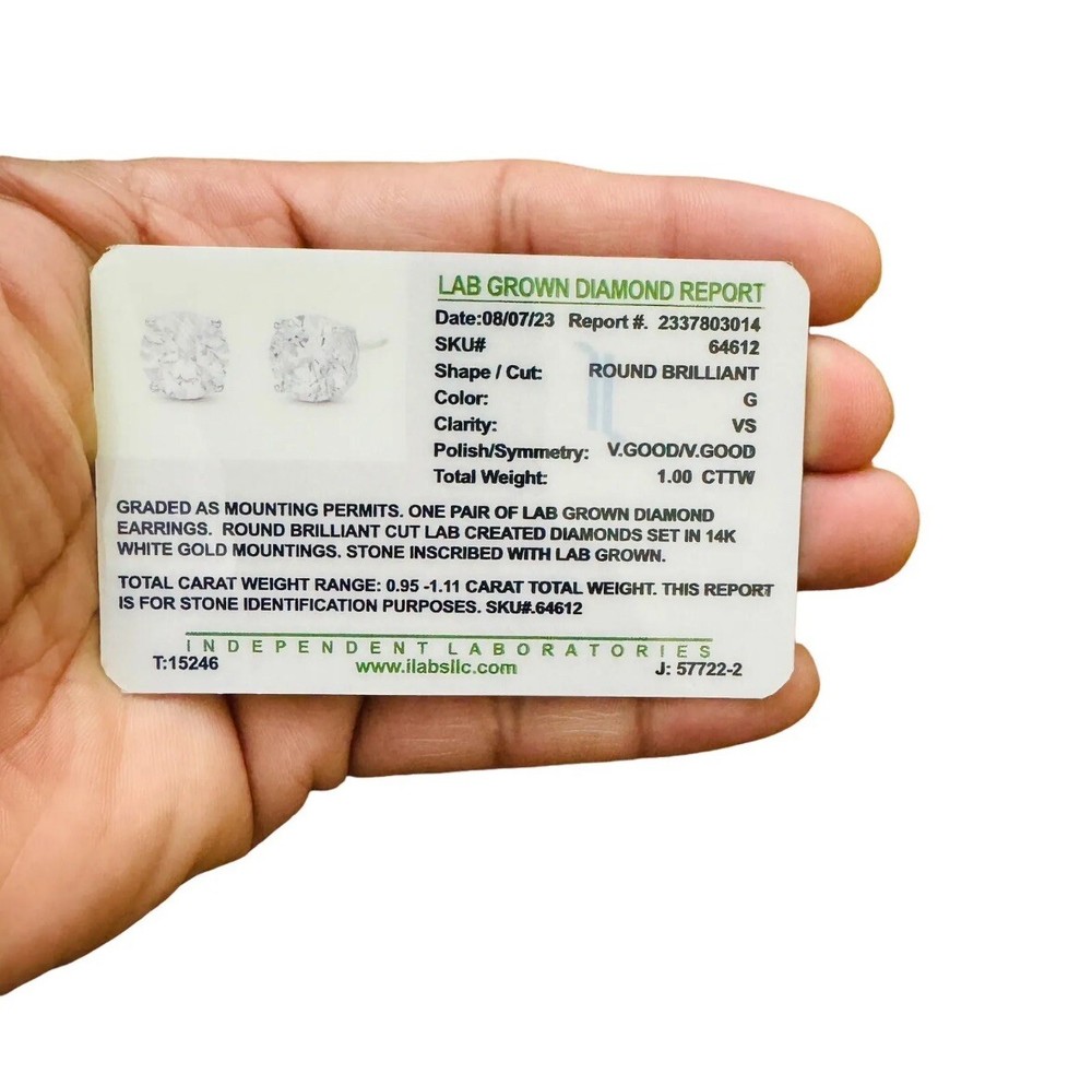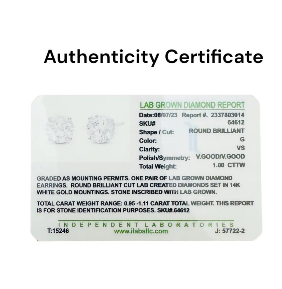 1.00 Carat Briallint Round Cut Real Lab Created Diamond Solitaire Stud Earrings in Solid 14k White Gold Value $2995.00 These exquisite real lab created diamond stud ear rings are crafted out of solid 14k White Gold and brilliant lab created diamonds stud earrings. This design of stud earrings is one of the most desired and classy of all. They are set in a unique, secure, 4 prong designer style setting with Screw backs with 8mm each studs come with certified appraisal. Brand --> Hallmark Jewelers Total Carat Weight (TCW) --> 1.00 Carats (0.50 Ct. Approx. 6.00mm each) Metal --> Real, Genuine 14k Solid White Gold Metal Purity --> Solid 14k White Gold Diamond Type --> Real Lab Created Diamond (Will Pass Diamond Test) Design --> Studs Main Stone Shape --> Round , Brilliant Cut Diamond Color --> F/G Diamond Clarity --> VS1/VS2 Setting --> 4-Prong Designer Style Type of Post or Back --> Screw Back Number of Stones --> 2 Country of Manufacture --> United States Origin of Stones --> Lab Grown Real Diamond (Certified Diamond) Availability --> Limited Quantity So What Will I Be Receiving in the Mail? A Pair of Genuine Solid 14k White Gold Brilliant Cut Stud Earrings .