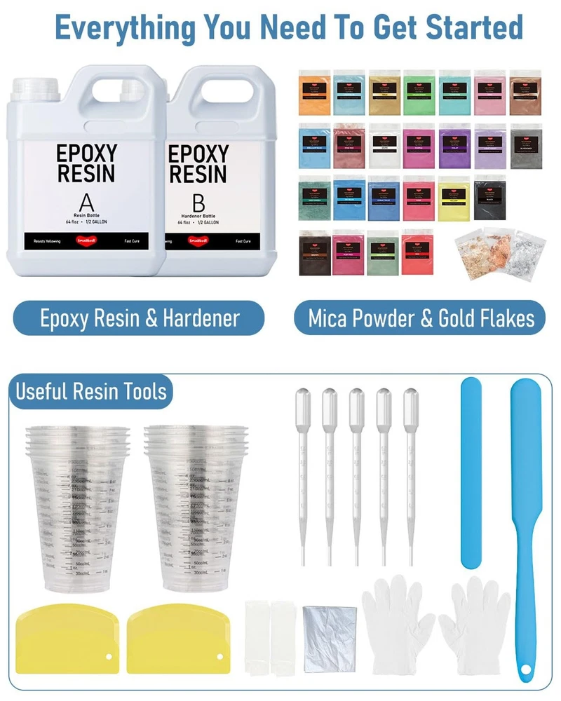 1 Gallon Epoxy Resin Kit with 24 Colors Mica Powder, Gold Foil, Cups & Stick, Crystal Clear Resin Beginner Supplies for Coating Casting Table, Molds, Jewelry Making, DIY Art Craft, 1:1 Ratio Product Details Size: 1 gallon Brand: Smallbudi MPN: BD041 UPC: Does not apply EAN: Does not apply Brand: Smallbudi Color: 24 colors Theme: Fantasy Material: Epoxy resin Seasons: All Seasons Package Dimensions : 10.79 x 9.65 x 6.3 inches; 11.13 Pounds Item model number : BD041 Date First Available : August 29, 2023 Manufacturer : SMALLBUDI CO,LTD Best Sellers Rank: #9,004 in Arts, Crafts & Sewing (See Top 100 in Arts, Crafts & Sewing) #89 in Sculpture Molding & Casting Products #89 in Sculpture Molding & Casting Products Customer Reviews: 4.6 4.6 out of 5 stars 509 ratings All-in-One Epoxy Resin Kit Everything You Need to Start Creating. This complete epoxy resin kit includes 64 oz resin + 64 oz hardener, 24 vibrant mica powder colors, 3 gold foil flakes, measuring cups, gloves, silicone sticks, pipettes, scrapers, apron, tablecloths & a detailed manual. Designed for beginners and pros alike - no need to purchase extra supplies, just open the box and start crafting Crystal Clear, Bubble-Free & Anti-Yellowing - Formulated with advanced clarity technology, our epoxy resin delivers a flawless, high-gloss finish without bubbles or imperfections. UV-resistant and non-yellowing over time, your resin art stays vibrant, transparent, and rock as hard - perfect for coating, casting, and preserving every detail of your masterpiece Non-Toxic & Food Safe Safe for All Creators. Made from premium, low-odor materials, this epoxy resin kit is certified non-toxic and conforms to ASTM D-4236 standards. Once cured, its safe for food contactideal for making coasters, serving trays, and kitchenware. No VOC emission, no fumessafe for both personal and classroom use Easy Operation, Smooth Finish Perfect for Beginners. Designed with a simple 1:1 mixing ratio (by volume), our epoxy resin is self-leveling, self-degassing, and beginner-friendly. Just mix by 1:1 volume ratio, stir slowly for 35 minutes, pour, and enjoy 45 minutes of working time before curing. Full cure in 24 hours with minimal effort and maximum results Versatile Applications For Art, Furniture & More. Whether you're pouring river tables, casting jewelry molds, coating wood, or designing custom gifts, this all-inclusive epoxy resin kit is perfect for DIY projects of any scale. Works beautifully with mica powder and foil for dazzling effectsunleash your creativity on wood, countertops, tumblers, and beyond