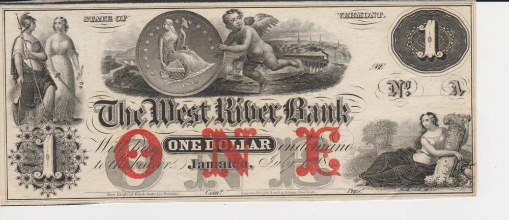 A genuine $1 Obsolete Note, West River Bank Note, Jamaica, Vermont, in CU Crisp Uncirculated Condition. The images used for this listing are stock photos from our inventory. Your purchase is guaranteed to match the quality of the product shown.