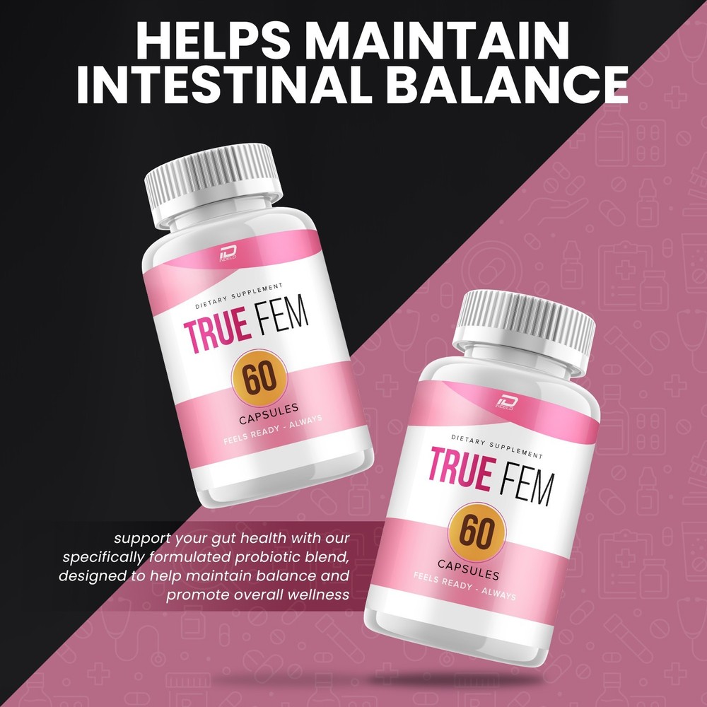 TrueFem Capsules provide feminine digestive support with their active ingredients including probiotics like Lactobacillus plantarum, Saccharomyces Boulardii, and Bifidobacterium longum. These capsules are designed for adult, unisex use in a convenient capsule formulation. With a total of 60 pills in a pack, TrueFem capsules offer all-natural relief for gut wellness and are manufactured in the United States. The unflavored capsules ensure a discreet and effective approach to digestive support. True Fem Capsules: A carefully formulated probiotic supplement with selected ingredients to complement your daily routine. True Fem Advanced Formula: Contains a blend of probiotics and natural ingredients, inspired by traditional wellness practices. TrueFem Supports Daily Wellness: Designed to be a simple addition to a balanced lifestyle, helping maintain overall well-being. True Fem No Artificial Additives: Crafted with carefully selected ingredients, free from unnecessary fillers or preservatives. True Fem Balance Digestion: Thoughtfully made to fit into a mindful wellness regimen.