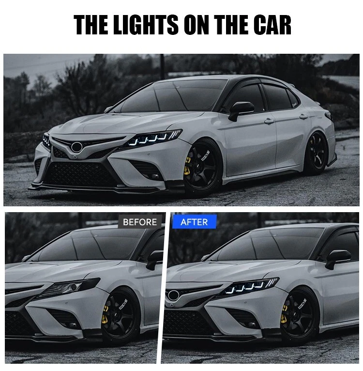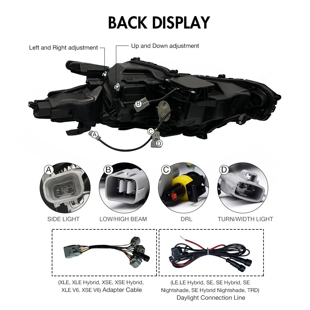 LED Headlight Assembly For 2018-2024 Toyota Camry Sequential Animation Lamp Fitment: For Toyota Camry SE/LE/TRD/XSE/XLE 2018-2024 ( Professional Installation is Highly Recommended ) ✅【Fitment】 Compatible with Toyota Camry 8th gen LE/SE/XLE/XSE/TRD 2018-2024 (OEM Part Number: 81150-06C20, 81110-06F60). Package includes complete set of headlights, one for each side. ✅【Sequential turning light】 The dynamic turn signal feature creates a flowing light pattern that catches the eye of other drivers, increasing visibility and safety. It adds a touch of sophistication to the vehicle, enhancing its overall aesthetics. ✅【Full LED headlights】 It provide brighter and clearer illumination, improving visibility and safety on the road. LED technology consumes less power compared to traditional headlights, resulting in lower fuel consumption and extended battery life. ✅【Dynamic head lights】The startup sequence creates a visually appealing light pattern that adds a high-tech and futuristic look to the vehicle. Seamlessly integrates into the startup sequence of the headlights, offering a smooth and cohesive transition that enhances the overall user experience. ✅【All-weather performance】Our front lamps pass the IP67 test, dust and water resistance rating allows the headlight assembly to perform consistently well in challenging weather conditions, including heavy rain, snow, and dusty environments. ✅【Plug & play】 LED headlights customized according to the original vehicle, perfectly fit your car, no modification needed. Once plugged in, the headlight assembly is ready for immediate use, allowing customers to enjoy the enhanced lighting performance without any delays. (Contact us for the instructions if not include.) ✅【Warranty】 With 3 Years warranty period, and comes with a risk-free 100% product quality and after-sales service guarantee. please feel free to contact us, if you meet any problem while using or installing, we will reply you within 24 hours. Note: Please confirm whether this car-lamps can fit your car before you purchase, if you are not sure, please contact us. Package includes: 1 Pair (Driver Side + Passenger Side) Headlight Assembly Set (Including some installation accessories) Features: Brand :TT-ABC Condition: 100% brand new Type: LED Headlight Assembly Material:High quality ABS Plastic+PC+PMMA Lighting Technology: LED Warranty:3 Year Function: Low/High Beam+DRL/Running Light+Turn Signal Start up: There are a few seconds of animation Superior, Lasting Visibility State-of-the-art design guarantees performancethat delivers excellent visibility. Made by a certified manufacturer using materials that meet strict OEM requirements. Using your factory supplied connector/harness will avoid cutting or modifying any wires.Benefits of LED making you safer on the road for other road users to see. The items have the same connections and wires with the original headlights. Easy to install still professional installation is recommended. Features:DOT-Certified, Durable, Easy Installation, High Quality, OE-Certified, SAE-Certified, Sealed Assembly, Waterproof, ISO-Certified, Dustproof and Sturdy Note: Please confirm the year of your car/light shape/ plug of your original lights whether these information as same as our lights, if you can't confirm it, please contact us. Please double check shipping address, We are not responsible for incorrect or undeliverable addresses.You can't change your shipping address after placing an order. Please Using your factory supplied connector/harness will avoid cutting or modifying any wires. We only provide electronic invoice "packing slip", if you need it, please note or contact us when you place an order. We will open the box and inspect the returned item to see if it is intact and the correct item before refunding you. If there is a problem with the product, please feel free to contact us, we can help you solve it as soon as quickly! Payment Delivery details After sales Contact us For tips Payment We only accept payment via eBay. Please make sure your eBay address is correct before you pay. Insufficient information will delay the order process so please read the invoice carefully during checkout. Delivery details To United States: 3-6 business days. Package will be sent out within 24 hours after the pament is received. Pick-up is unsupported servise. We will not be responsible for any delivery failure due to unclear address. Delivery is not available on weekends, public holidays or after business hours. After sales After-sale If it happens that the lights get moisture after you install them on your car, it would be normal for first time using. You just need to keep using for a period of days, the moisture will disappear. because there is inner air cycling in the lights as we design. As for headlights, you can also open the cover of low/high beam so that the moisture will out more quickly. If the moisture still exist, please feel free to send us message for help, we will try our best to help you. After you install, if you find that there have function does not work, please check if the harness is connected correctly, and exchange the left and right , If it still does not work, please rember take some photos or videos, please feel free to contact us. We will appreciate if you can takes some pictures or videos about your problem, and also send us the barcode of the products(every product we sell has a barcode on the backside of the light and outside of the package, it's very important for us to find the problem) If you open a request or case optionaly before communication, it would be hard for us to serve you. Contact us If you have any problem, please contact us or leave message for us for free. We will reply at once when convient. Don't worry, we always here waiting for your and like to help you. For tips There are some tips for you: 1. If There are any problems with the product, please contact with us before leaving any feedback or