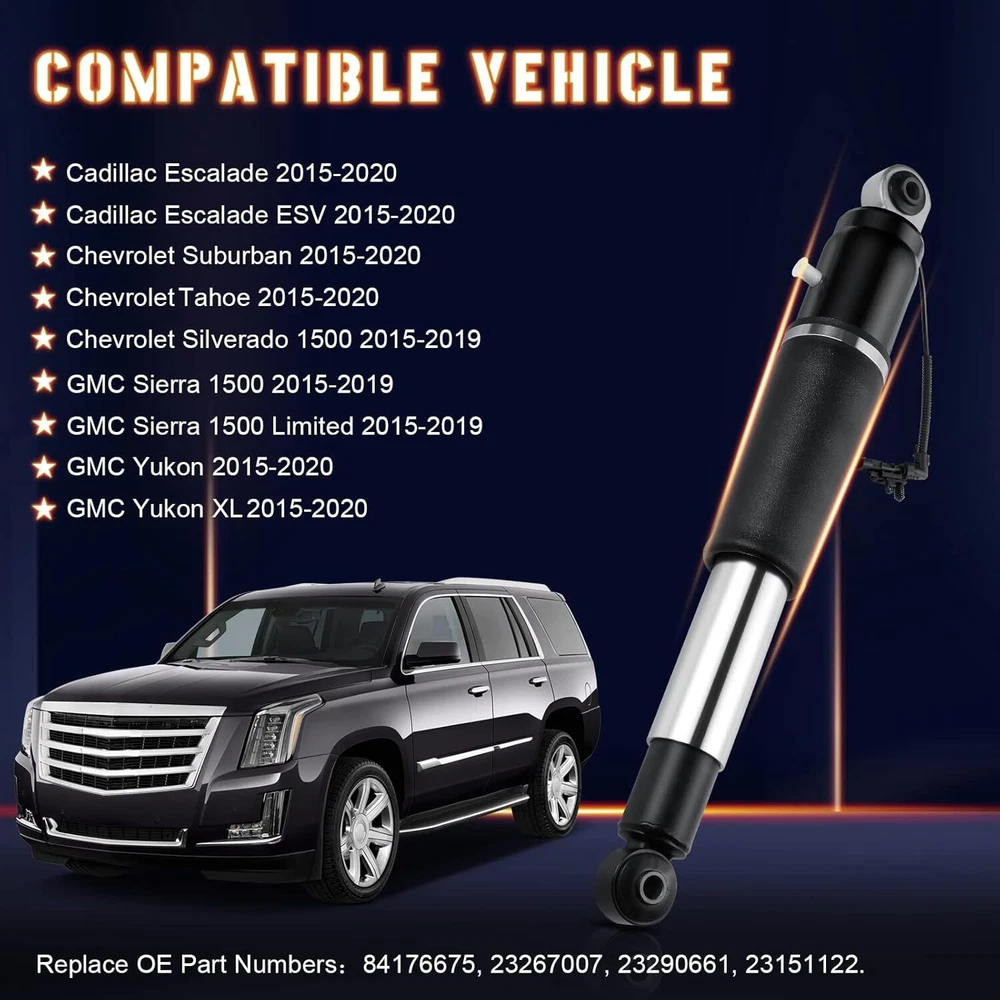 1 Pair Rear Air Shock Absorbers 84176675 for 15-20 Escalade Suburban Tahoe Yukon Autoparts-Accs Introduction: Autoparts-Accs has been providing the quality products in automotive parts & accessories for years. Being a professional e-Bayer that provides you guys the greater shopping experiences is out mission. Product 100% Brand New Product, Quality Ensured, Provide You the Best Confident and Support! 90 Days Warranty, Money Back Guarantee, No Risk, No Hassle! Shipping Free Shipping. Handling time: 1 Business day. Item is shipped to ebay address.Leaving correct.address can minimize delay. Tracking information. will be sent once item is shipped. Contact We have a friendly and dedicated support teams to handle any problems you come up with our products. Please contact us first via email or message for replacement, refund or technical problem caused by any reason. Description: Autoparts-Accs 1 Pair Rear Air Shock Absorbers for 2015-2020 Escalade Suburban Tahoe Yukon 84176675 👀【Replace OE Part Numbers】The Rear Air Shock Absorbers Replacement for 84176675, 23267007, 23290661, 23151122. The rear shock is factory-proven. The connector for the air line is as good as the OE shock fitting. 👀【Compatible Vehicle】This Air Shocks compatible with Cadillac Escalade 2015-2020,Cadillac Escalade ESV 2015-2020, Chevrolet Silverado 1500 2015-2019,Suburban 2015-2020,Tahoe 2015-2020,Sierra 1500 Limited 2015-2019,Yukon 2015-2020,Yukon XL 2015-2020. 👀【Superior Quality & High Performance】These rear air shock absorbers are with better toughness and stronger rigidity, featuring a superior tube and weld design to deliver structural integrity and durability. The outer pipe is made of high strength metal material with excellent welding process. Has good strength, seismic performance, will not bend. 👀【Package Includes】1 Pair Rear Air Suspension Shock Absorber Struts Replacement for Chevy Tahoe Suburban Cadillac Escalade ESV GMC Yukon XL 2015 2016 2017 2018 2019 2020. Please carefully compare the pictures or OE numbers to match your original parts before purchasing the product. 👀【Satisfactory Service And Guarantee】 Our air rear shock absorbers provide service support and friendly customer service throughout the year. 30 days-free return and re-fund are available if the air shock has quality issues. Timely replacement of aging rear shock is conducive to improving the ride comfort of the vehicle. Gives you a smooth ride again. Features: Consistent with the original standard specification: Adopt standardized design, unified manufacturing and quality control system to ensure the consistency of damping Improve comfort: Effectively absorb and damp shock impulses, improve ride comfort and extend the service life of related parts Long service life: Made with high-quality imported materials and advanced technology Enhance ride safety: Automatically adjust under different load conditions to maintain a constant height of the vehicle body and ensure driving safety Specifications: 100% Brand New Warranty :90 Day Free Return:30 Day Color:Black Type:Air Suspension Strut Placement on Vehicle:Front, Left, Right Fitment Type:Direct Replacement Features:Easy to Replace Part Number/OEM Number: 23151122, 23267007, 23290660, 580-1106 23290661, 84176675, 22283446, 22278958 Fitment 2015-2016 Cadillac Escalad/Escalade ESV Base, Luxury, Platinum, Premium 6.2L V8 - Flex, 6.2L V8 - Gas 2017-2020 Cadillac Escalade/Escalade ESV Base, Luxury, Platinum, Premium Luxury 6.2L V8 - Flex, 6.2L V8 - Gas 2015 Chevy Suburban LS, LT, LTZ 5.3L V8 - Flex 2016 Chevy Suburban LS, LT, LTZ 5.3L V8 - Flex, 5.3L V8 - Gas 2017-2018 Chevy Suburban LS, LT, Premier 5.3L V8 - Flex, 5.3L V8 - Gas 2019-2020 Chevy Suburban LS, LT, Premier 5.3L V8 - Flex, 5.3L V8 - Gas, 6.2L V8 - Flex, 6.2L V8 - Gas 2015 Chevy Tahoe LS, LT, LTZ, PPV, SSV5.3L V8 - Flex 2016 Chevy Tahoe LS, LT, LTZ, PPV, SSV5.3L V8 - Flex, 5.3L V8 - Gas 2017 Chevy Tahoe LS, LT, PPV, Premier, SSV5.3L V8 - Flex, 5.3L V8 - Gas 2018-2020 Chevy Tahoe Premier 5.3L V8 - Flex, 5.3L V8 - Gas, 6.2L V8 - Flex, 6.2L V8 - Gas 2015 GMC YukonDenali, SLE, SLT 5.3L V8 - Flex, 6.2L V8 - Flex, 6.2L V8 - Gas Packing List: 2*Rear Air Shocks ( as shown in the picture ) NOTE: (1) Items would be shipped within 24 hours with cleared payment(Exclude Weekend and Holidays) (2) Items wont be shipped to Puerto Rico(Please check your address before placing an order!) (3) Please allow 1-3mm differs due to manual measurement. Due to the different display and different light, the picture may not reflect the actual color of the item (4)It would be highly appreciated if you might contact us first once you have any problems concerning the items. And you can expect all the issues would be resolved ASAP! Payment Delivery details Terms of sales About us Contact us Payment 1.Payment must be received within 7 days after winning the item,UPI (Unpaid Item Case) will be filed automatically if buyers fail to make the payment in 7 days after item ends. 2.If you have difficulty paying for the item, please email us to cancel the order Delivery details 1.Items will be sent out in 48 hours on payment received from Monday to Friday. Orders during weekends and holidays will be posted in the following working day. 2.Please make sure your shipping address and the order information is correct before placing an order. We will not be responsible for item loss due to wrong or unknown address. Terms of sales 1.We accept 30 days return/refund guarantee 2.If the item you received is faulty, damaged or incorrect, or any further problems, you can return it for replacement or refund, please contact our customer service on eBay within 30 days from item received. 3.For damaged items on arrival, please contact us immediately, sending us an email with a photo is preferred. We will offer solutions to such cases. Full refund or replacement will be guaranteed. About us Welcome to Super Auto Parts Processing Plant! we have been providing the quality 