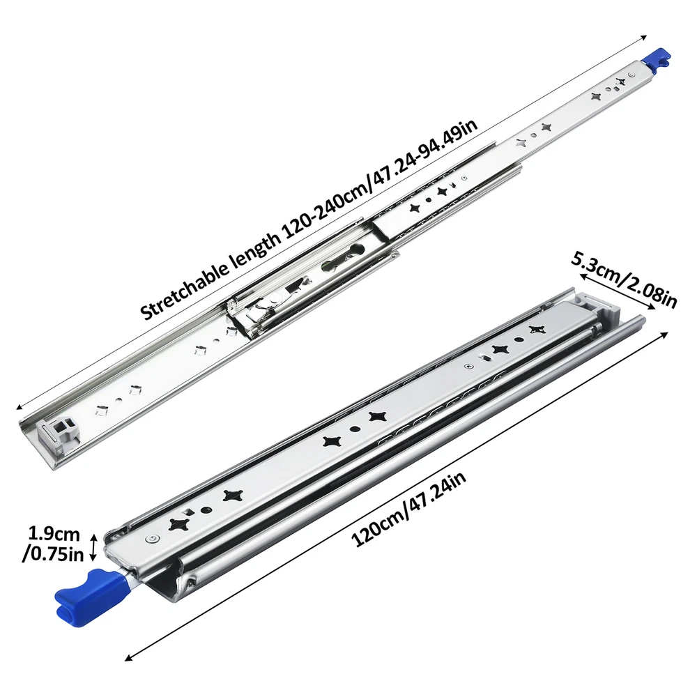 If you are interested in the product, pls send the zip code to us , then we will give you the best price !! Bullet Points: Maximize Storage: Unique three-section design with retractable sliding parts enhances drawer space utilization, ensuring smooth item storage with a robust 2.5mm thickness. Heavy-Duty Support: With cold-rolled steel and a rust-proof finish, our Cabinet Drawer Slides offer a strong structure that resists wear and damage. Boasting a load-bearing capacity of 120kg, they provide ideal support for heavier loads, making them a dependable choice for your storage needs. Silent Glide: Our Cabinet Drawer Slides boast a double lock system that secures drawers and prevents accidental movement. With a double-row steel ball arrangement, experience silent and seamless use while minimizing direct touch between channels for a more hygienic use. Easy to Install: Constructed for effortless installation, these cabinet drawer slides come pre-drilled for quick and easy assembly. Designed for side-mounted drawers, ensuring a 0.75-inch mounting distance between drawer and cabinet with the included hex socket screws. Extensive Application: Our Cabinet Drawer Slides offer versatile functionality, ideal for indoor furniture, RV drawers, and meeting varying needs in storage cabinets: from shoes to industrial items. Introducing our rust-proof Slides for Drawers with a unique design that reduces direct touch between channels. With a 0.75-inch mounting distance between drawer and cabinet, these slides are perfect for use in storage cabinets, shoe cabinets, and industrial cabinets. Don't settle for ordinary slides when you can own our unique design slides. Specifications: Product name: Slides for Drawers Product size: about 80cm(31.5 inches)/ 90cm(35.43 inches)/100cm(39.37 inches)/120cm(47.24 inches) Maximum load: 120 kg Color: Silver Lockable: yes Width: 53mm Material: cold rolled steel Packing List: Slide rails*2 Locks*2 Screws*1 bag Shipping Policy 1. We ship to your eBay adress. Each package will be shipped by Royal mail without tracking number. 2. Please check your shipping address carefully before checkout, it can't be changed if order completed. 3. Ship within 1 business day once payment completed. Orders placed on weekend will be shipped within 2 days. Seriously promise: Refund or resend will be offered if item still not arrive in 8 business days. Just send us an email ,we will give you a satisfied solution as soon as possible. Payment 1.We accept PayPal only. 2.NOTE: Payment should be sent within 4 (FOUR) days of auction closing. Or unpaid dispute will be filed for closing auction. Please contact us if you have any questions of payment procedures Returns Policy 1. Customer satisfaction is our top goal. We believe our items are so outstanding. All products are quality checked. They are new and in good condition when shipped to our customers. We are convinced you will be happy with your Purchase. 2. If product is defective or damage upon arrival, or wrong product shipped, please contact us immediately. Returns accepted within 30 days of delivery date and item must be in original new condition, not worn or altered in any way with attached tags & wrap. Otherwise deal is final. Return shipping must be paid by buyer. 3. Please contact us first if you have any problems/questions/concerns. We will be happy to resolve any issues you may have in a cordial and friendly manner. Work Time Our working time: Monday- Saturday 9:00A.M-12:00A.M 13:30P.M-6:00P.M Feedback You will receive our positive feedback as soon as you pay for your item. Your better comments will be an encouragement for us to offer the better quality and the better service in future. If you are not satisfied with them, please contact us first via Ask a Question or via Contact Seller. Your messages will be answered within 1-2 business day. We shall try our best to solve your problem to your satisfaction.