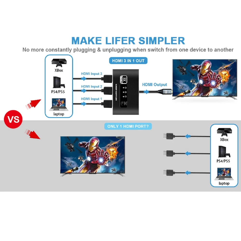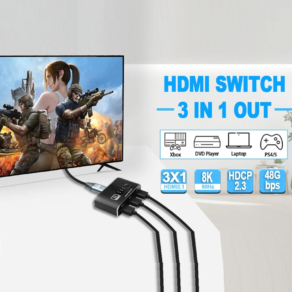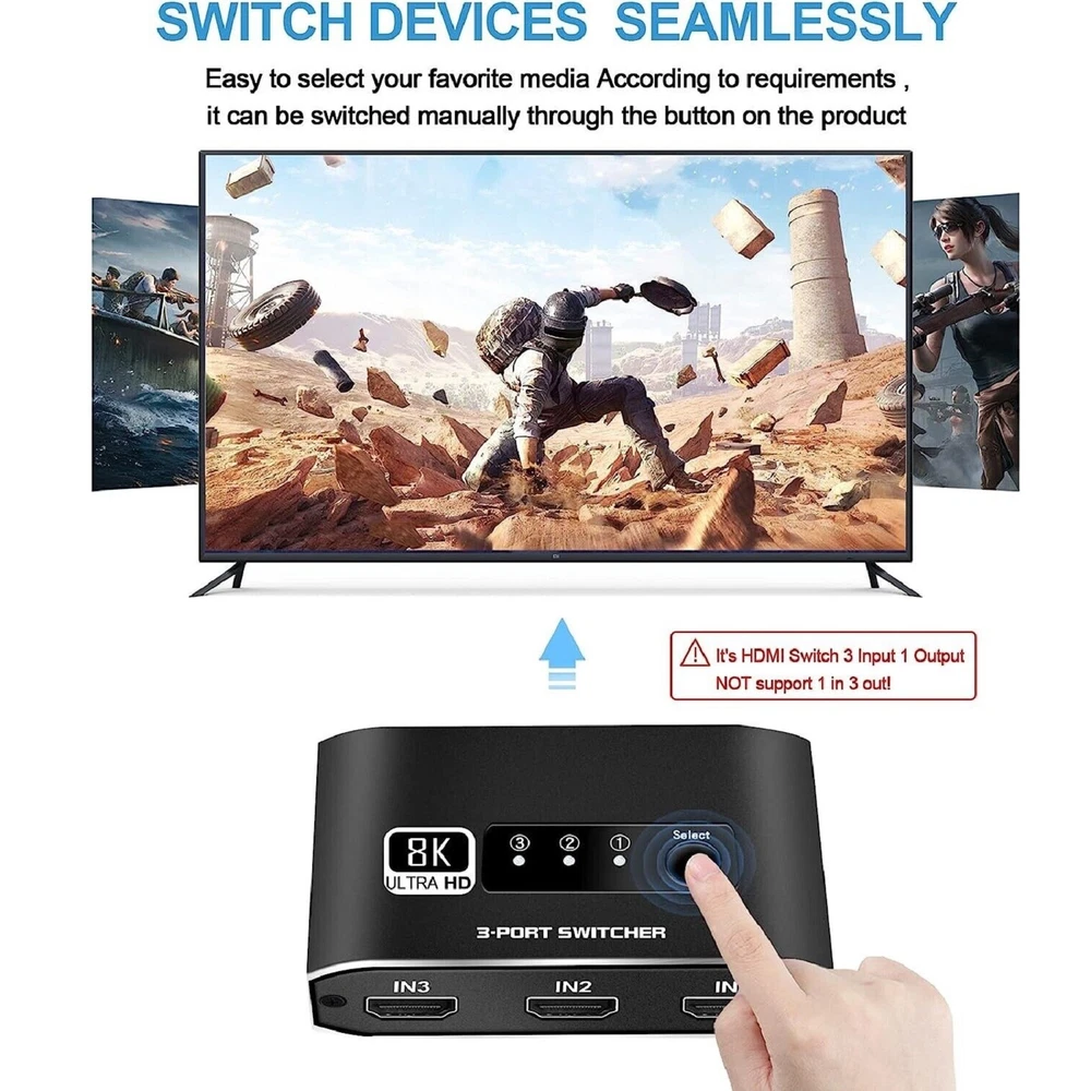 You may also like 60pcs Dial Feet Stickers Watch Movement Repairment Spare Parts Watchmaker Tool g 20.99 USD Free shipping 16Sides Optical Fiber For Fujikura CT06 CT20 CT30 CT05 Fiber Cleaver Blade Cut C 12.99 USD Free shipping A380 Qantas Australian Civil Airliner Aircraft Plane Aviation Model With Stand j 12.99 USD Free shipping HPA1820 Battery Adapter For Black & Decker 20V Li-ion To 18V NiCad & NiMh Tool q 18.99 USD Free shipping 1/24 15cm WWII German Army For BMW R75 1939-1945 Motorcycle Finished Model Toy 28.99 USD Free shipping 4Pcs/Lot Universal Ceiling Fan Light Wall light Replacement Pull Chain Switch 11.39 USD Free shipping Product Description 1 Pcs 3x1 HDMI Switcher With 8K HDMI Cable HDMI Switcher Support HDCP2.3 HDR10 A Specifications: HDMI Version: HDMI2.1, HDCP2.3 HDMI Resolution up to 8K60Hz Supports resolution: 4K@120Hz,1080P@240Hz etc. Support Video Format: 12 bit deep color Support Audio Format: DTS-HD/Dolby Max Bandwidth: 600MHZ Max Baud Rate: 48Gbps Color: Black Features: 1. 8K HDMI 2.1 Switch 3x1: Made of premium Aluminum alloy material,can resist overheat or break.The HDMI switcher 3 in 1 out easily shares video from 3 different HDMI source to 1 HDMI display, Release you from the plugging and unplugging HDMI cables, easily enjoy work time and playtime via switching between 3 devices with one button 2. Crystal Clear 8K Ultra HD: This 3 port HDMI selector support 8K@60Hz, 4K@120Hz, 1080P@240Hz, VRR, HDCP 2.3, HDR10 and Dolby Vision.Brings you smoother, more responsive gameplay experience with a sharper and more realistic picture (Note: For 8K resolution,the length of the HDMI cables connected to both ends of the switch should not exceed 1.5m/5ft respectively) 3. Wide compatibility: HDMI switch 3 ports are compatible with all HDMI 2.1 devices. Input: For PS5, For PS4, For Roku, For Fire TV, For Blu ray, For DVD, For Xbox 360, For Xbox One, For Beamer, Fit For Apple TV laptop. Output: high-definition TV, projector, monitor 4. Plug and Play: No additional power is required, and the 8K HDMI switch box automatically obtains power from the source device through the HDMI port. (Note: Please maintain the power supply of 2-3 input sources.) This HDMI switch has a button switching function, and you can press the button to change the input source you want to use Product List: 1x 3x1 HDMI Switcher 1x 8K HDMI Cable 1x User manual Note: This is HDMI Switch 3 in 1 out , NOT support 1 in 3 out! Shipping Contact Us We ship most of our orders within 24 hours, and may up to 48 hours from US Warehouse. In 2-5 working days, you will receive your items. Sometimes due to problems with our transportation company system, your shipping information may be delayed to update. We recommend that you try again after 3-4 days. If you still haven't checked the shipping information, you can contact us by ebay message. If you have any questions, our Customer Service staffs welcome you to email us. We strive to answer all questions and resolve any problems as quickly as possible. You can contact us 7*24, we will reply at the first time, and we will surely solve your problems. Note: 1.We try our best to reply to your emails as soon as possible, however, due to high volume of daily incoming emails and time zone difference, we may not be able to reply your emails immediately. Please allow 1 business days for us to response. If you do not receive any reply from us, please check your email ensuring your mailbox has not reached full size. 2.Due to some ISP SPAM filter settings, you may not be able to receive our replies; if you have problems receiving our emails, you may need to use a different email account to contact us. 3.Please give us the opportunity to resolve any problem. We understand the concerns and frustrations you might have, and will try our best to resolve the issues. Please email us before leaving any negative feedback or open any dispute on PayPal. 4.We care about our valued customers, and will always try to help you. So if you have any problems, please e-mail us immediately. Shipping We ship most of our orders within 24 hours, and may up to 48 hours from US Warehouse. In 2-5 working days, you will receive your items. Sometimes due to problems with our transportation company system, your shipping information may be delayed to update. We recommend that you try again after 3-4 days. If you still haven't checked the shipping information, you can contact us by ebay message. Contact Us If you have any questions, our Customer Service staffs welcome you to email us. We strive to answer all questions and resolve any problems as quickly as possible. You can contact us 7*24, we will reply at the first time, and we will surely solve your problems. Note: 1.We try our best to reply to your emails as soon as possible, however, due to high volume of daily incoming emails and time zone difference, we may not be able to reply your emails immediately. Please allow 1 business days for us to response. If you do not receive any reply from us, please check your email ensuring your mailbox has not reached full size. 2.Due to some ISP SPAM filter settings, you may not be able to receive our replies; if you have problems receiving our emails, you may need to use a different email account to contact us. 3.Please give us the opportunity to resolve any problem. We understand the concerns and frustrations you might have, and will try our best to resolve the issues. Please email us before leaving any negative feedback or open any dispute on PayPal. 4.We care about our valued customers, and will always try to help you. So if you have any problems, please e-mail us immediately. powered by Metal Screwdriver Hobby Hardware Philip Flat Kit For RC Car Drone Plane Hex F 19.99 USD Free shipping Memory Foam S M L Eartips Buds with Filters For Airpods Pro Headphones Earbuds f 17.99 USD Free shipping Stable Motorcycle Helmet Chin Mount Holder For GoPro Hero 8/7/6/5 Black Camera a 10.99 USD Free shipping DIY Unassemble 1:24 German V1