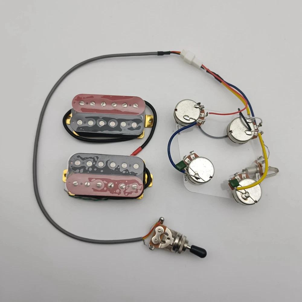 Product Introduction: Item Model :Custom Black Red Humbucker Pickups Magnet:Classic Ceramics Magnets Scope of use :Suitable for gibson epiphone electric guitars DC Resistance (approx.) : Neck 7.69 K ; Bridge: 15.15 K (K resistance is for reference only, which will change as the temperature changes.) Wiring Harness: 2 × A500K Pots; 2 × B500K Pots 1 × Epiphone Outer Jack 1 × Epiphone 3 Way Switch Weight :350g / set Cable: 4C Braided Shield for humbucker pickup Accessories: Springs+ Screws Wiring Harness include: 2 × A500K Pots 2 × B500K Pots 1 × Epiphone Outer Jack 1 × Epiphone 3 Way Switch Note: Transparent plate not included in the wiring when shipped