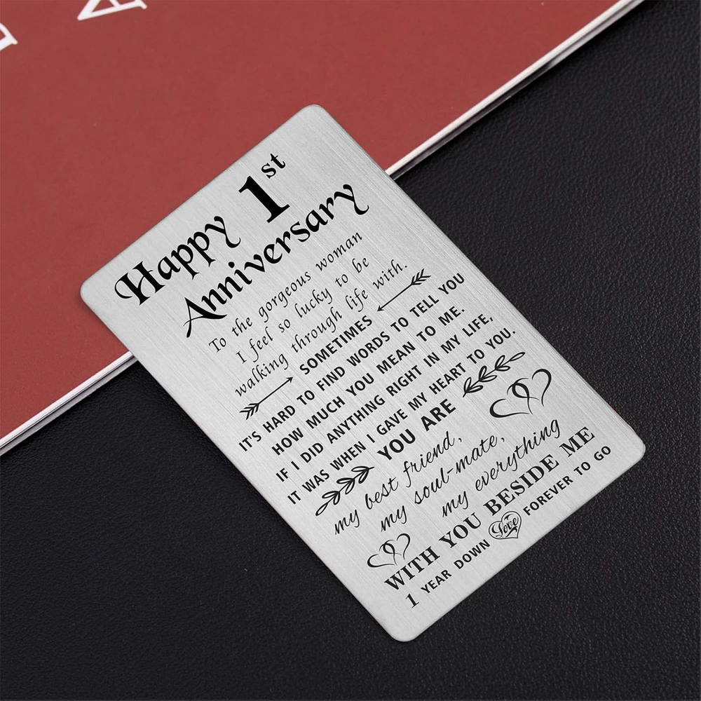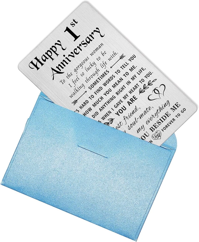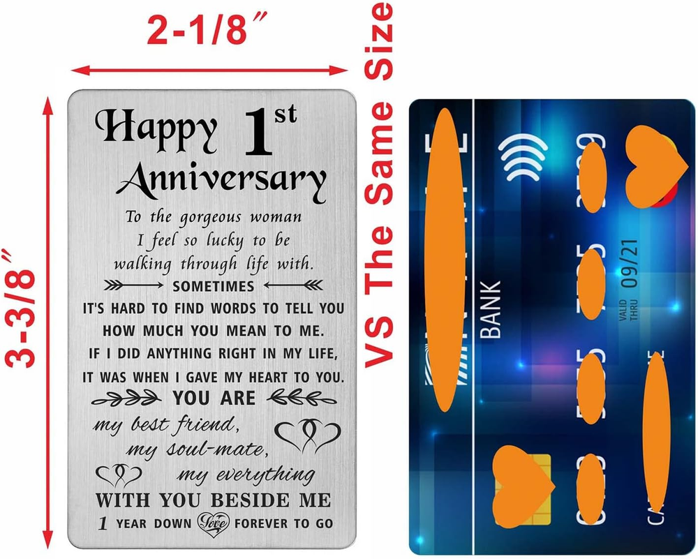 Store New Arrivals Add to Favorite View Feedback Contact Fast deliveries to the customer's home Quality customer service John Make the customers happy! 1 Year Anniversary Card Gifts for Girlfriend Wife, Happy First 1St Wedding Anniversary Cards for Women Her, Engraved Metal Wallet Insert Description 1 Year Anniversary Gifts for Her - Celebrate her with romantic 1st anniversary greeting cards, engraved with permanent love notes, could be keep for a life time. Best first one yr anniversary gifts for girlfriend women wife Engraved Metal Wallet Card - Made with Stainless steel, laser engraved keepsake, cute and lightweight, will not tarnish or change color, will not easy bend within wallet Credit Card Size - Approximately credit card size 3.38"x2.13"x0.03", fits perfectly in any wallet, could always be with your love Happy 1st Anniversary Card for Women - To the gorgeous woman I feel so lucky to be walking through life with. Sometimes it's hard to find words to tell you how much you mean to me. If I did anything right in my life, It was when I gave my heart to you. You are my best friend, my soul mate, my everything. WITH YOU BESIDE ME. 1 year down love forever to go Happy 1 Year Anniversary for Wife- Packaged with a nice blue paper envelope, sweet and ready for gifts giving Happy 1st Anniversary Card for Her Wife - To the gorgeous woman I feel so lucky to be walking through life with. Sometimes it's hard to find words to tell you how much you mean to me. If I did anything right in my life, It was when I gave my heart to you. You are my best friend, my soul mate, my everything. WITH YOU BESIDE ME. 1 year down love forever to go Item model number TW3001 Style 1st Anniversary for Her Number of Items 1 Color Silver Manufacturer Part Number TW3001 Item Weight 2.89 ounces Pre-printed happy 1st anniversary Product Dimensions 3.38 x 2.13 x 0.04 inches Size Credit Card Size ABOUT US We offer the best prices around on high quality products. Our E-store includes media such as books, movies, music and games while offering electronics, toys, sporting apparel, clothing, tools, general home, garden items and more. SHIPPING We are always working hard to ensure your package arrives as soon as possible. Please understand that some factors like weather, high postal traffic, and the performance of shipping companies are outside of our control. We offer free shipping to the lower 48 states and ship within 2 business days of payment, usually sooner. We do not accept P.O. Boxes. Please provide a physical address. For shipping outside of the continental USA, we only use eBay's Global Shipping Program. The item is shipped to KY and then sent to the rest of the world. International customers are responsible for all duties and taxes. Continue to 'check out' to calculate costs for shipping the item to your country. Messages regarding eBay's Global Shipping Program MUST be directed at eBay EXCLUSIVELY. RETURNS We offer a 30-Day Return Policy on items in which you are not completely satisfied with. You have the option of a full-refund or an exchange of the item. No returns are available on items shipped outside of the USA PAYMENT We accept PayPal. CONTACT US This page content is yet to come Please ad us to your favorite seller and visit again later Thank You CUSTOMER SATISFACTION We try our very best to make sure every customer is completely satisfied. If there's a problem, message us! We're happy to help. WE ACCEPT
