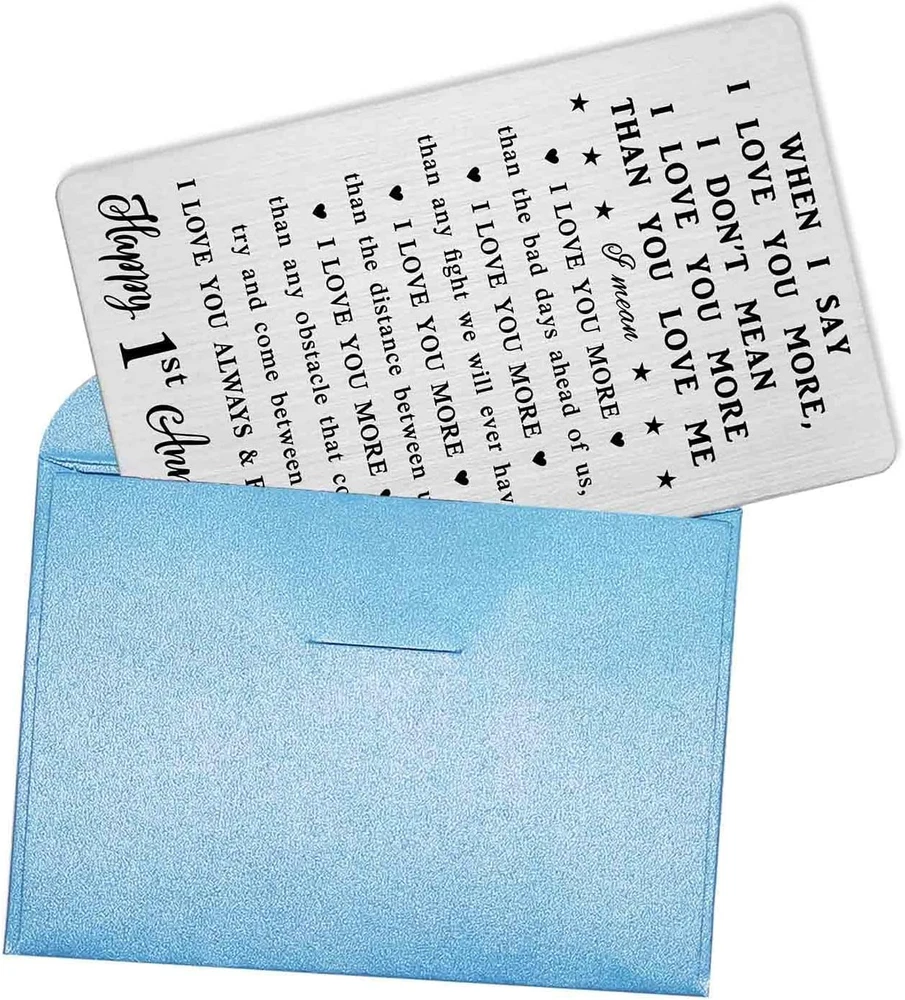 Happy 1st Anniversary Wallet Card Gifts - When I say I love you more, I don't mean I love you more than you love me. I mean I love you more than the bad days ahead of us, I love you more than any fight we will ever have, I love you more than the distance between us, I love you more than any obstacle that could try and come between us, I love you always forever, Happy 1st anniversary! 1 Year Anniversary Card Gifts- 1 year anniversary gifts for boyfriend, 1st wedding anniversary card, 1 year anniversary gifts for husband, best anniversary wallet card for husband wife fiancé fiancee One Year Wedding Anniversary Gift Ideas - The engraved wallet card awesome and simple, was a nice wedding anniversary gift that fits in a wallet for him or her to carry around. When your dear open the wallet, will feel your love everywhere with you Engraved Steel Wallet Cards Inserts - The romantic anniversary keepsake is Made with Stainless Steel, permanent laser engraved, will not tarnish or change color, not easy bend, could be keep for a lifetime Fits Perfectly In Wallet - Approximately credit card size 3.38"x2.13"x0.03", sturdy and lightweight, easy to put in any wallet. Packaged with free blue gift envelope, timeless romantic anniversary gifts, beautiful and ready for gift giving Product Description When I say I love you more, I don't mean I love you more than you love me. I mean I love you more than the bad days ahead of us, I love you more than any fight we will ever have, I love you more than the distance between us, I love you more than any obstacle that could try and come between us, I love you always forever, Happy anniversary! Fits Perfectly In Wallet The engraved wallet card awesome and simple, was a nice wedding anniversary gift that fits in a wallet for him or her to carry around. When your dear open the wallet, will feel your love everywhere with you One-sided engraving The beautiful engraved wallet card is one-sided engraving, engraved some love message. Another sided no engraved, you can writing some message what you want. for example, you can writing her/ him name or date The same size as credit card Approximately credit card size 3.38"x2.13"x0.03" The romantic anniversary keepsake is Made with Stainless Steel Permanent laser engraved, will not tarnish or change color, not easy bend, could be keep for a lifetime Happy anniversary wallet card Packaged with free blue gift envelope, timeless romantic anniversary gifts, beautiful and ready for gift giving