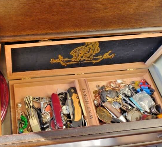 $ 42.22JUNK DRAWER LOT___USA OLD COINS, 1943 Cent_JEWELRY VINTAGE_Stamps_TURQUOISE_$2
